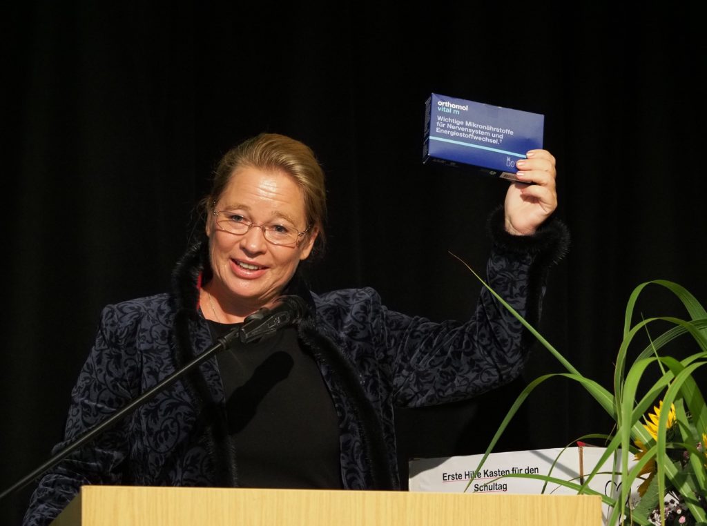 Einen Erste-Hilfe-Kasten für den Schultag brachte Schulelternbeiratsmitglied Constanze Tietz als Geschenk für Herrn Rother mit. Charmant präsentierte und erläuterte die Apothekerin dessen Inhalt: Mikronährstoffe für gute Nerven, ein Mittel für freie Gehörgänge, damit unser Schulleiter stets ein offenes Ohr für Anliegen der Eltern habe, ein Brillenputztuch für den Durchblick, einen Ball zum Kneten für den Stressabbau und Süßigkeiten, um die Lehrkräfte zu motivieren… Ihr Geschenk sorgte für Heiterkeit unter den Anwesenden.