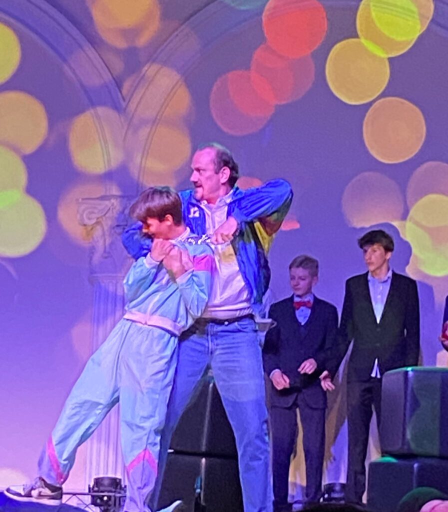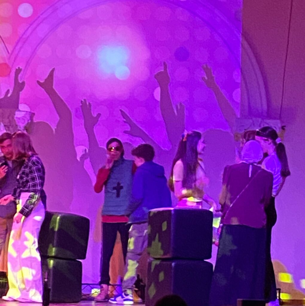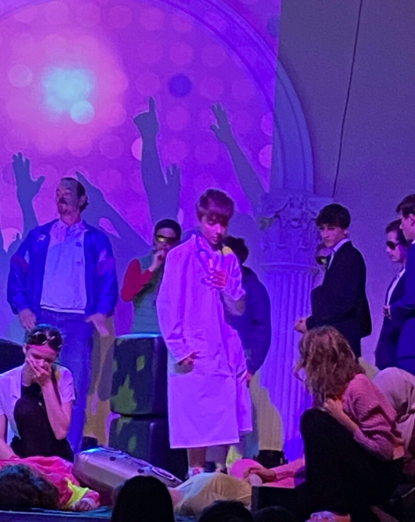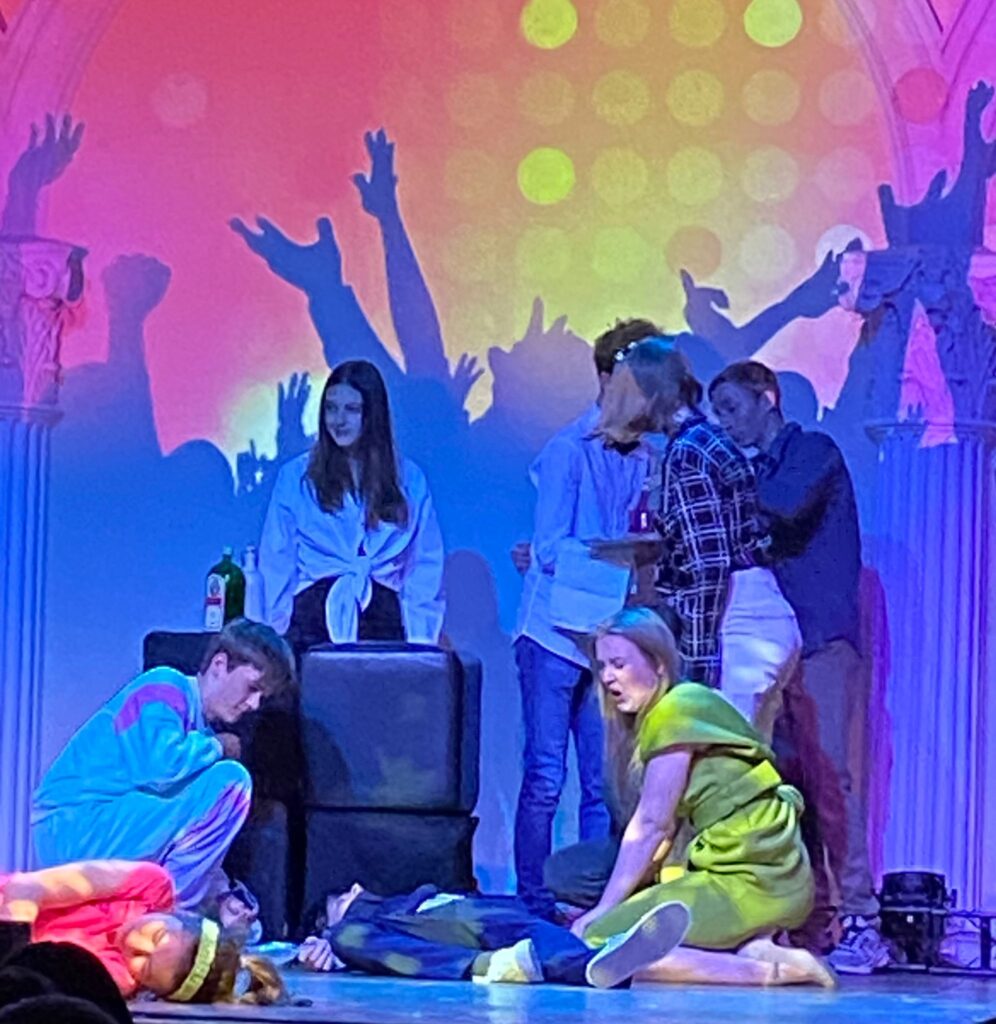 Unsere Oper “Mord im Dunkeln” handelt von einem Mörder, der auf einer 80er-Jahre-Party viele Leute tötet. Wegen der vielen Toten versucht ein Detektiv den Mörder ausfindig zu machen.