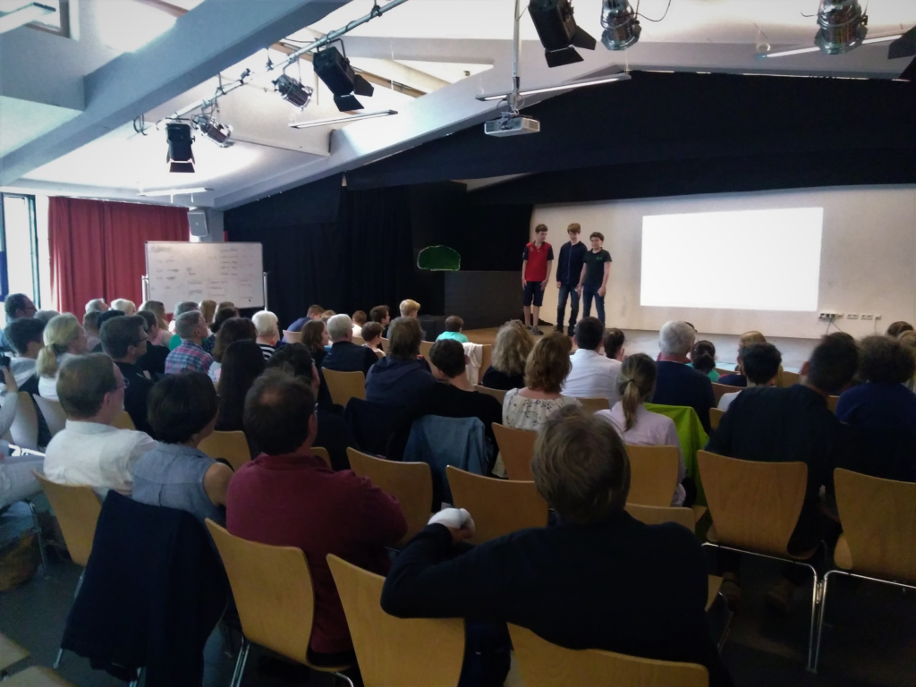 In einem Filmabend haben die Schülerinnen und Schüler der 7b die fertigen Produkte ihrer Projektarbeit aus dem Englischunterricht präsentiert. Aufgabe war es, innerhalb von sechs Wochen einen Kurzfilm zu einem frei gewählten Genre zu entsinnen, zu drehen und zu schneiden. Das Schwierige an der Aufgabe – die Filme mussten komplett in der Fachsprache Englisch gedreht werden. Die 27 Schülerinnen und Schüler der Klasse waren mit viel Elan und Motivation bei der Sache und die fertigen Filme, die am Donnerstagabend vor den Eltern und einigen Lehrern der Klasse präsentiert wurden, konnten sich sehen lassen.