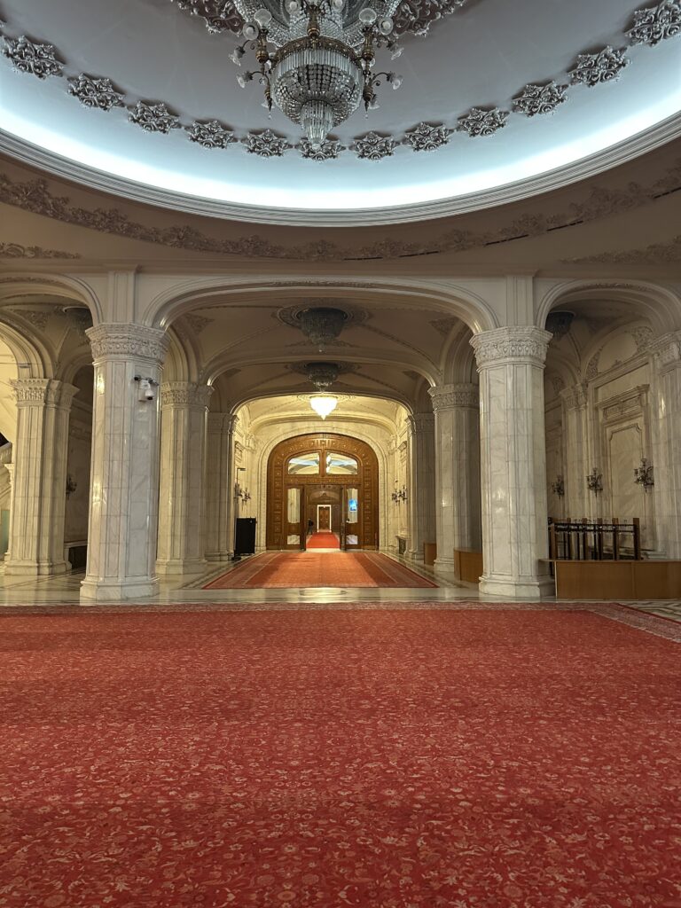 Am Montag, dem letzten Konferenztag, fand die General Assembly Session statt. Hier wurde jeweils eine fertige Resolution pro Komitee noch einmal diskutiert und abgestimmt. Da wir bis zum Abend Zeit hatten, nutzten wir die Gelegenheit für einen Besuch des Präsidentenpalasts, dem zweitgrößten und schwersten Verwaltungsgebäude der Welt. Der Präsidentenpalast geht auf die Zeit des Diktators Nicolae Ceaușescu zurück. Er ließ das Gebäude in den 1980er-Jahren als „Haus des Volkes“ errichten – ein gigantisches Symbol seiner Macht. Heute dient es als Sitz des rumänischen Parlaments und ist eines der größten Verwaltungsgebäude der Welt.