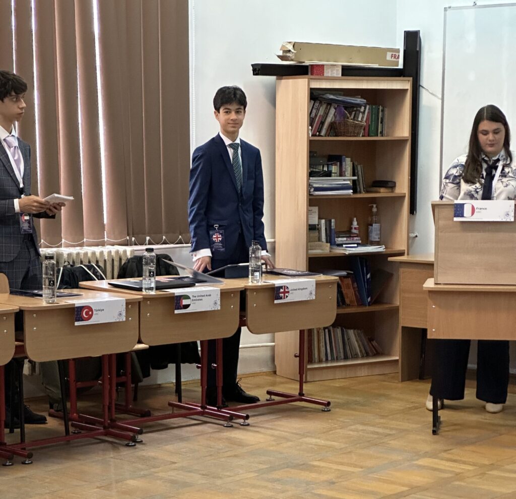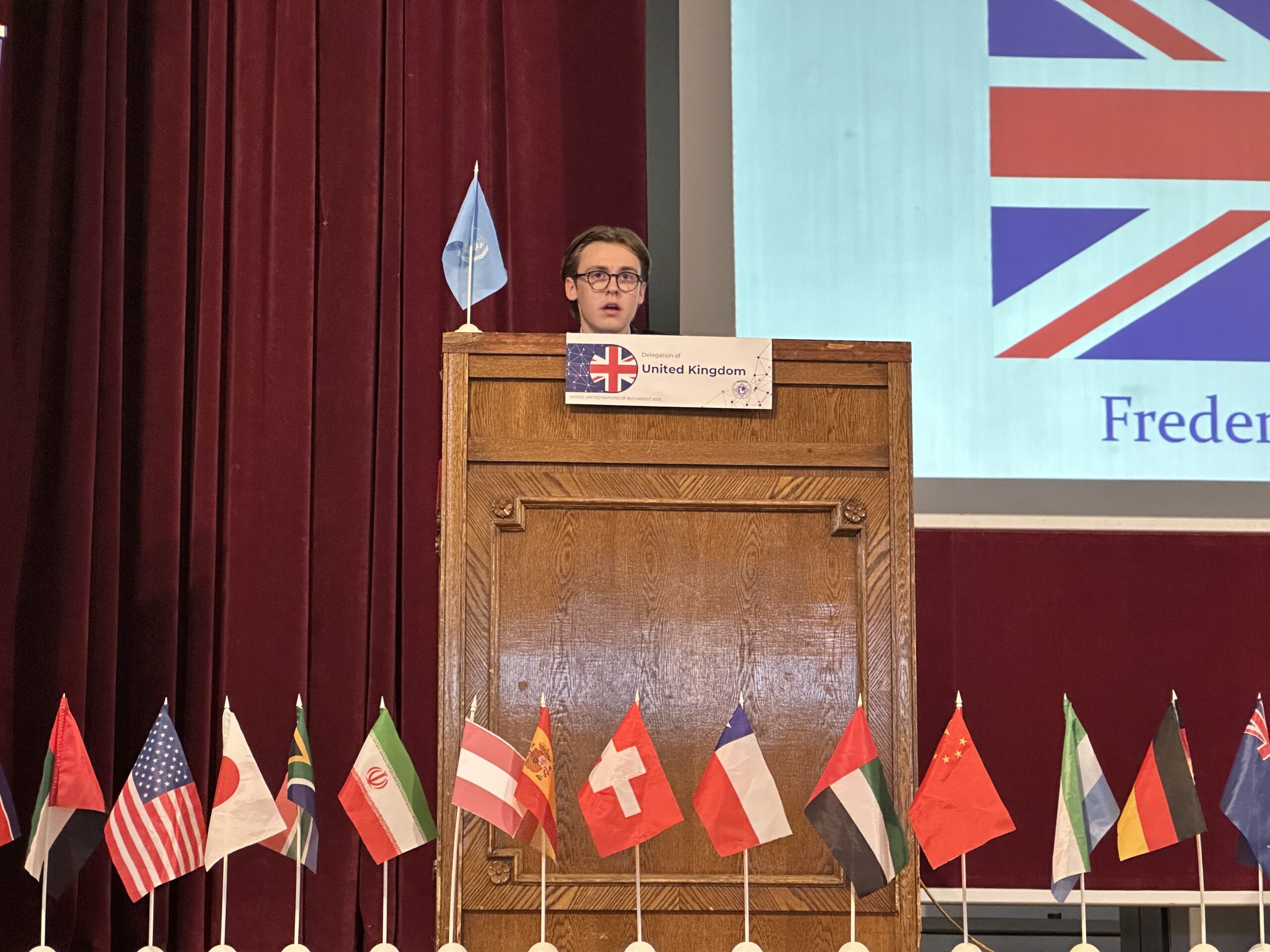 Am Donnerstag begann dann offiziell die MUN-Konferenz mit der feierlichen Eröffnung in der großen Aula des Mihai-Viteazul-National-College. Nach der Vorstellung der Secretaries General und der Präsidentschaft hörten wir verschiedene Redebeiträge – unter anderem von ehemaligen MUN-Teilnehmer:innen und Vertreter:innen mehrerer Botschaften. Ihre Geschichten über politisches Engagement und ihre eigenen Anfänge als junge, interessierte Menschen waren nicht nur inspirierend, sondern machten auch deutlich, welches Potenzial in dieser Konferenz steckt. Anschließend hielt jede Delegation eine Opening Speech, in der die grundlegende Position des jeweiligen Landes dargelegt und Fragen beantwortet wurden. Unsere Delegation vertrat in diesem Jahr das United Kingdom.