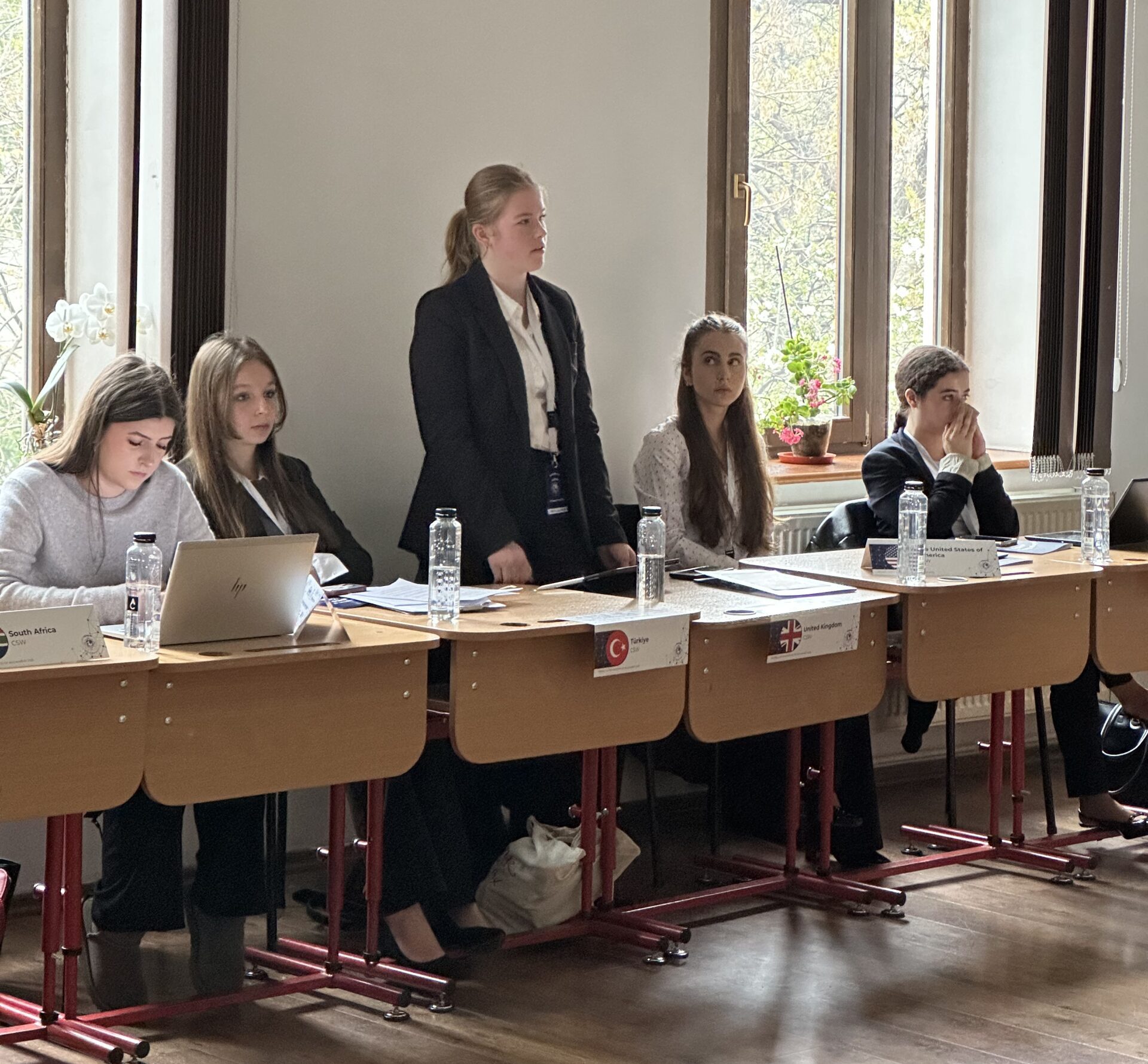Der Freitag stand ganz im Zeichen der inhaltlichen Arbeit. Für viele war es die erste richtige MUN-Debatte – entsprechend war die Aufregung groß. Jede Delegation stellte ihre Position zum Thema vor, anschließend wurden Fragen gestellt und beantwortet. Da rund 25 Länder pro Komitee vertreten waren, dauerte dieser Teil den ganzen Tag.