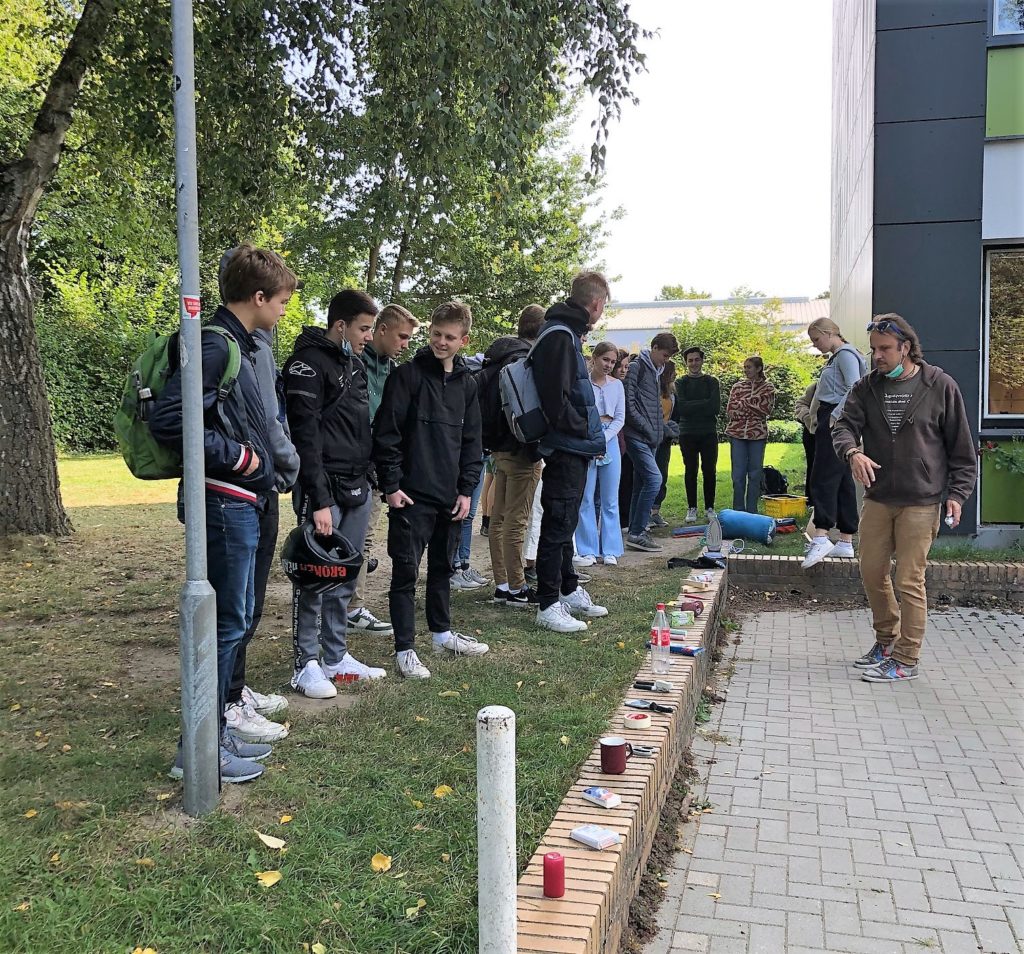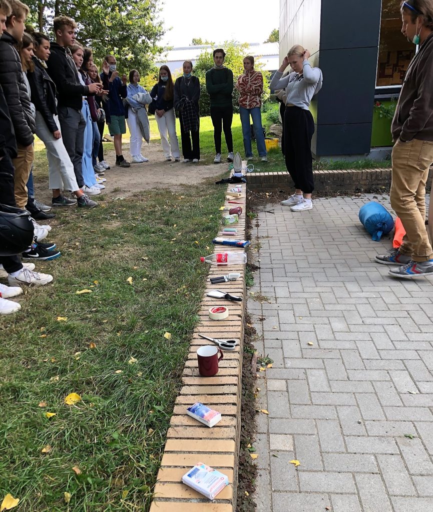 Herr Blankenstein hatte zahlreiche Gegenstände aufgereiht, aus denen wir auswählen sollten. Schnell waren wir uns einig, dass ein Schlafsack Wärme spendet , wenn man im Freien übernachten muss. Ein Zelt schützt vor neugierigen Blicken und Umwelteinflüssen. Das Messer stellt ein Universalwerkzeug dar und Pappe mindert die Kälte, die vom Boden aufsteigt. Aber was fängt man mit einer leeren Plastikflasche und einer Packung Spaghetti an ohne Herd? Wir lernten, dass sich mit einer Wasser gefüllten Flasche Nudeln kochen lassen, wenn man sie in die Glut stellt. Wie sieht es aus mit Pflaster, Dosenöffner, Taschenspiegel und Kerze? Wenn man auf der Straße lebt, trägt man seinen Besitz mit sich herum und muss sich auf das Existenzielle beschränken.