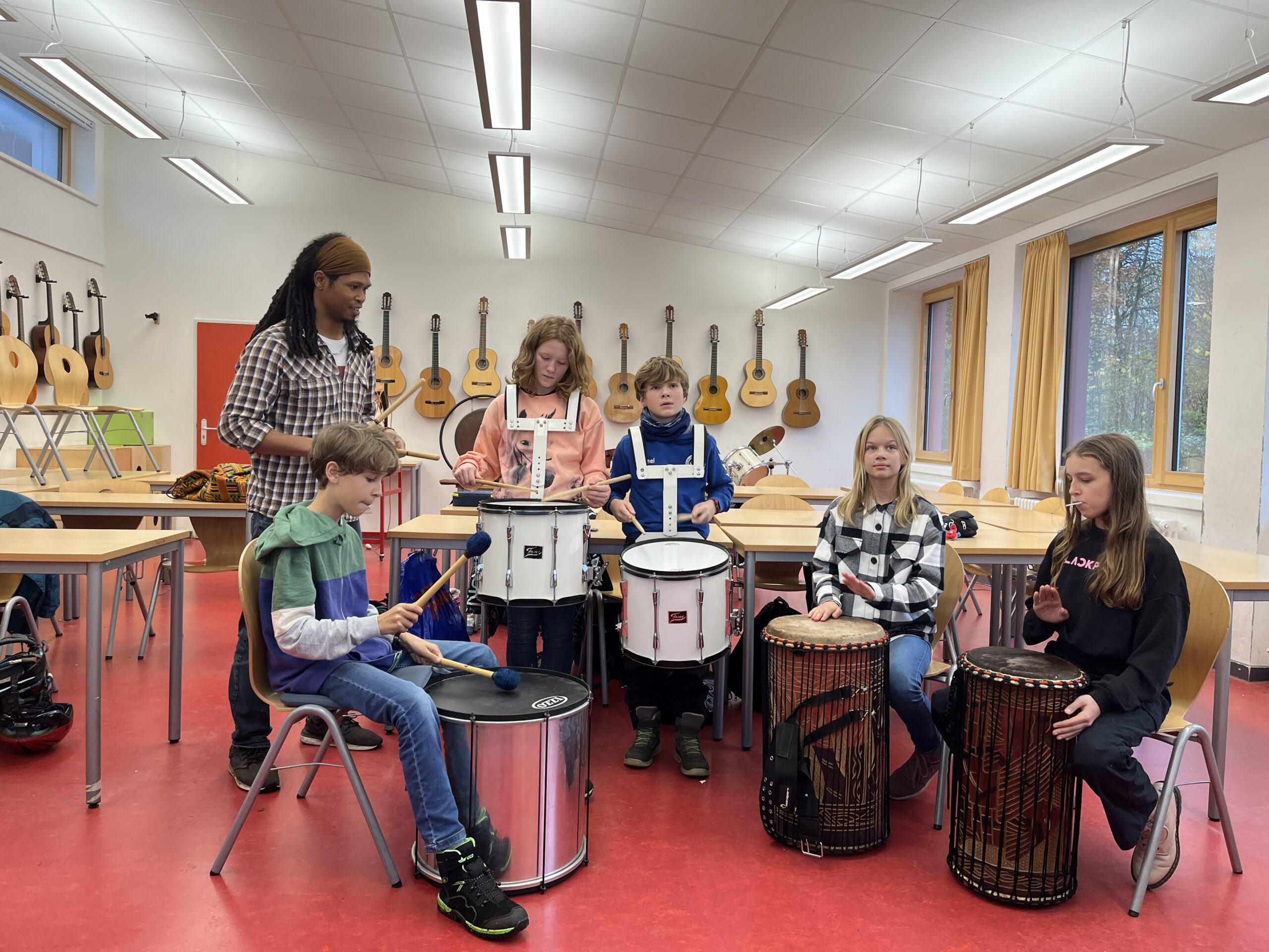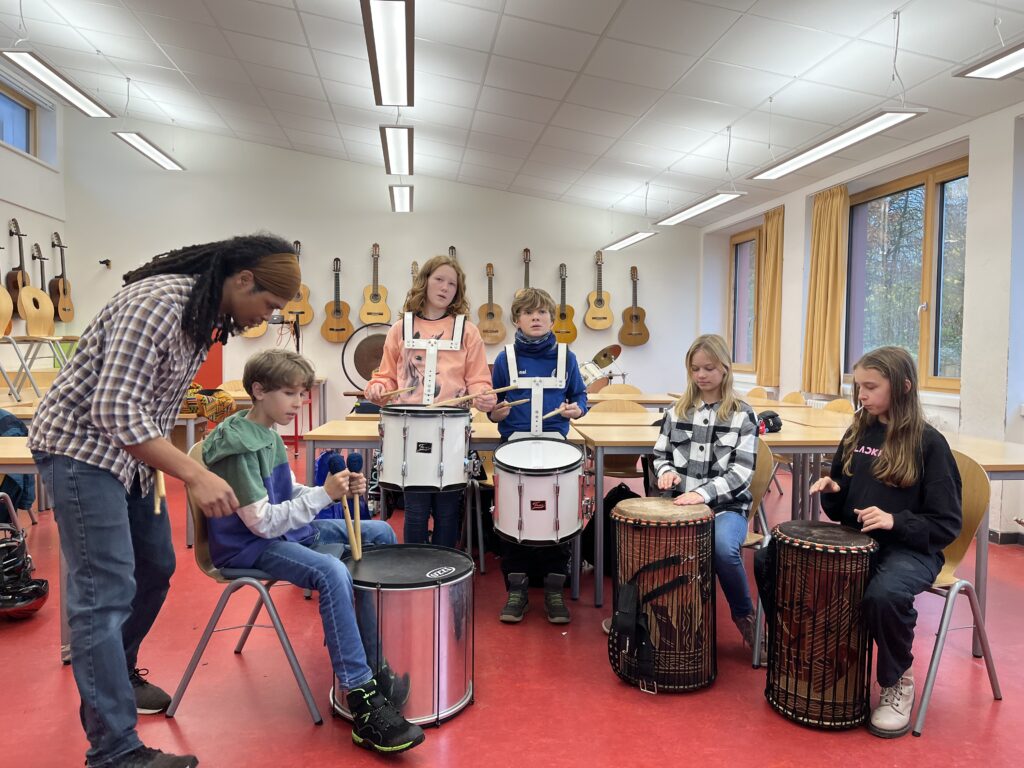 Am 20. November gab uns die Percussion-AG einen kleinen Eindruck von ihrer Probenarbeit, die immer montags nach der 6. Stunde stattfindet. Das Besondere dabei ist, dass in dieser AG auch die Englischkenntnisse der Kinder gefördert werden. Josh Batson, der Leiter der AG, ist ein sogenannter Native Speaker, d.h. Englisch ist seine Muttersprache. Er spricht Englisch und Deutsch mit den Kindern und kommt extra an unsere Schule, um Interessierten das Percussionspielen beizubringen.