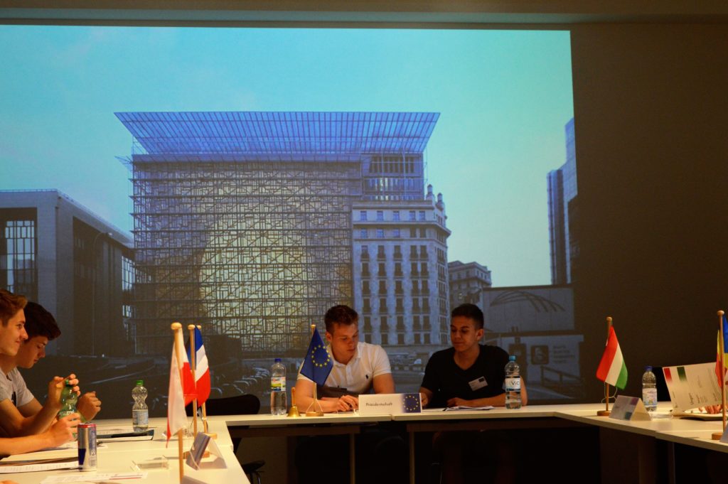 Nachdem alle „Regierungschefs“ ihre Ziele formuliert und Argumente ausgearbeitet hatten, ging es los: Die „EU-Ratspräsidenten“ Jan und Justin eröffneten die Sitzung und bemühten sich, trotz aller Differenzen, die z.B. zwischen Ungarn, vertreten von Aylin und Sebastiaan, und Polen ( Ömer) auf der einen und Deutschland ( Kyle und Julian) und Frankreich ( Henrik) auf der anderen Seite bestanden, einen Konsens herzustellen.