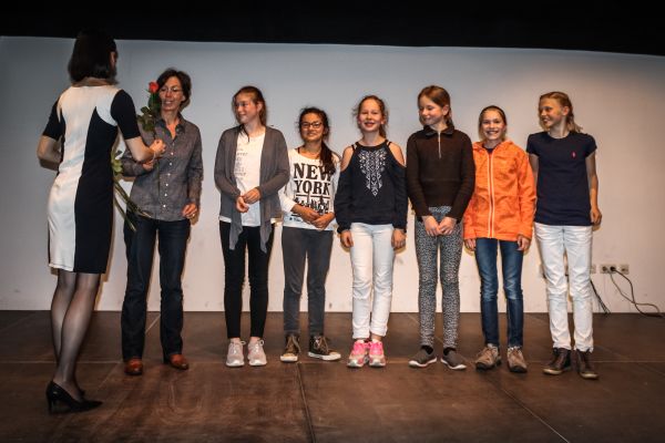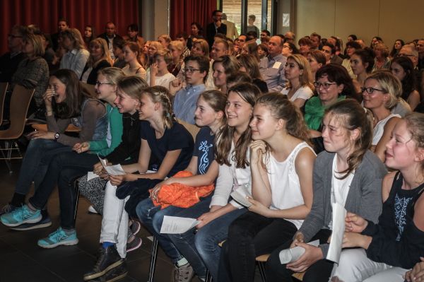 Nicht zuletzt gibt es zwei Anerkennungspreise für eine weitere Gruppe aus der 6d wie auch für eine Gruppe aus der 8b. Nachdem zuletzt auch noch der besondere Preis, eine kurze Reise nach London an eine Gruppe vom Werner-Heisenberg-Gymnasium Heide übergeben worden ist, sind alle Gäste zu einem kleinen Umtrunk in die Cafeteria eingeladen, wo unter der Leitung von Herrn Salomon die Percussion AG das westafrikanische Stück Lolo präsentiert.