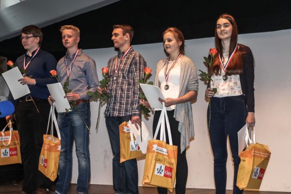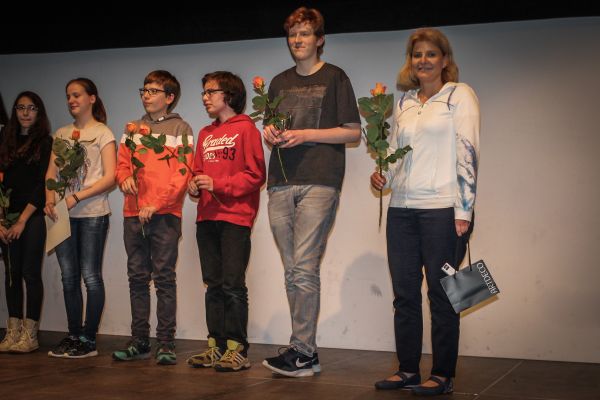 Die anschließende Preisverleihung bildet den Kern der Veranstaltung. Nacheinander werden alle Preisträger des Landes Schleswig-Holstein auf die Bühne gebeten und erhalten dort ihre Auszeichnungen und Preise, die unter anderen der Klettverlag, vertreten durch Herrn Behrmann, gestiftet hat. In diesem Zusammenhang ist zu erwähnen, dass auch drei Schüler der TMS unter den Preisträgern im Einzelwettbewerb sind. Lisa, die zur Zeit in Frankreich ist und daher nicht teilnehmen kann, sowie ihre Mitschülerin (beide Klasse 8) erhalten einen dritten Landespreis für ihre Ergebnisse in der englischen Sprache. Johannes (Klasse 9) erhält einen zweiten Landespreis für seine Ergebnisse in der lateinischen Sprache.