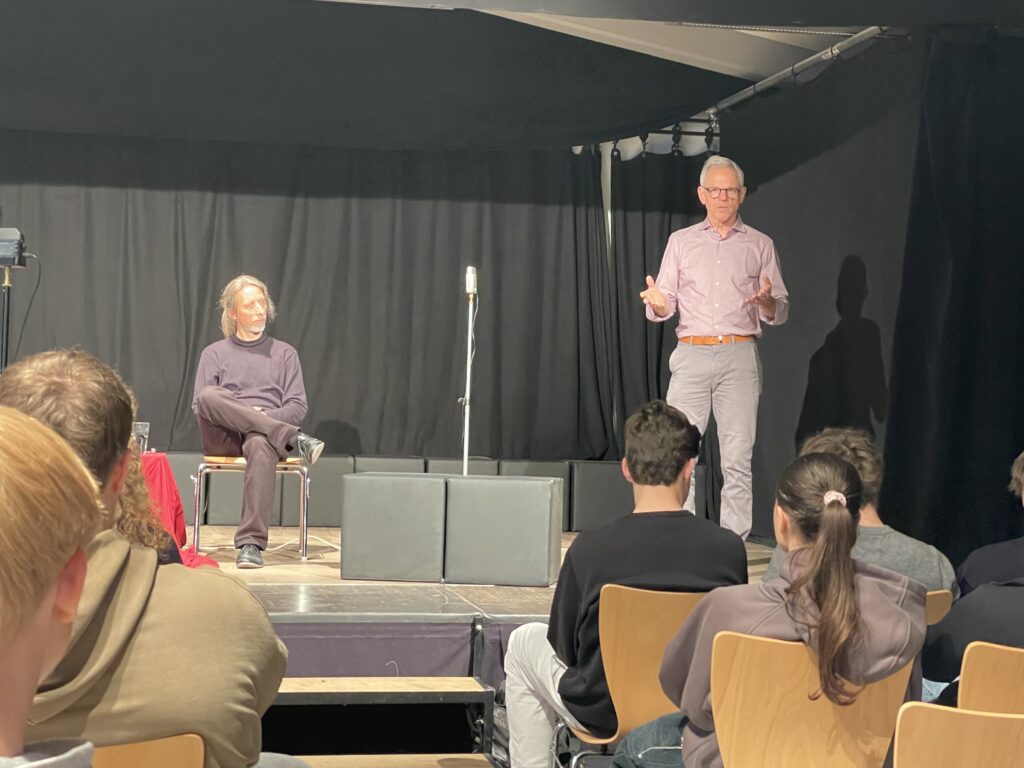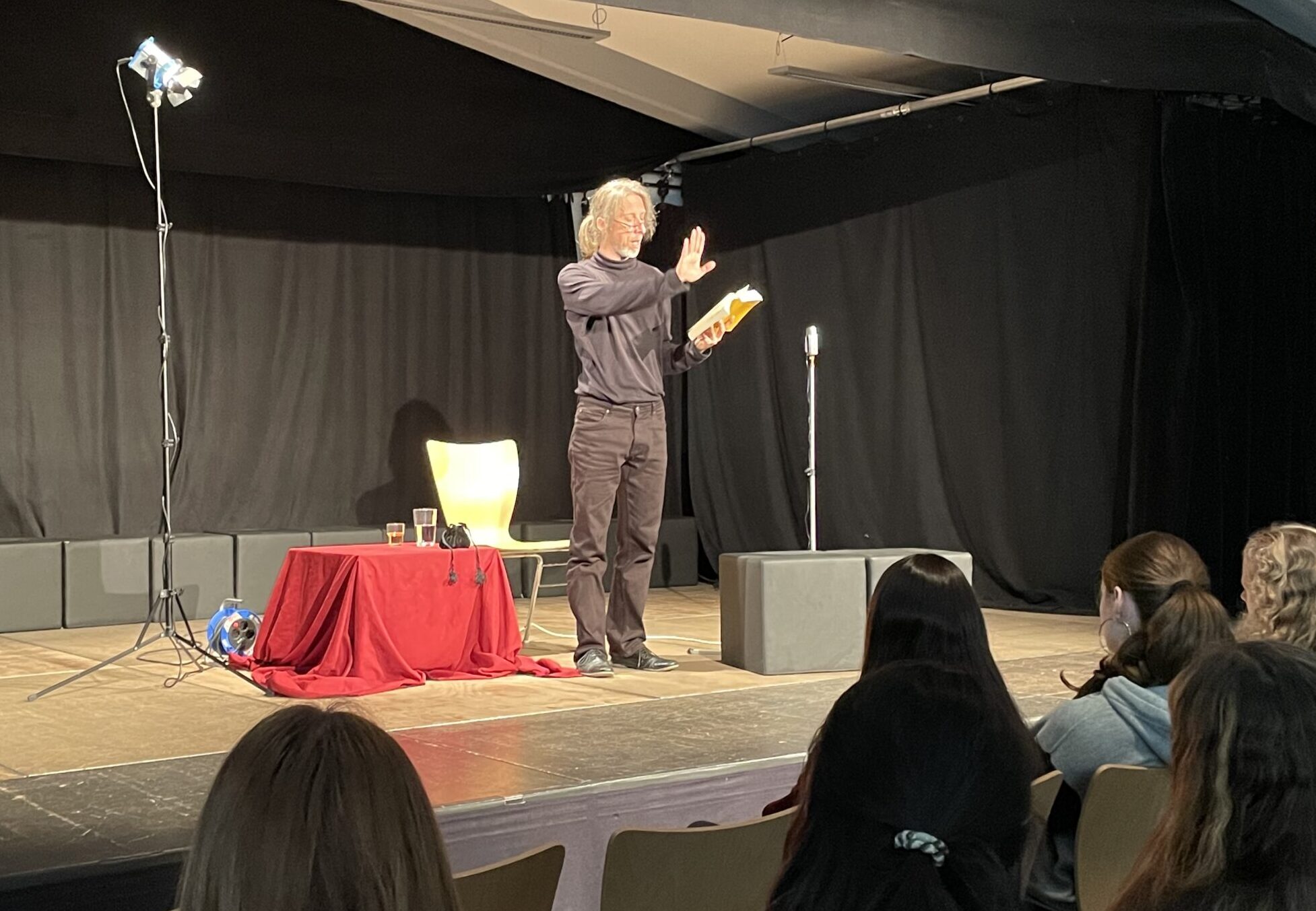 Um allen Klassen eine konzentrierte Teilnahme zu ermöglichen, fanden zwei aufeinanderfolgende Lesungen statt: zunächst für die Klassen 10A und 10C, anschließend für 10B und 10D. Bereits beim Betreten der Aula war zu spüren, dass die Schülerinnen und Schüler keine gewöhnliche Lesestunde erwartete. Trotz einer bewusst schlicht gehaltenen Bühne beherrschte Rudloff mit seiner ausdrucksstarken Stimme, seiner Mimik und Gestik den Raum und zog das Publikum von Beginn an in den Bann.