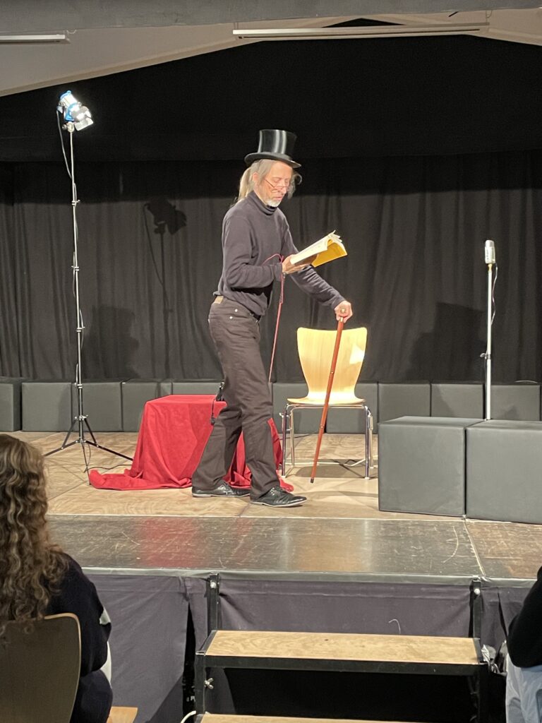 Besonders beeindruckend war seine Darstellung der unterschiedlichen Figuren, allen voran des Magiers Cipolla, dessen manipulative Ausstrahlung Rudloff mit großer Intensität verkörperte. So wurde die spannungsgeladene Atmosphäre des fiktiven Badeortes Torre di Venere für alle Anwesenden lebendig nachvollziehbar. Die Zehntklässler folgten der Darbietung aufmerksam und sichtlich berührt.