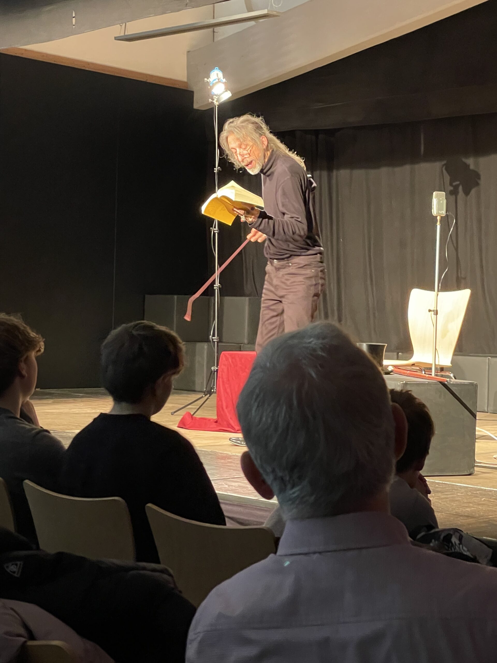 Im Rahmen der Thomas-Mann-Woche erlebten die Schülerinnen und Schüler der 10. Klassen am 18. November 2025 eine besondere literarische Veranstaltung in der Aula unserer Schule: Der renommierte Schauspieler und Vorleser Rainer Rudloff präsentierte Thomas Manns Novelle „Mario und der Zauberer“ und verwandelte die Lesung in ein eindrucksvolles Schauspielerlebnis.