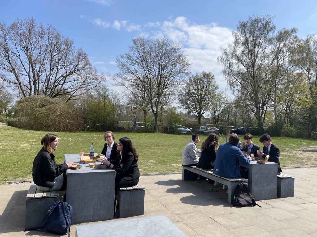 Vormittags nahmen die Schülerinnen und Schüler von zuhause aus teil, aber insofern es die Zeit zuließ, trafen wir uns in der Mittagspause in der Schule und blieben dann dort auch über den Nachmittag. Dies war eine willkommene Gelegenheit, sich mit den anderen sowie Frau Petzold und Frau Hohenfeld auszutauschen, dem drögen Vorm-Computer-Sitzen eine Abwechslung zu bieten und sich nebenbei ein gutes Essen schmecken zu lassen.