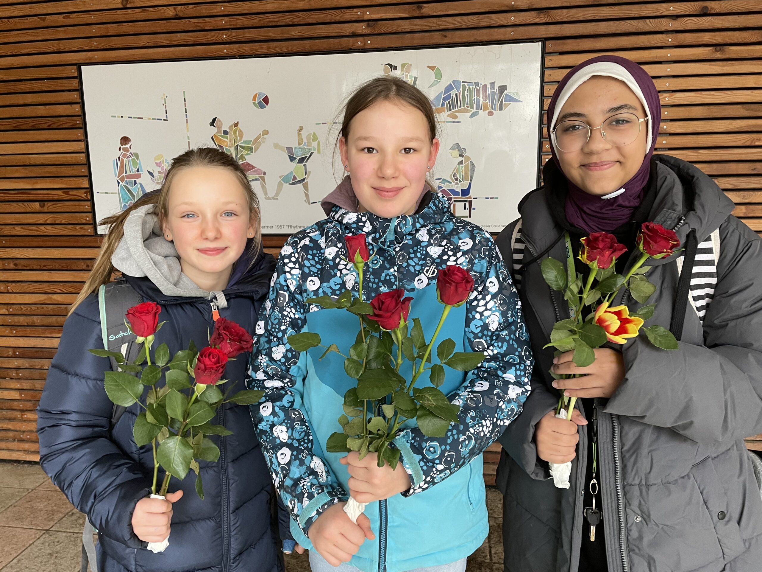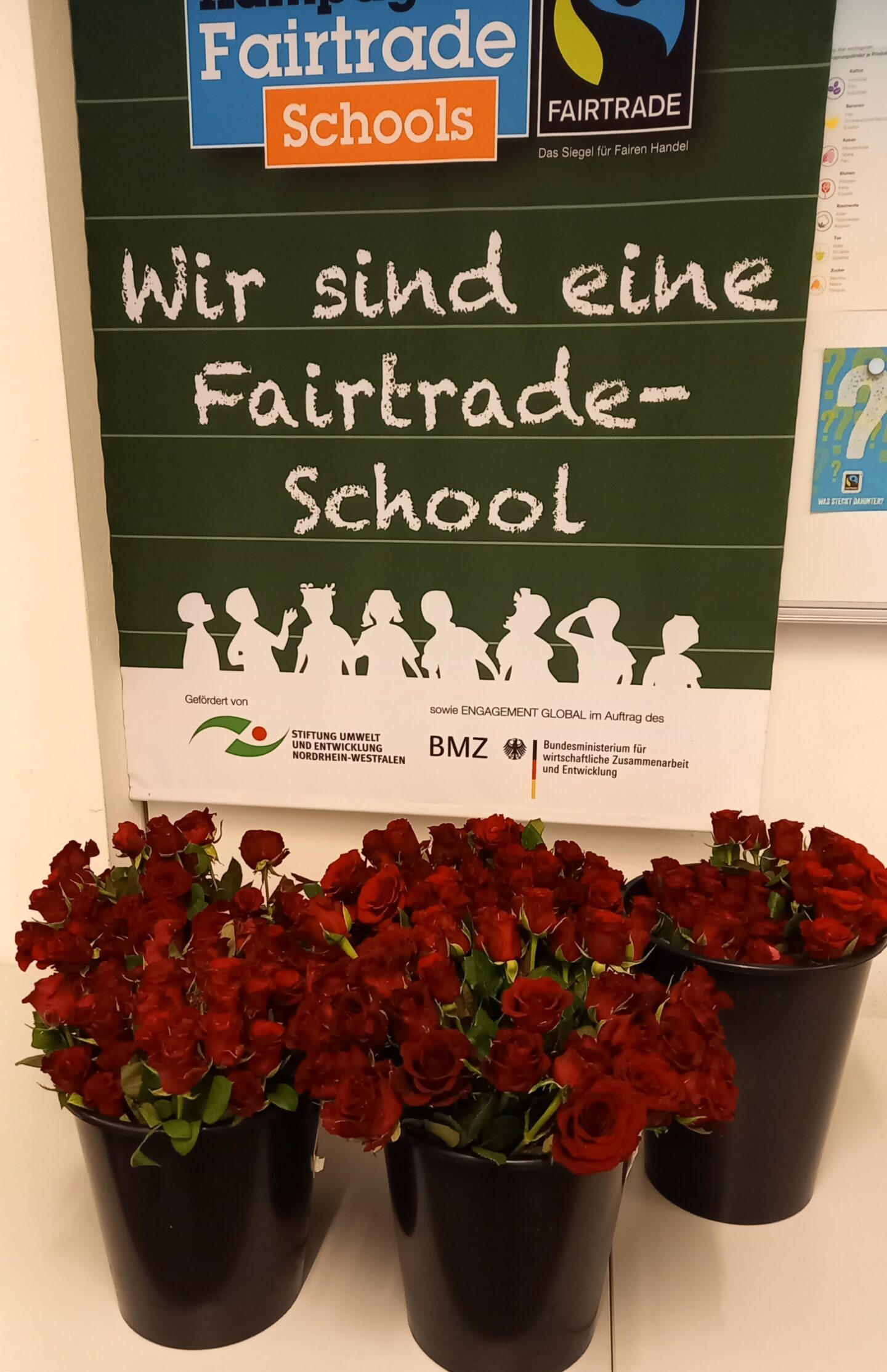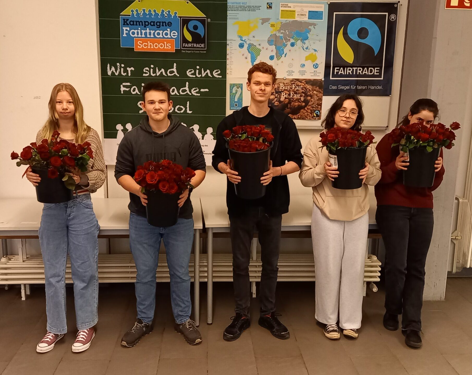 240 fair gehandelte Rosen warteten am Morgen des Valentinstags auf fünf fleißige Helfer aus der Fairtrade AG ( Jana, Julius, Mick, Emma und Gillian), die ebenso vielen Schülerinnen und Schülern (und auch einigen Lehrkräften!) eine besondere Freude beim Überbringen der roten Rosen machten.