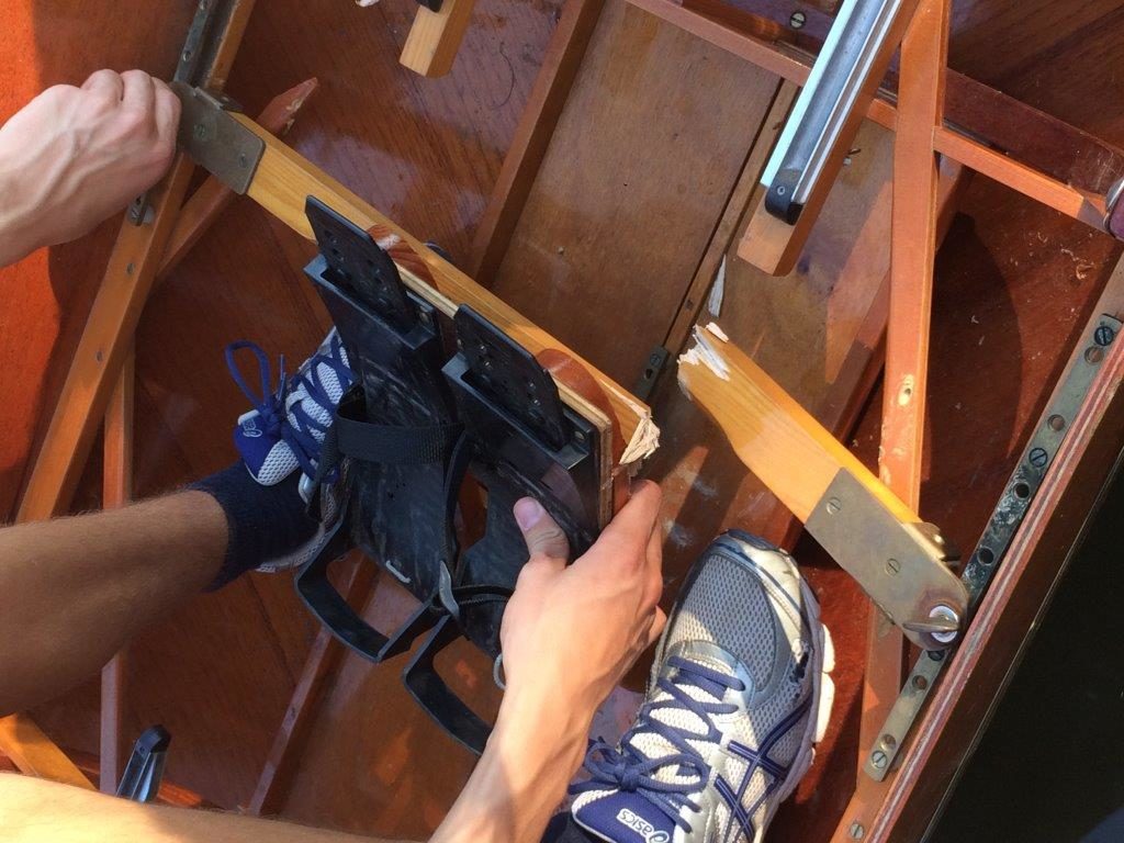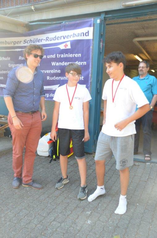 Die Mannschaft im Riemenvierer war zwar in Leistungsgruppe II gemeldet, musste aber in Lgr. I starten, da keine anderen Mannschaften in Lgr. II gemeldet waren. Pech! Die Junioren hatten sich zwar ausführlich eingerudert, um sich an das Leihboot zu gewöhnen, doch nach dem 2. Startschlag im Rennen brach ein Stemmbrett auf Platz Nr. 3. Das Rennen wurde dann abgebrochen, die Mannschaft musste ein anderes Boot holen, nachdem ein Austausch des kaputten Stemmbretts nicht möglich war, und konnte dann noch einmal starten.