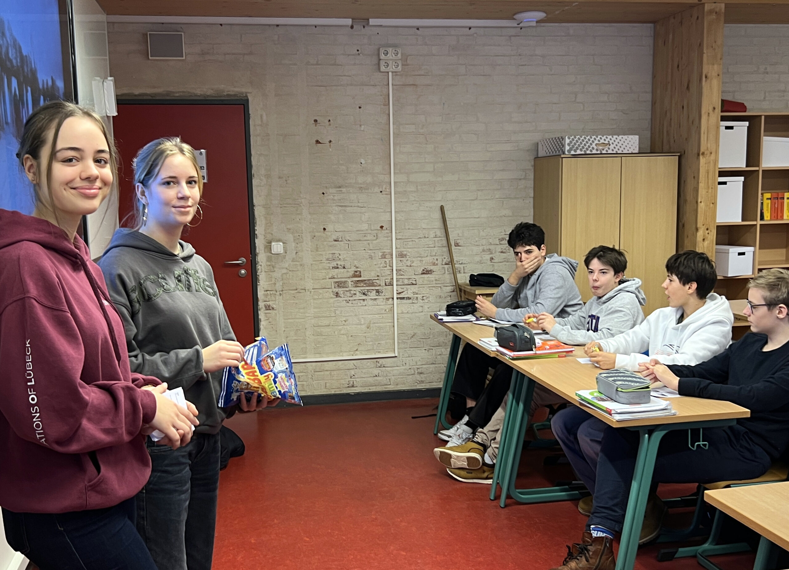 In der 8c und der 8d zeigten zwei Schülerinnen aus dem Sprachprofil einen selbst gedrehten Film über Assoziationen zu Frankreich und den Hintergrund des Deutsch-französischen Tags, zu dem die Klassen hinterher Fragen beantworten mussten und dabei Carambar, eine typisch französische Süßigkeit, gewinnen konnten.
