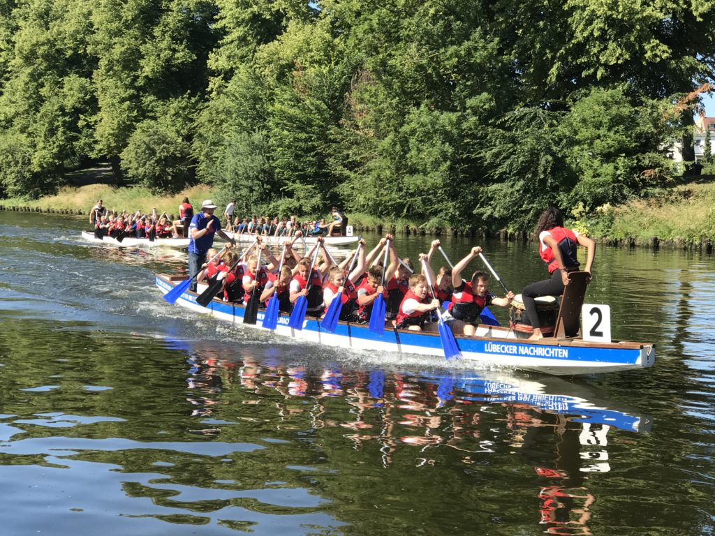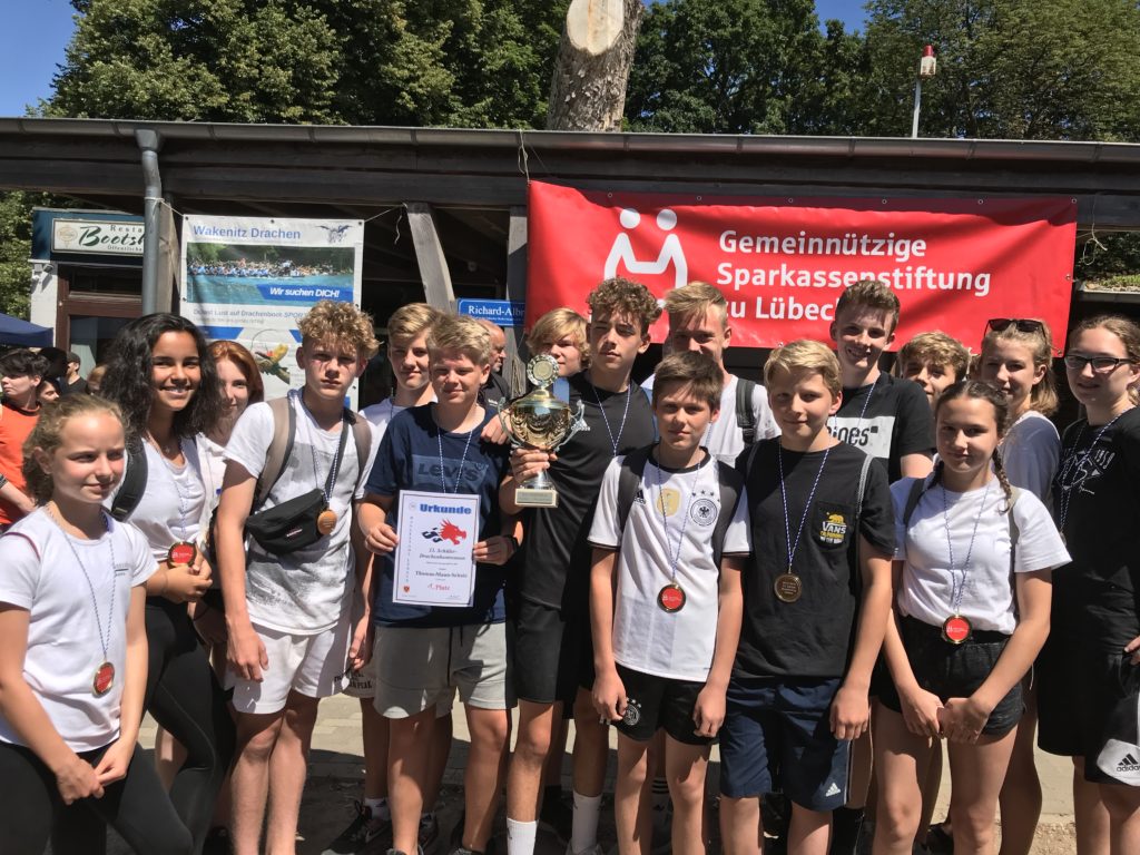 Das Schüler-Drachenbootrennen fand in diesem Jahr nun zum 13. Mal statt. In den letzten Jahren haben wir bei diesem Ereignis schon etliche Siege herausfahren können. Im letzten Jahr gelang es den zwei Teams der TMS die Pokale der Sparkasse zu Lübeck erneut an unsere Schule zu holen. In der Kategorie 2003-05 startete die TMS mit einem Boot und in der Kategorie 2003 und älter waren zwei Boote gemeldet.