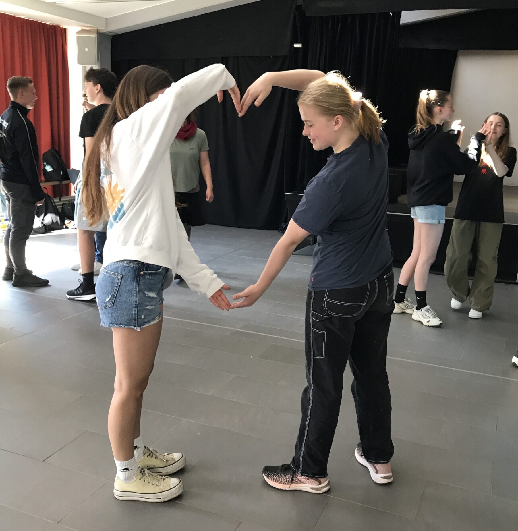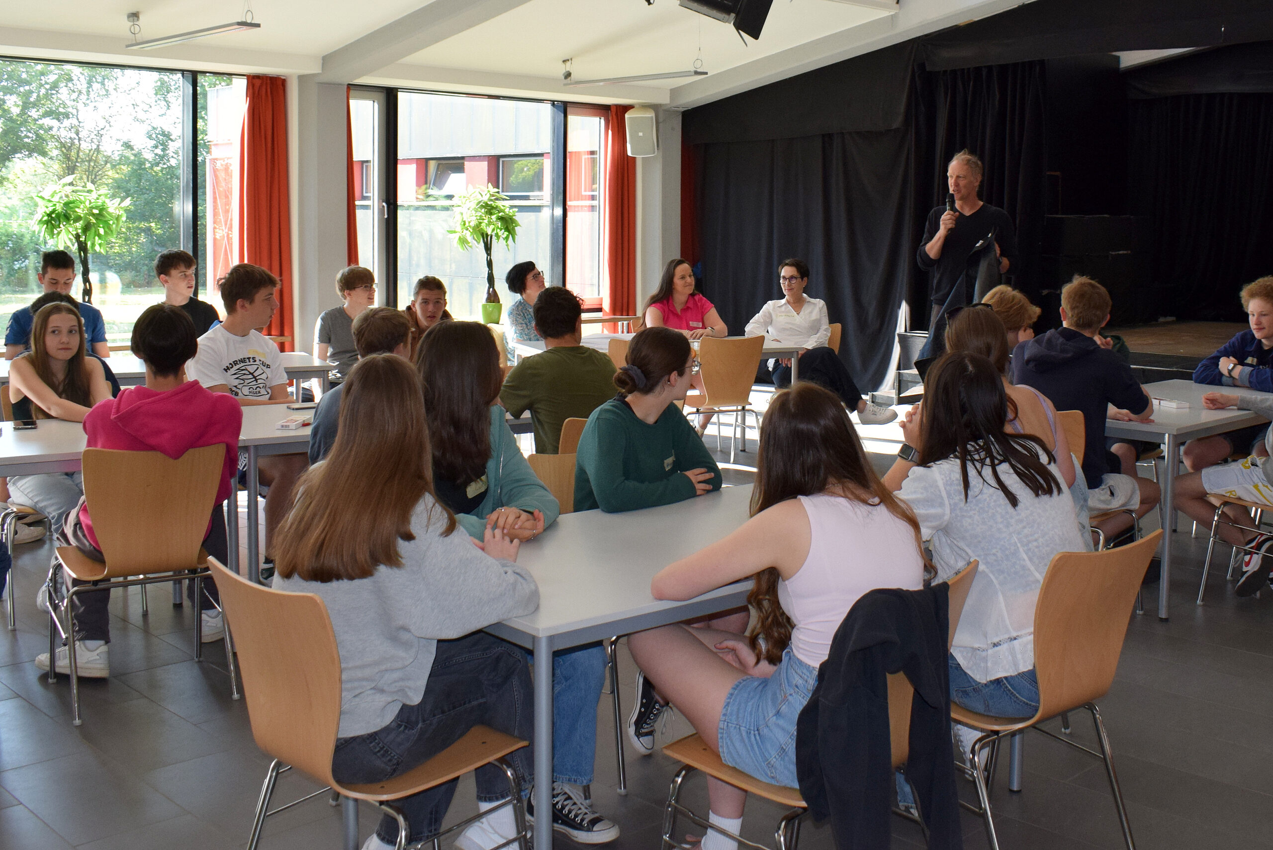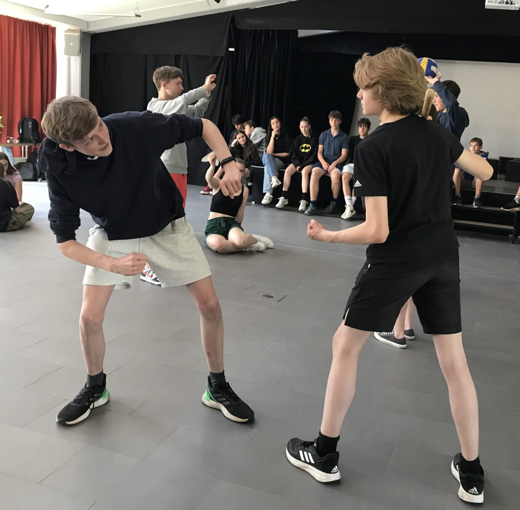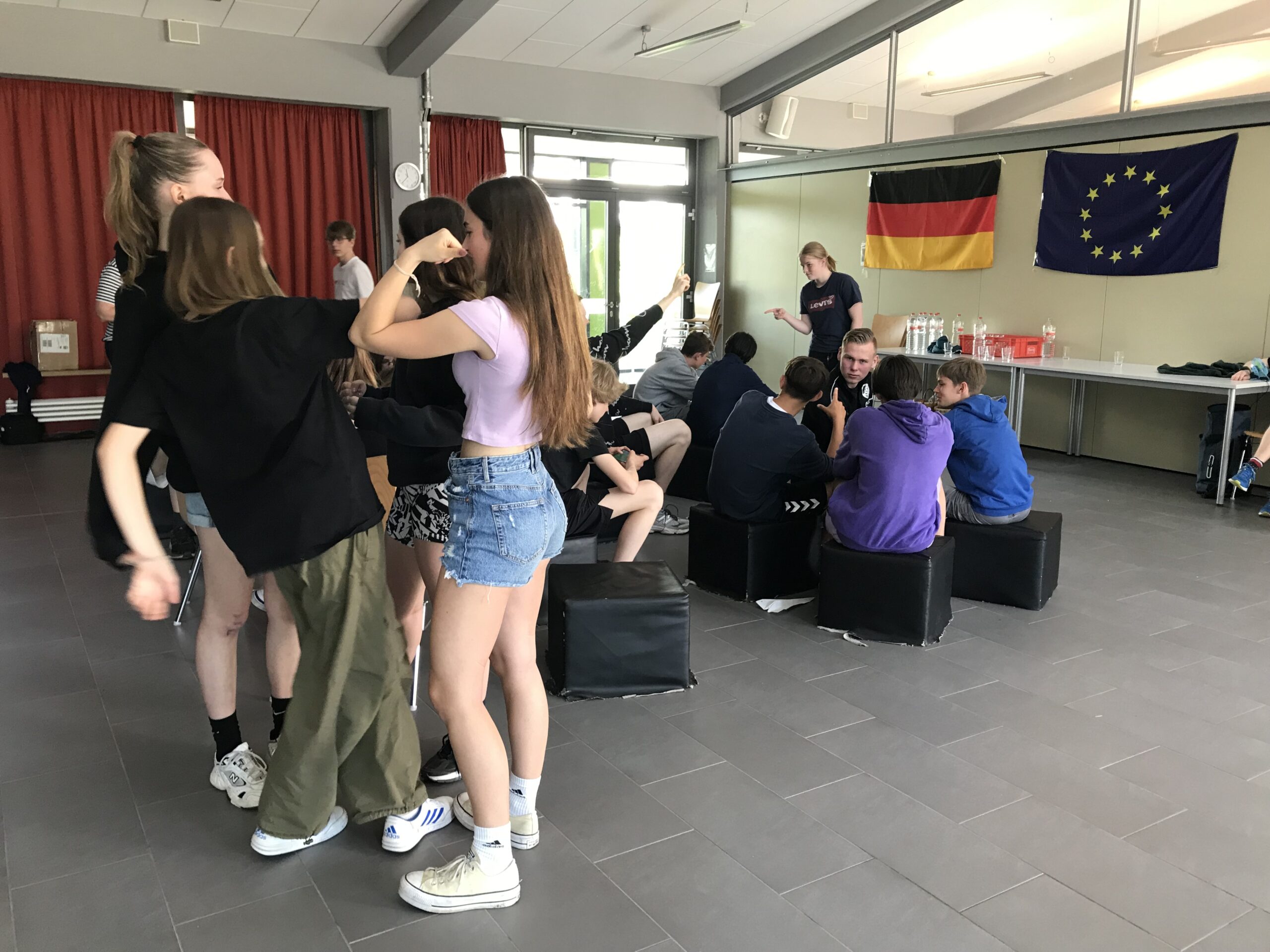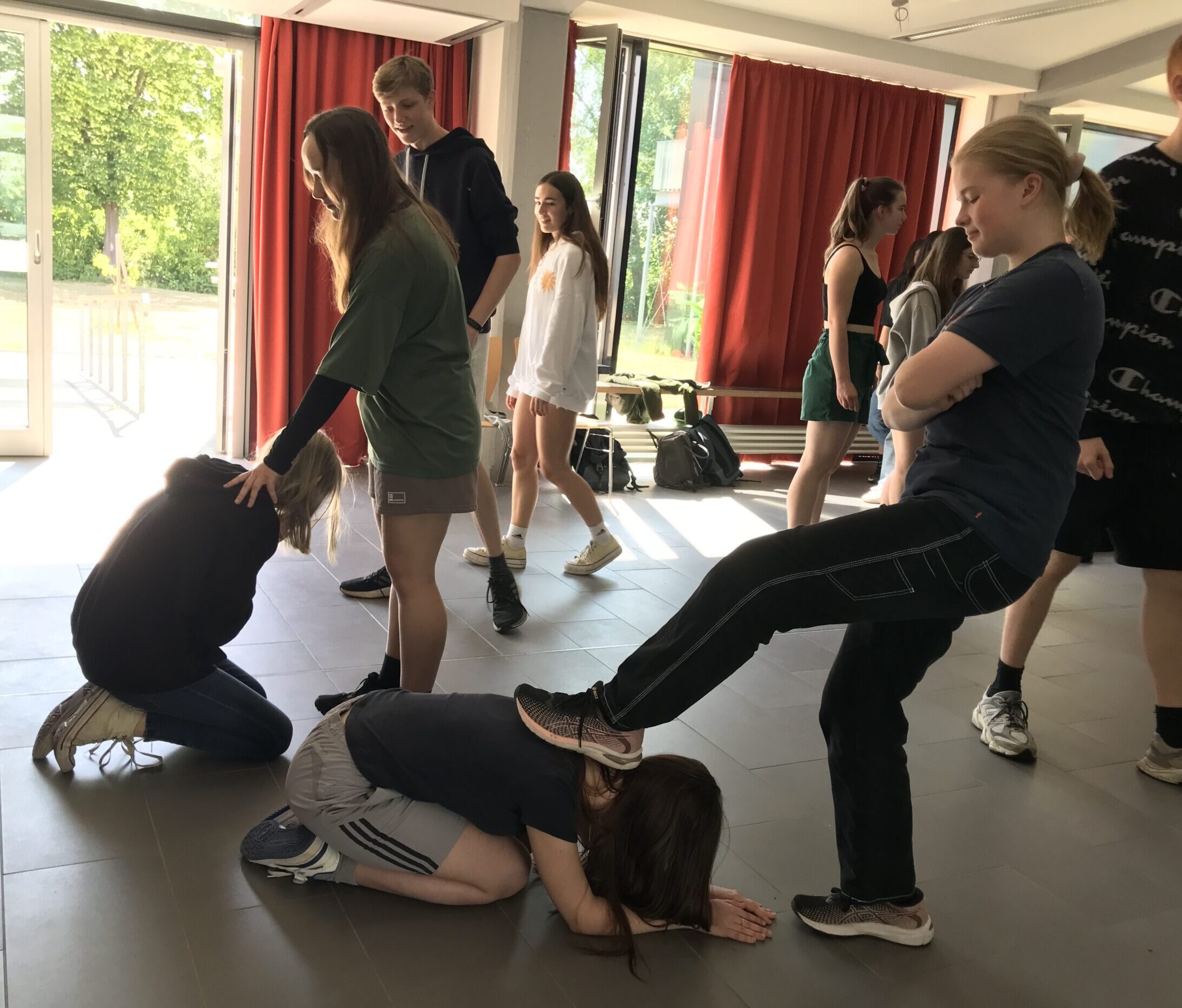 Danach ging es um die Beziehungen der Romanfiguren untereinander: Wie stehen Hanno und Kai zueinander? Wie die Klassenkameraden der beiden? Wie lässt sich das Verhältnis zwischen Lehrern und Schülern verdeutlichen? Dazu stellten die Teilnehmerinnen und Teilnehmer Standbilder. Zuvor hatten sie unter Anleitung von Lehrerin für Darstellendes Spiel, Kirsten Engler, erprobt, wie sich mithilfe von Körpersprache und Positionen im Raum zwischenmenschliche Beziehungen wie Solidarität und Gemeinschaft, aber auch Unterwerfung und Gehorsam darstellen lassen.