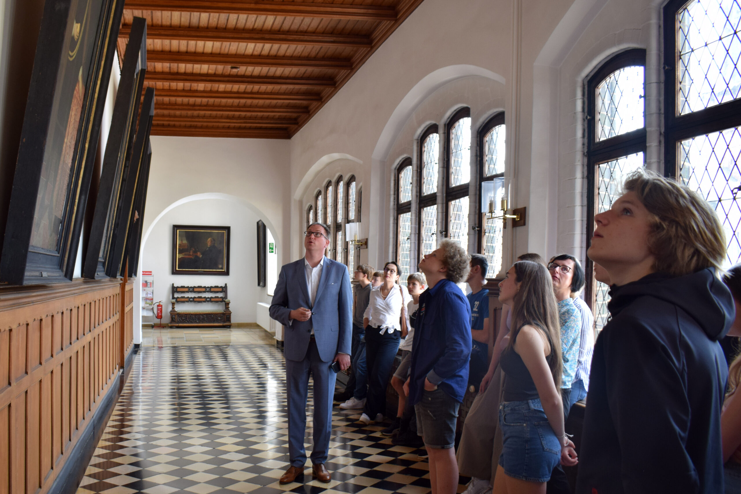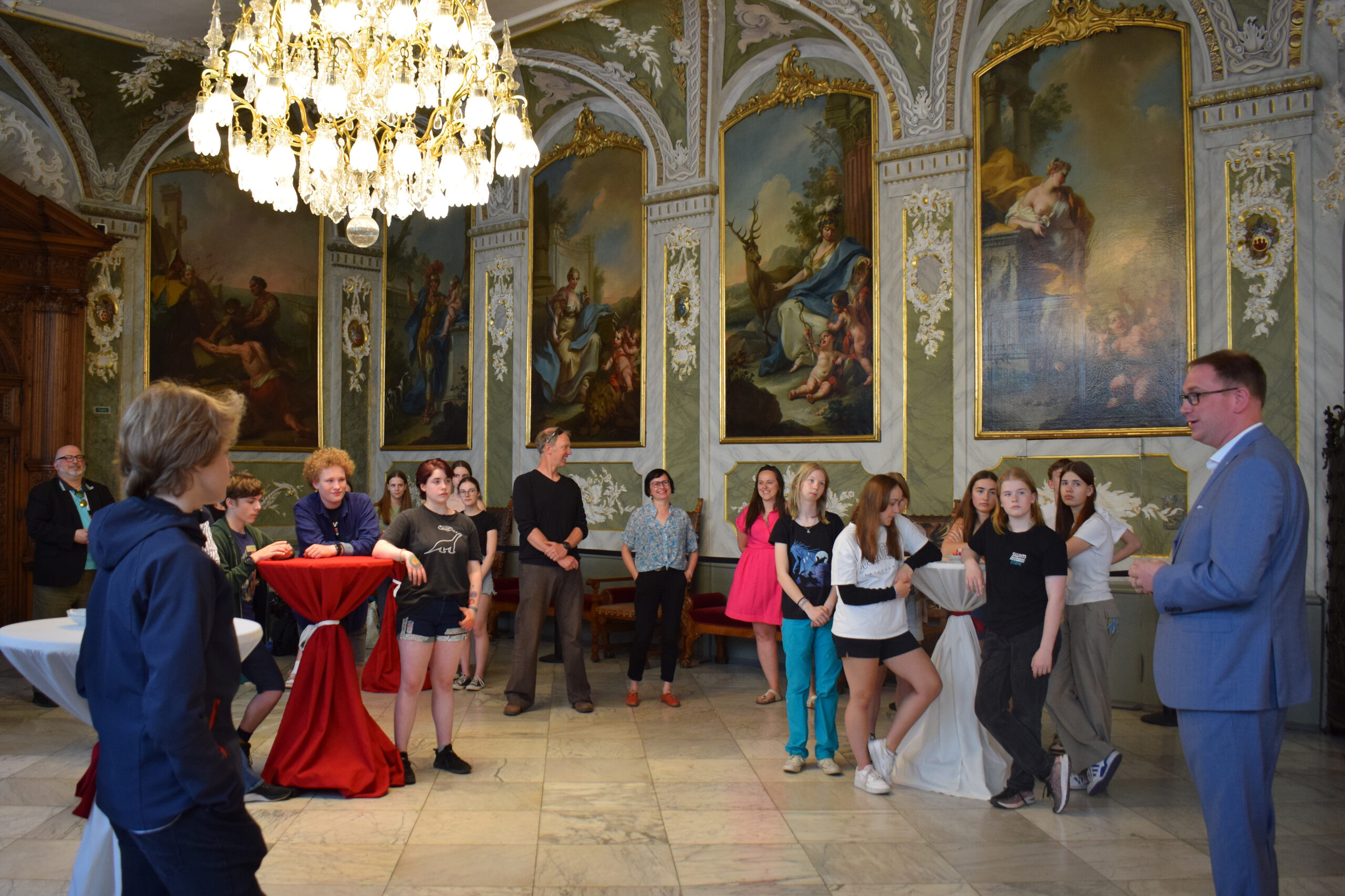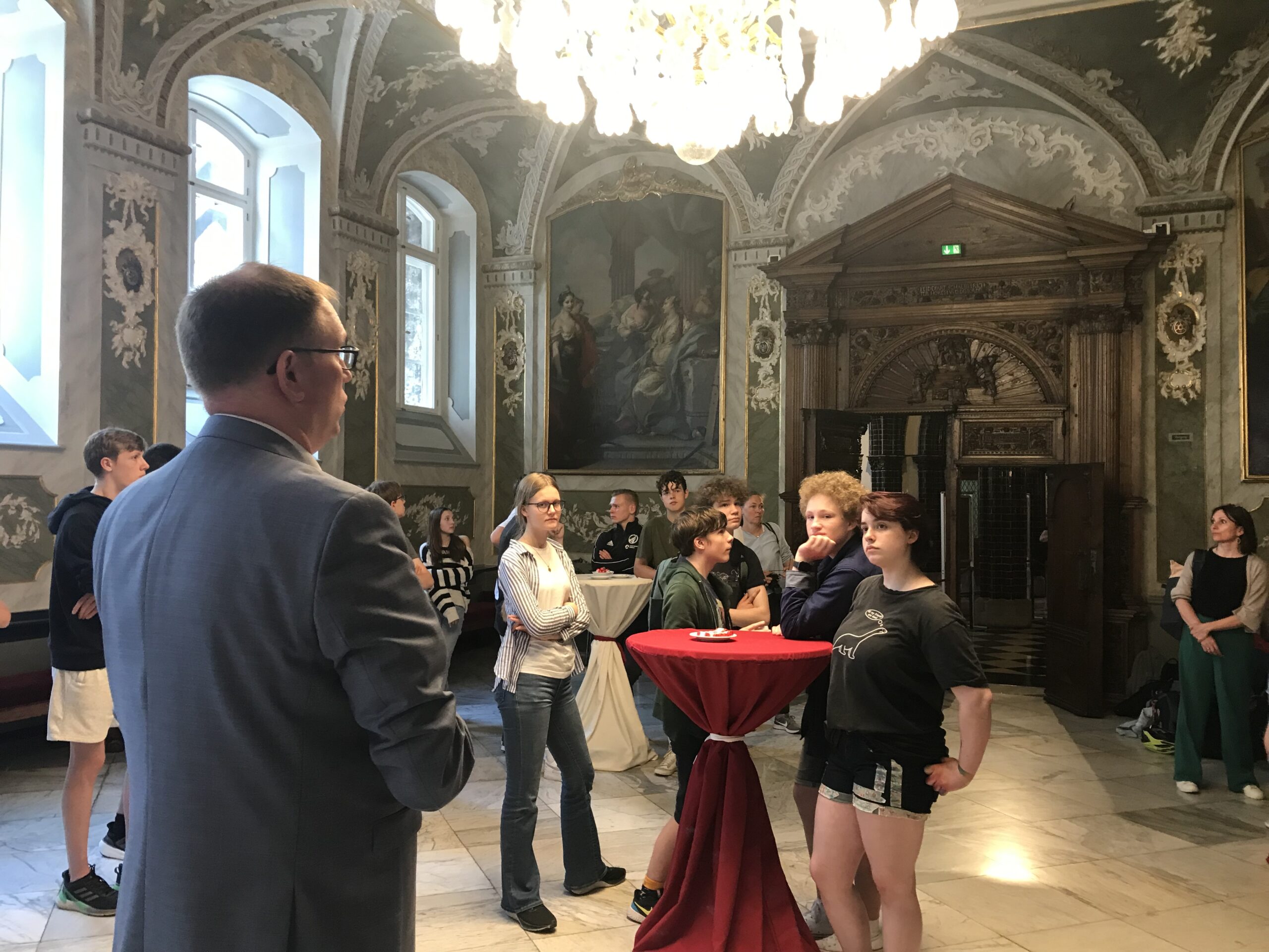 Rathauschef Lindenau erläuterte den Schülerinnen und Schülern Geschichte, Funktion und Ausstattung des Raumes.