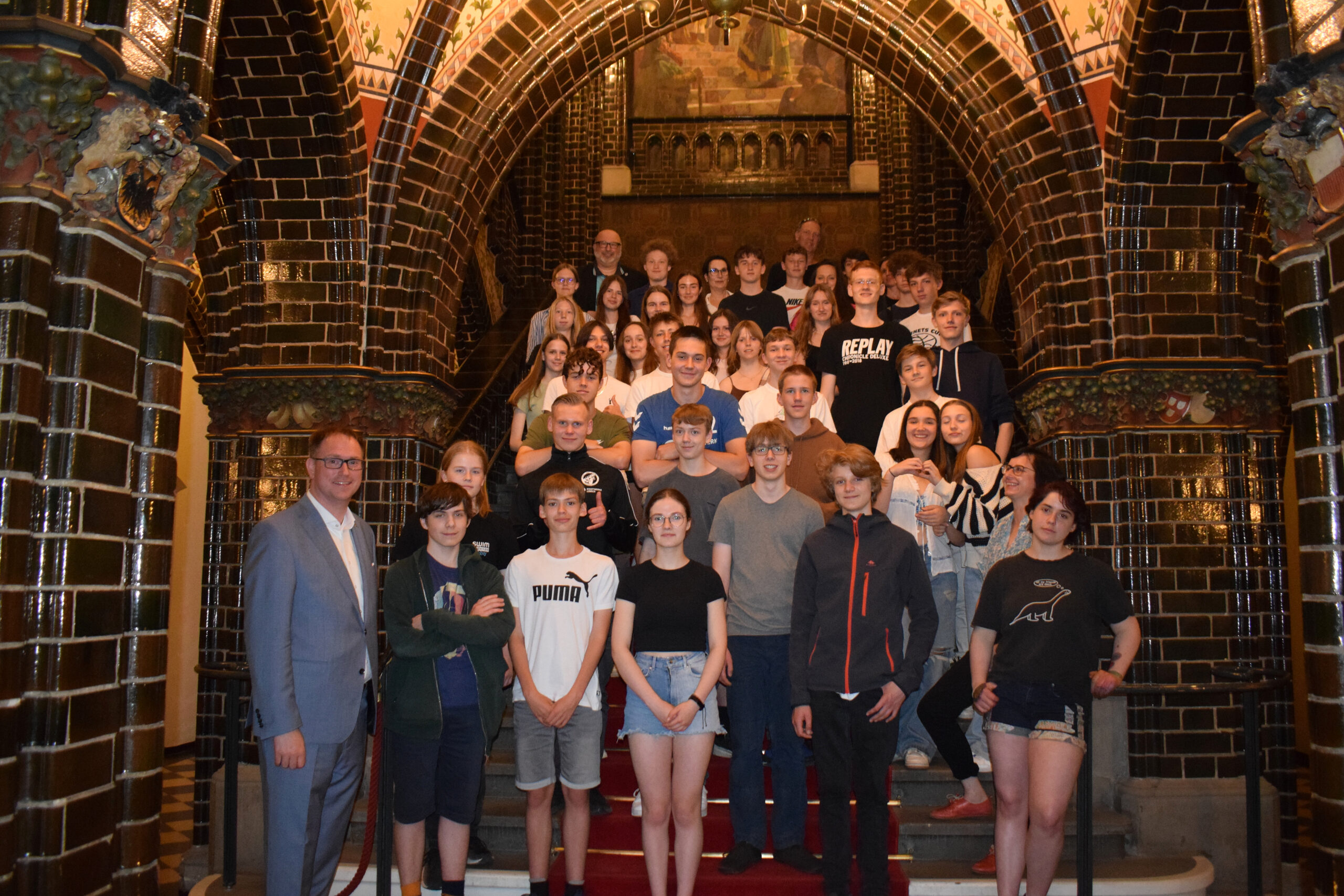 Und weil Thomas Manns Geburtstag sich am ersten Projekttag zum 148. Mal jährte, wurden die Teilnehmerinnen und Teilnehmer von Bürgermeister Jan Lindenau im Audienzsaal des Rathauses empfangen. Im Roman wird hier Thomas Buddenbrook zum Senator gewählt.