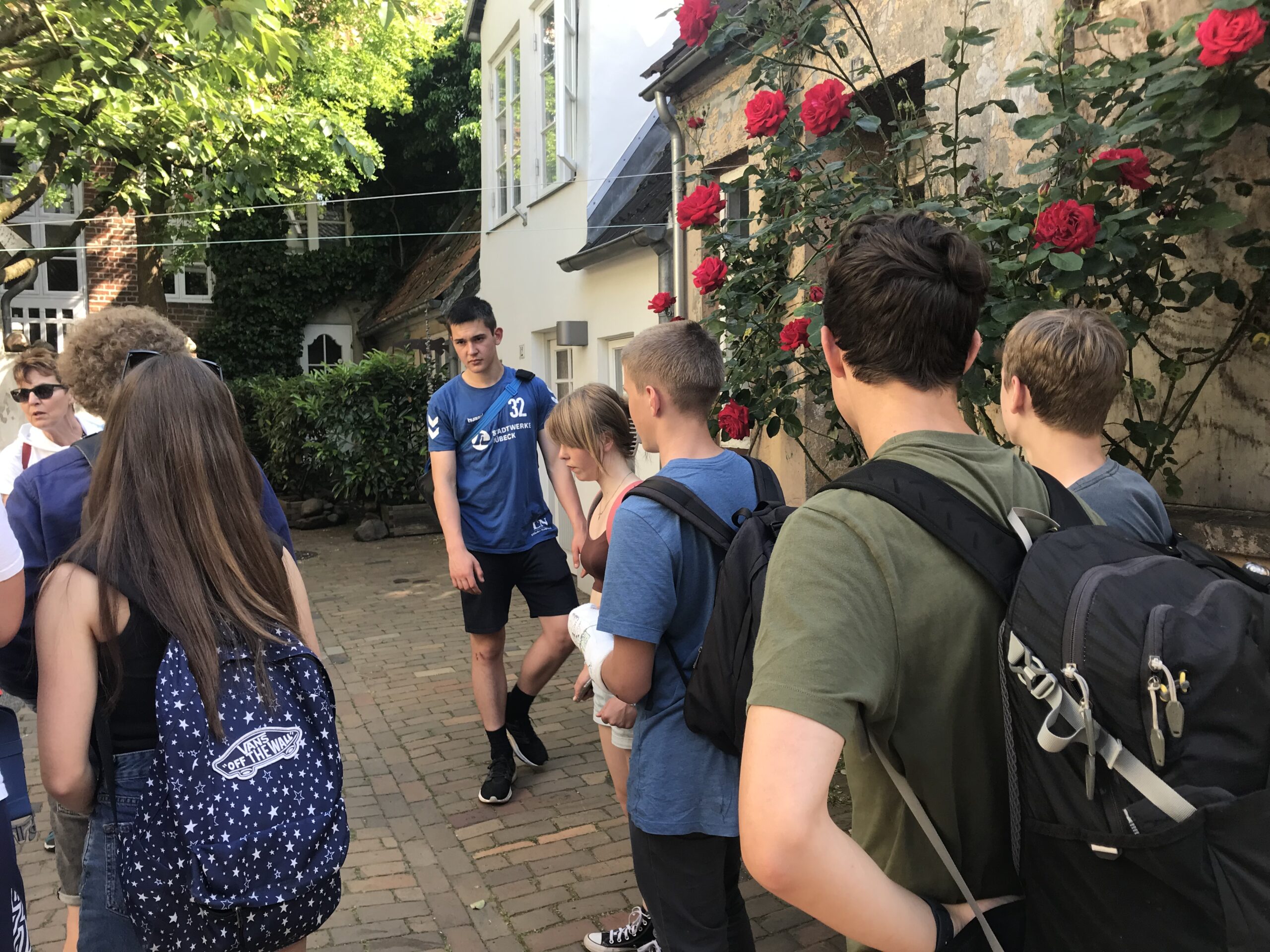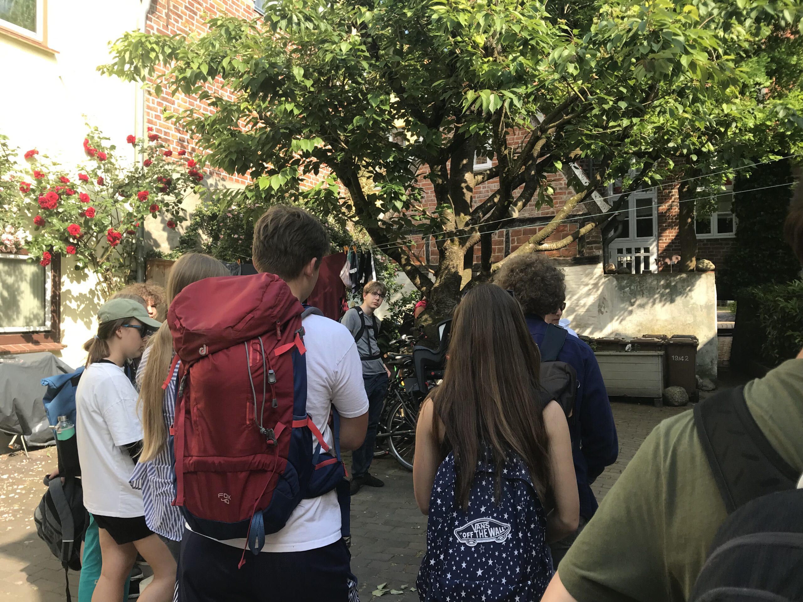 Bei hochsommerlicher Wärme war anschließend Durchhaltevermögen gefragt, als die Schülerinnen und Schüler bei einem Stadtrundgang die Drehorte des Films aufsuchten. Für den würdelosen Tod des diabetischen James Möllendorff aus den „Buddenbrooks“ hatte Thomas Mann ein heruntergekommenes Ganghaus als Handlungsort gewählt. Die engen Hinterhöfen waren den Geschwistern Mann vom Spielen als Kinder vertraut.