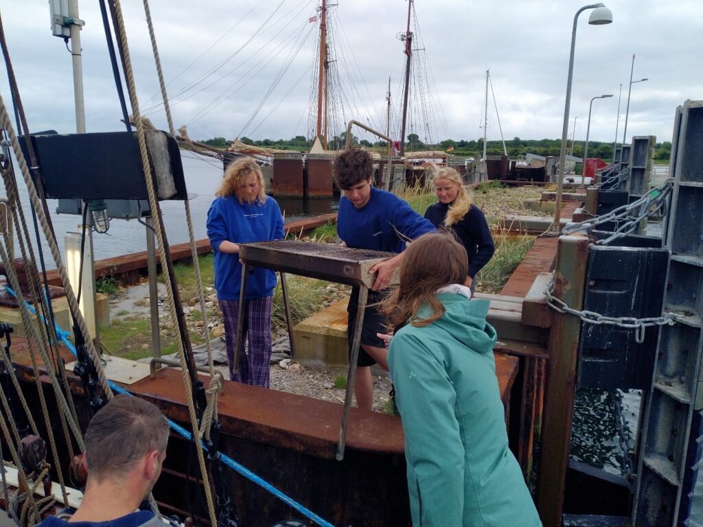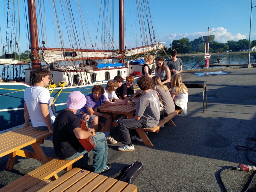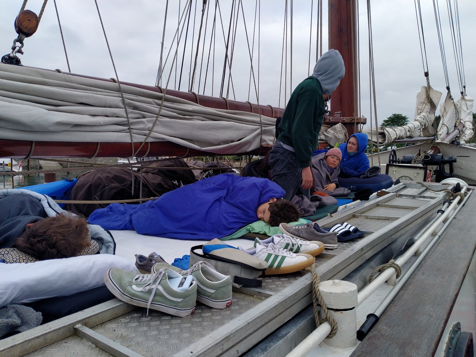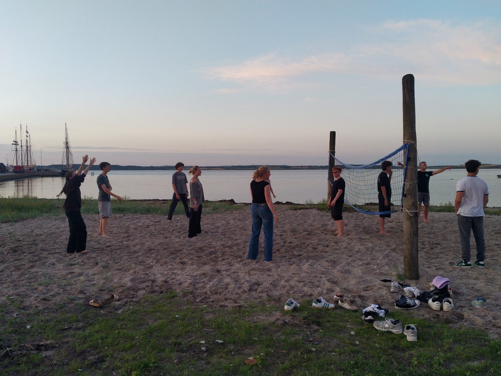 Lex erklärte uns die Grundlagen des Segelns, wir zogen die Segel hoch und genossen die Fahrt nach Marstal auf der dänischen Insel Ærø, wo wir den Strand und die schöne, idyllische Stadt erkundeten und uns im Meer abkühlten. Die vegetarischen Wraps schmeckten an der frischen Abendluft auf dem Dach des Schiffes umso besser und schon jetzt übernachteten einige draußen unter freiem Himmel, bis sie der Regen um 5 Uhr morgens in die Kojen trieb.