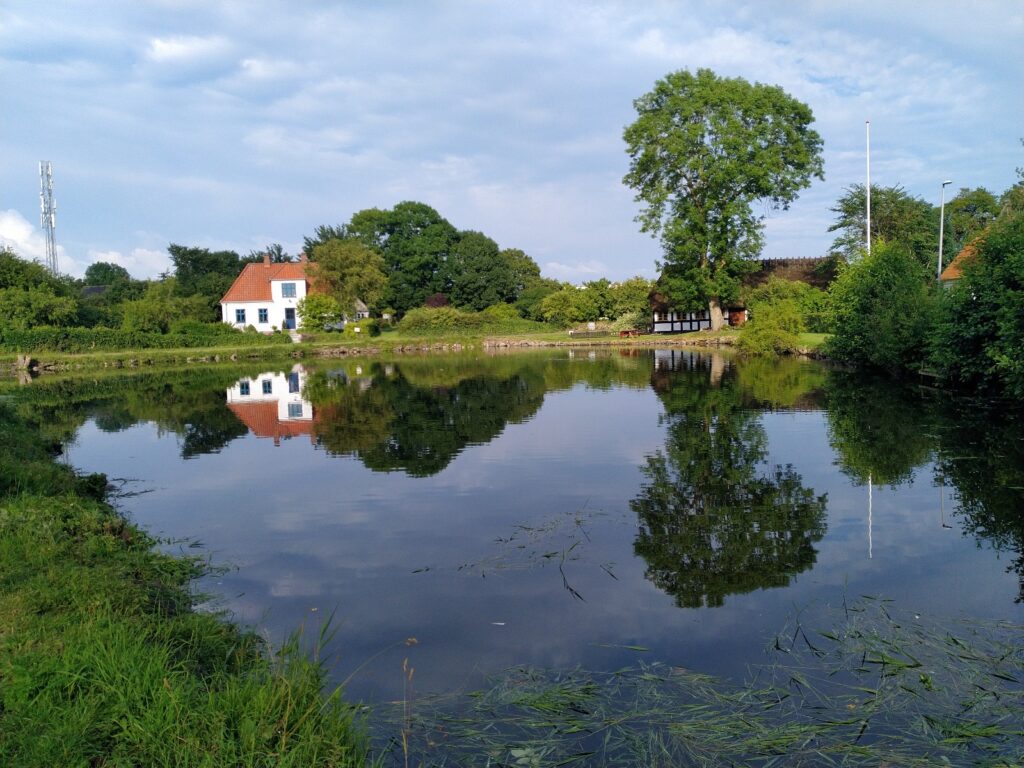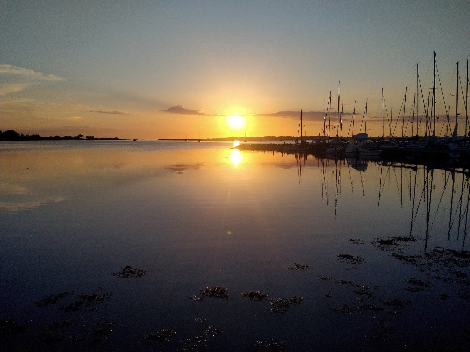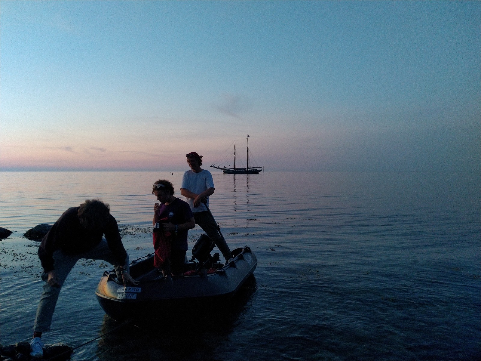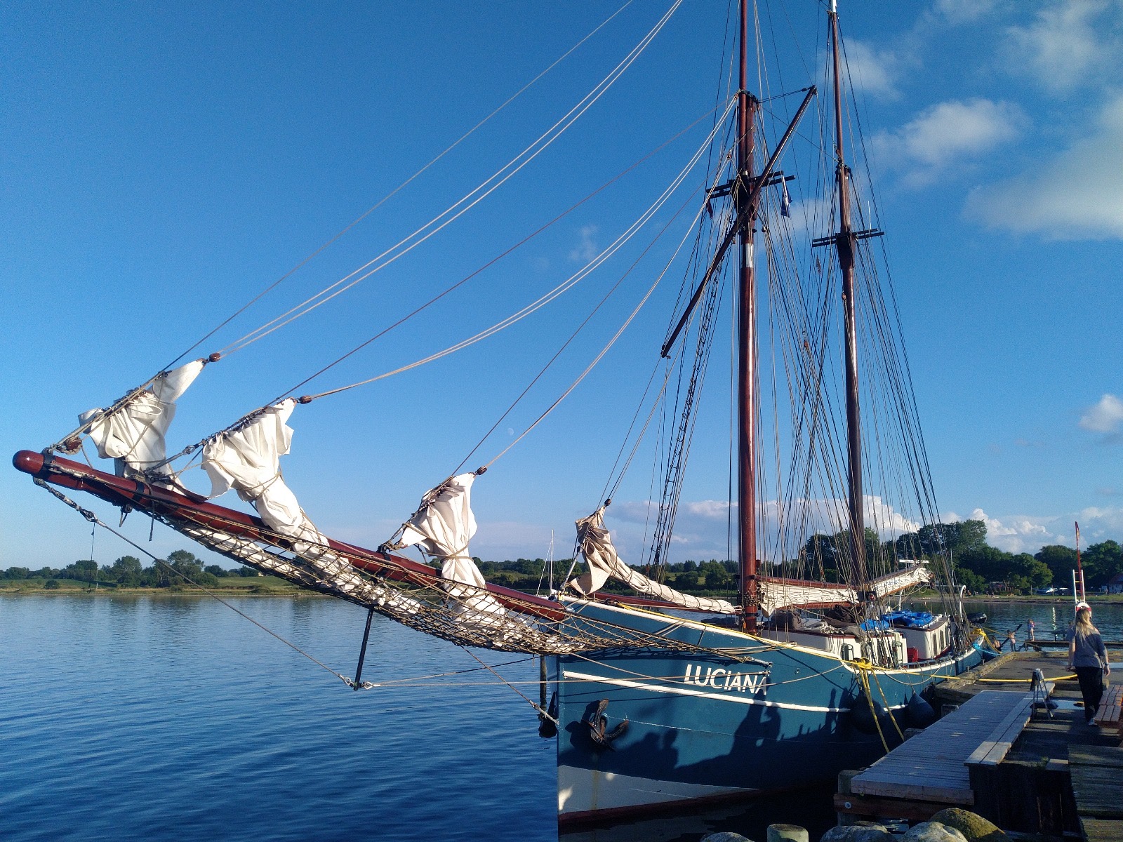 Trotz des zeitweisen Regens gab es am Dienstagmorgen Zeit und Gelegenheit zu kleinen Hafenspaziergängen. Einige verbrachten die Zeit drinnen im Salon und spielten Spiele oder zeichneten, andere verbrachten auch die Schauer draußen und genossen die Lichtstimmungen vom Klüverbaum aus. Während der Fahrt durch die Inselwelt nördlich von Ærø genossen wir die verschiedensten Lichtstimmungen – mal verschwammen die Inseln im Nebel und stachen dann durch das gleißende Sonnenlicht wieder hervor, das im Kontrast zu tiefdunklen Regenwolken stand. Wir steuerten den Hafen von Lyø an und erkundeten bei schwüler Hitze die Strände, Wiesen und den winzigen Ort mit der Kirche und den kleinen Froschteichen. Hier im dänischen Bullerbü grillten wir bei tief stehender Sonne mit Blick auf den Hafen und unser Schiff, das gemütlich auf dem Wasser lag und in der Sonne vor dem ruhigen Wasser traumhaft schön aussah.