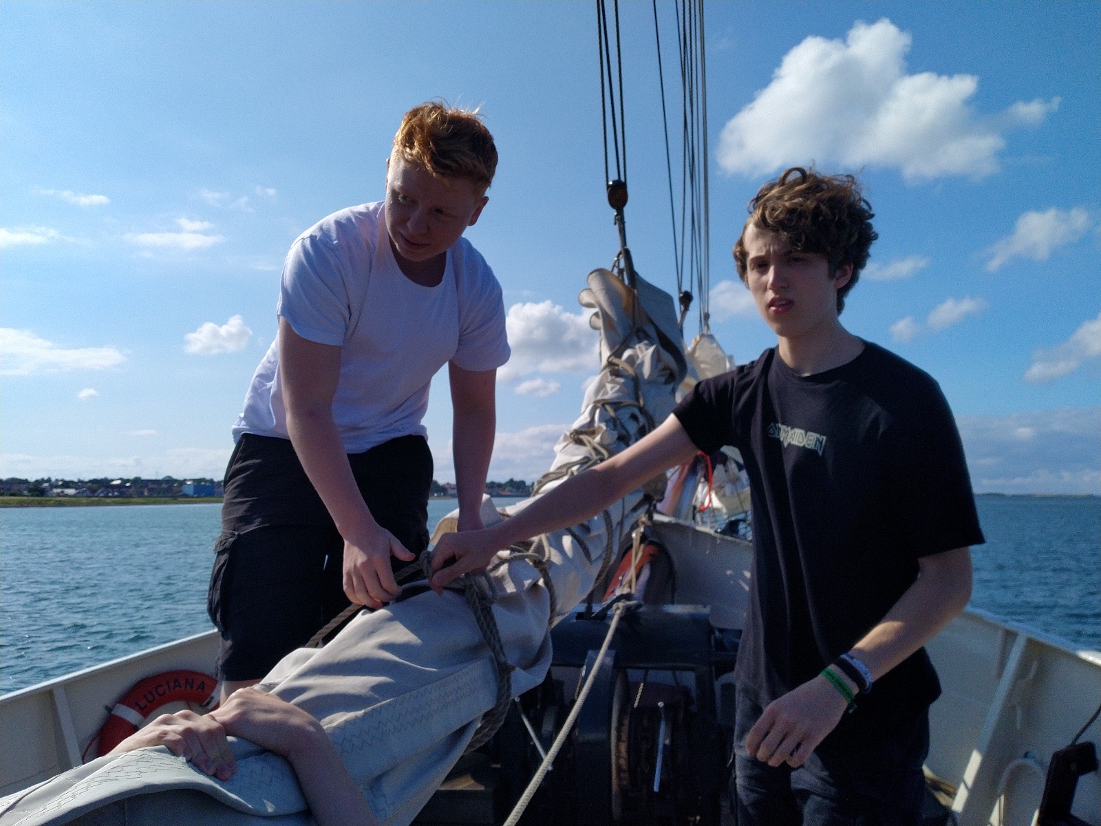Während der letzten Schulwoche vor den Sommerferien stachen Oberstufenschüler/innen aus dem Q1-Jahrgang zum vierten Mal nach den Reisen 2019, 2022 und 2023 in See. Wir hatten lange genug gewartet, alles geplant, die Verpflegung selbst organisiert und uns bei einem Mitbring-Buffet im Garten von Lorenz schon genauer kennen gelernt. Am Sonntag, 14. Juli 2024 fuhren wir mit dem Zug nach Kiel und wurden an der Blücherbrücke schon direkt von einem heftigen Platzregen überrascht. Einem Seemann macht das natürlich nichts aus und so freuten wir uns, als wir endlich auf unser Schiff, die Luciana, durften. Hier sangen wir das erste Seemannslied und lernten unseren Kapitän Lex kennen, der netter und entspannter kaum sein konnte.