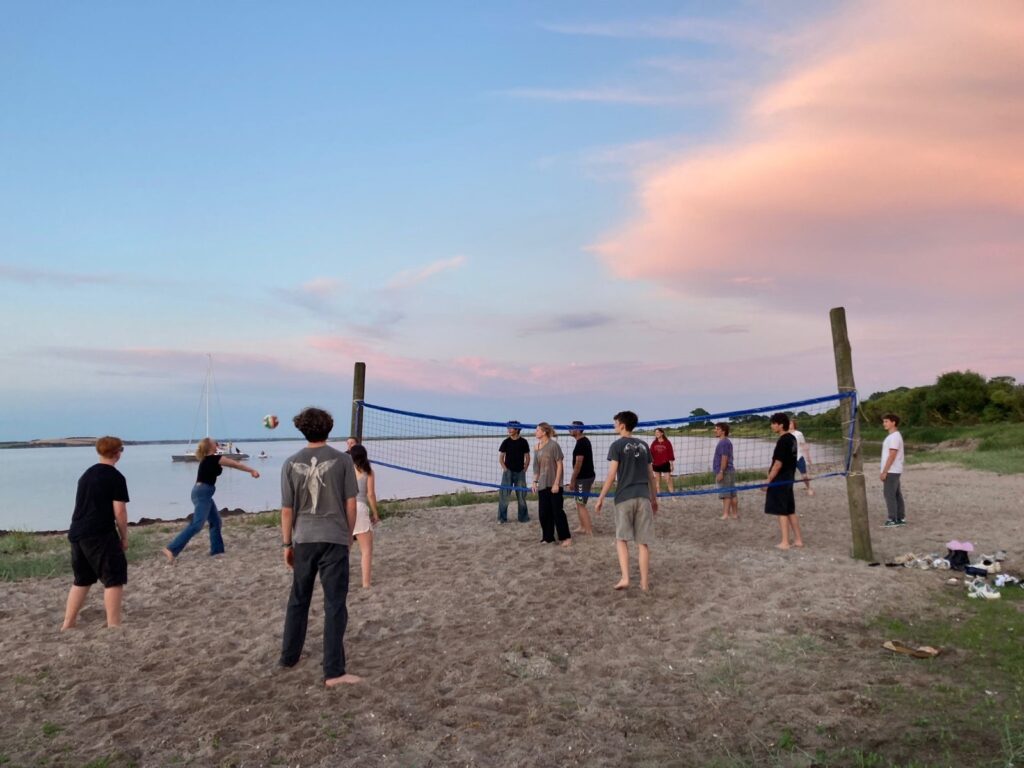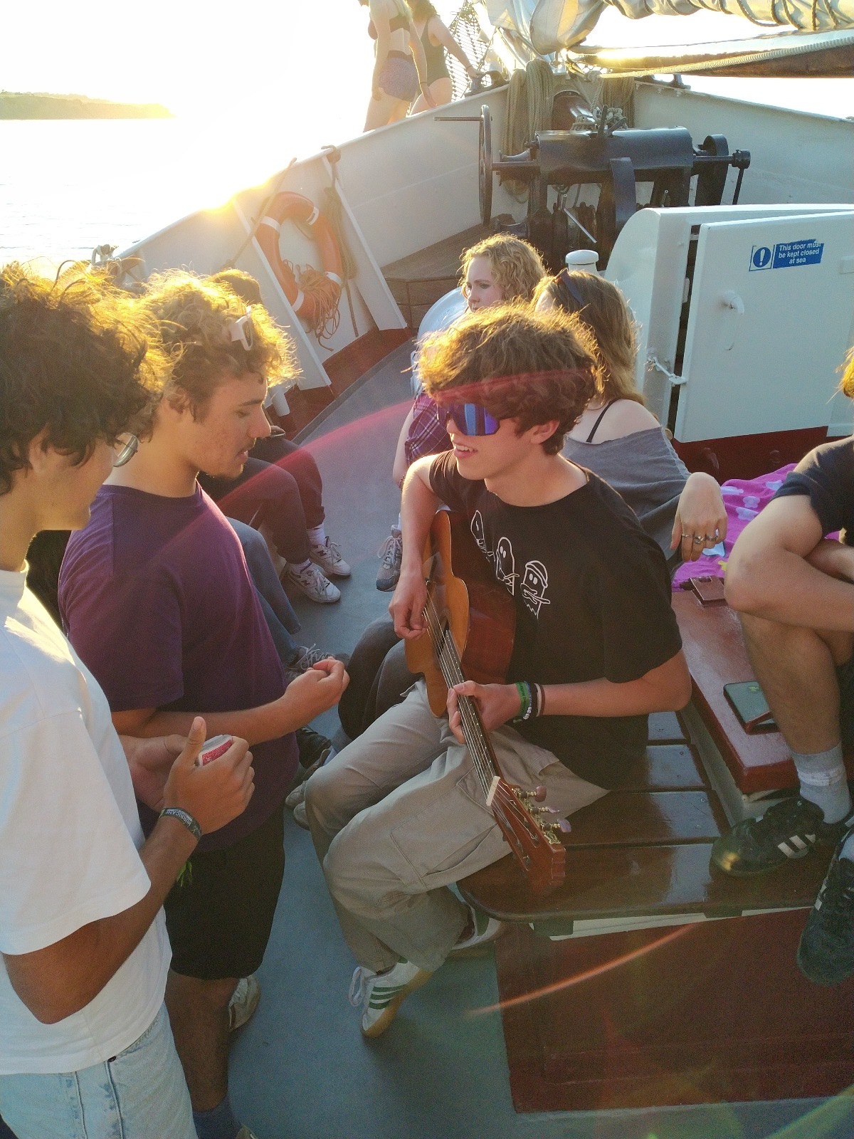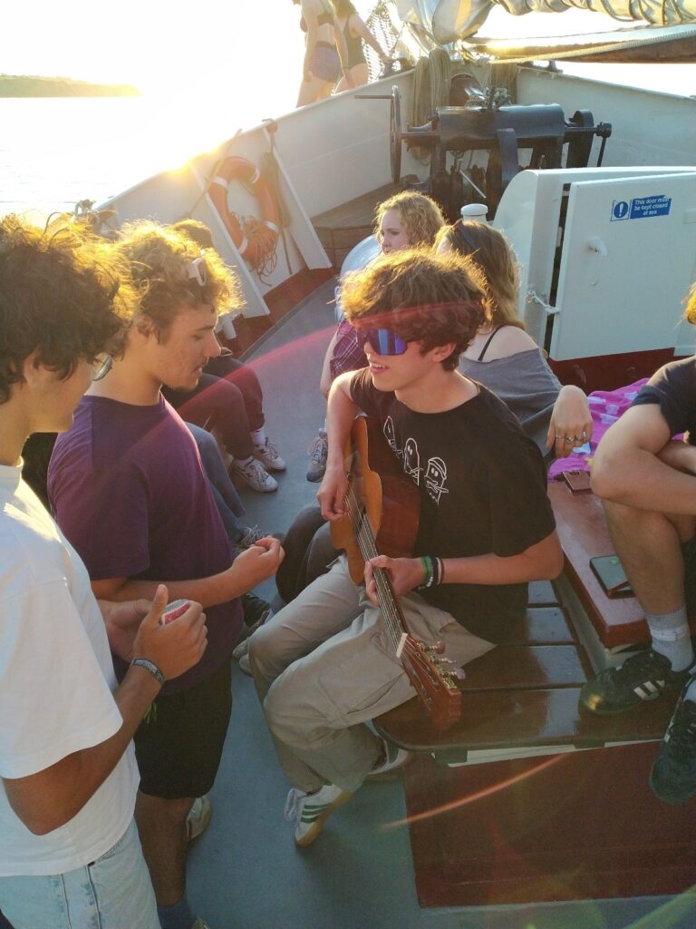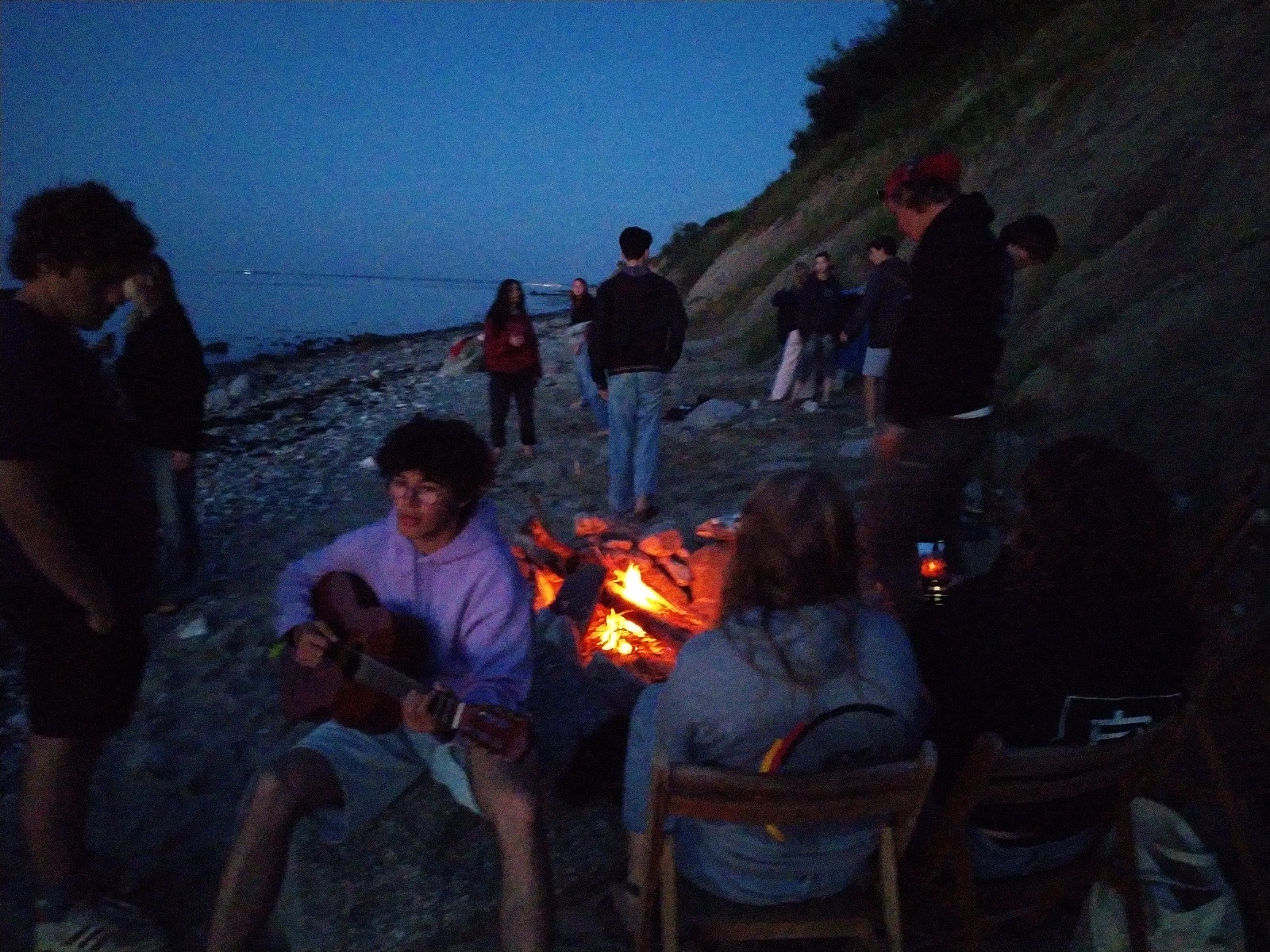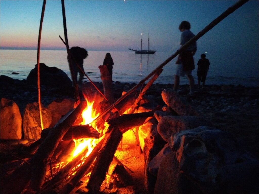 Hier bekamen nicht nur wir Lehrer, sondern auch einige Schüler einen interessanten Einblick in die Vielfalt der heutigen Jugendsprache. Die Erlebnisse im Netz, auf dem Mast, beim Baden und Grillen wurden durch ein weiteres Highlight abgerundet: Lex fuhr uns im Beiboot an den Strand, wo wir Holz für ein Lagerfeuer zusammensuchten und das Schiff vor uns auf dem Meer dümpeln sahen, bis es in der Dunkelheit verschwand und nur noch die Lichter zu uns herüberleuchteten. Wir lauschten den Wellen, dem Knistern des Feuers, es ergaben sich tiefgründige Gespräche – und damit die Stimmung perfekt wurde, spielte Lorenz noch einmal auf seiner Gitarre, während wir alle am Lagerfeuer Lieder sangen.