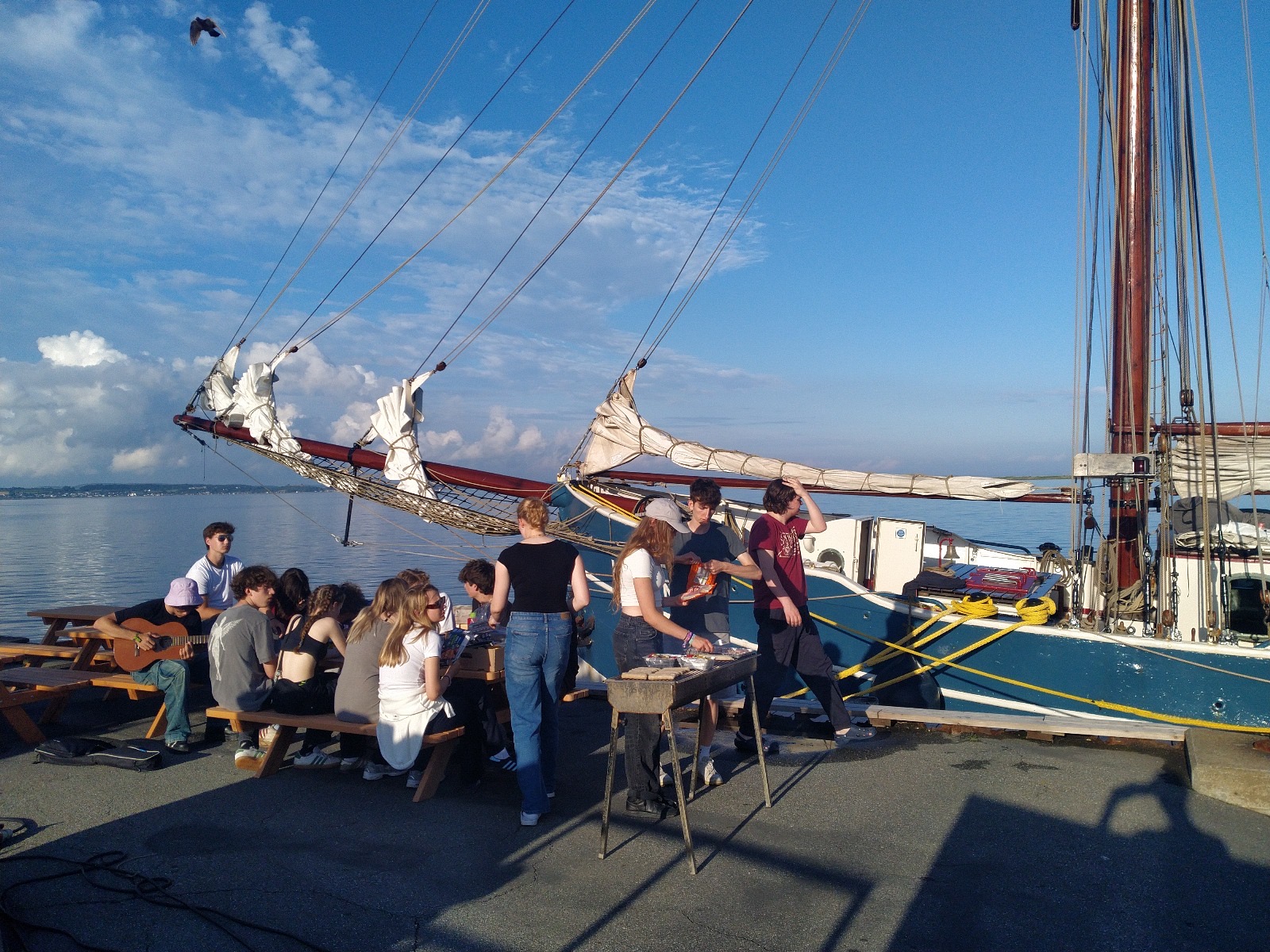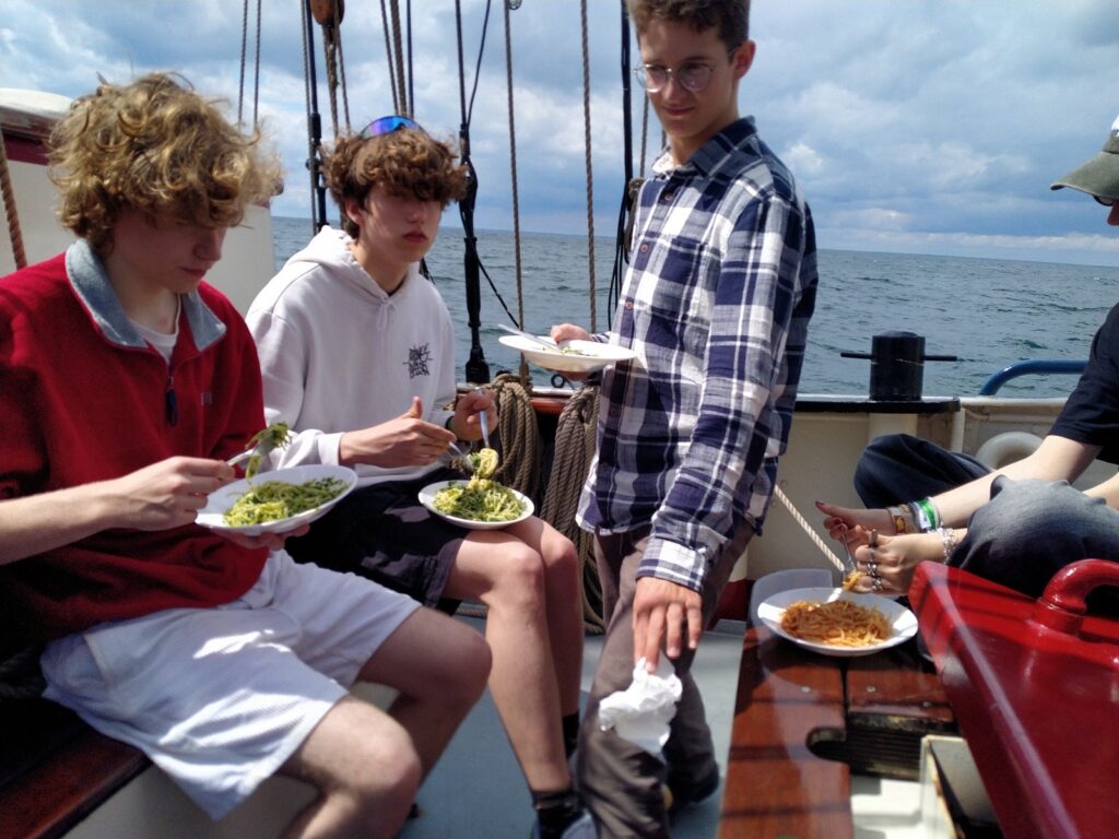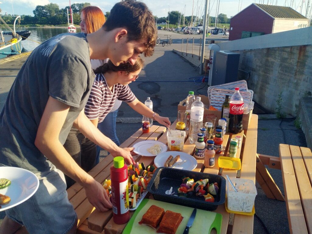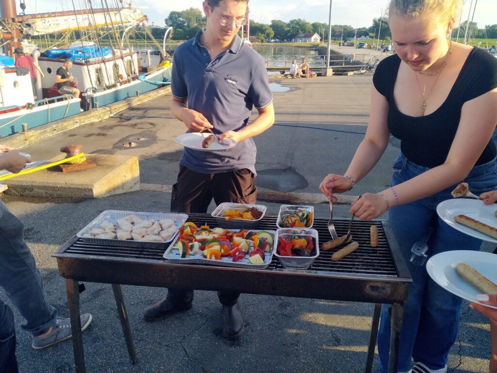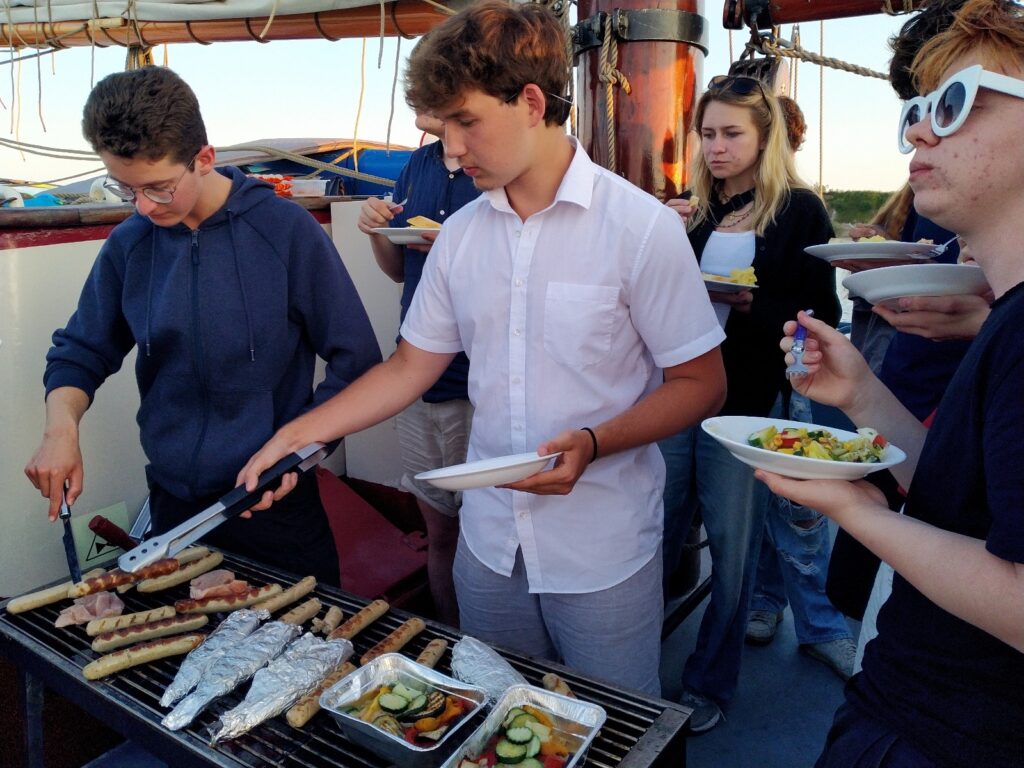 Später badeten wir vom Schiff aus und konnten es damit vom Meer aus betrachten. Vom Wasser aus sah es noch beeindruckender aus, wenn manche von der Spitze des Klüverbaums aus mehrere Meter in die Tiefe sprangen. Diesen Abend übernachteten wir nicht im Hafen, sondern ankerten an der Steilküste vor der Kieler Bucht und grillten auf dem Schiff Fisch, Fleisch, Gemüse und alles, was noch übriggeblieben war.