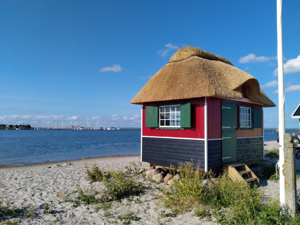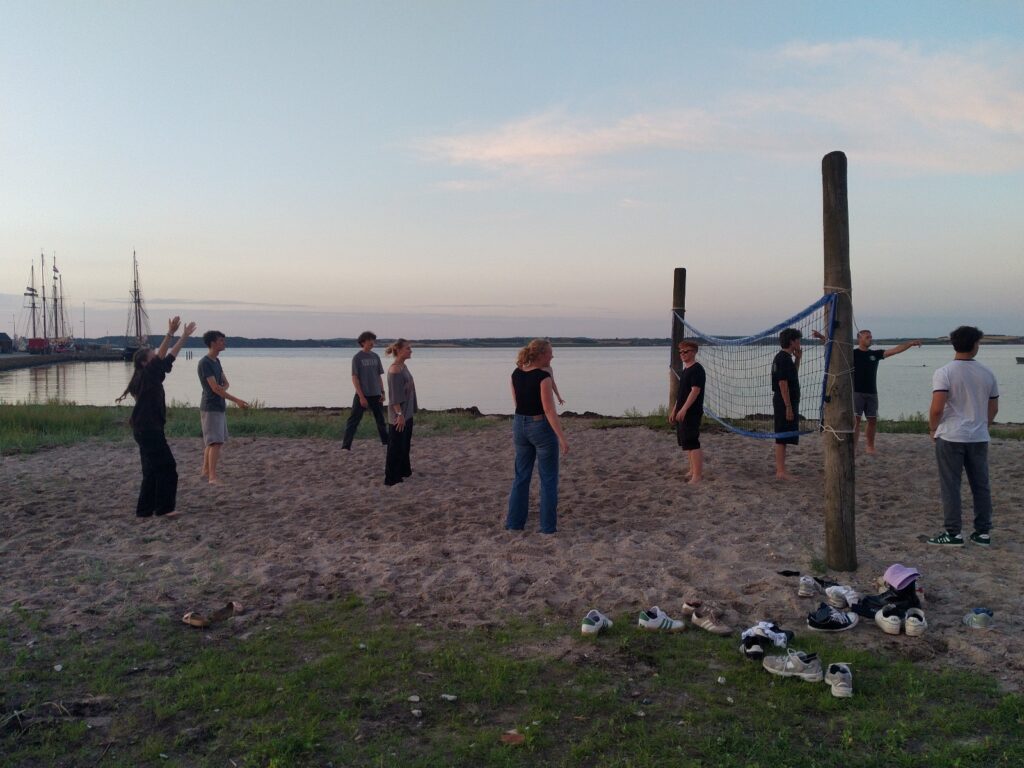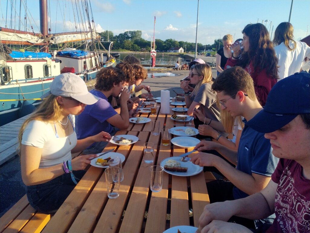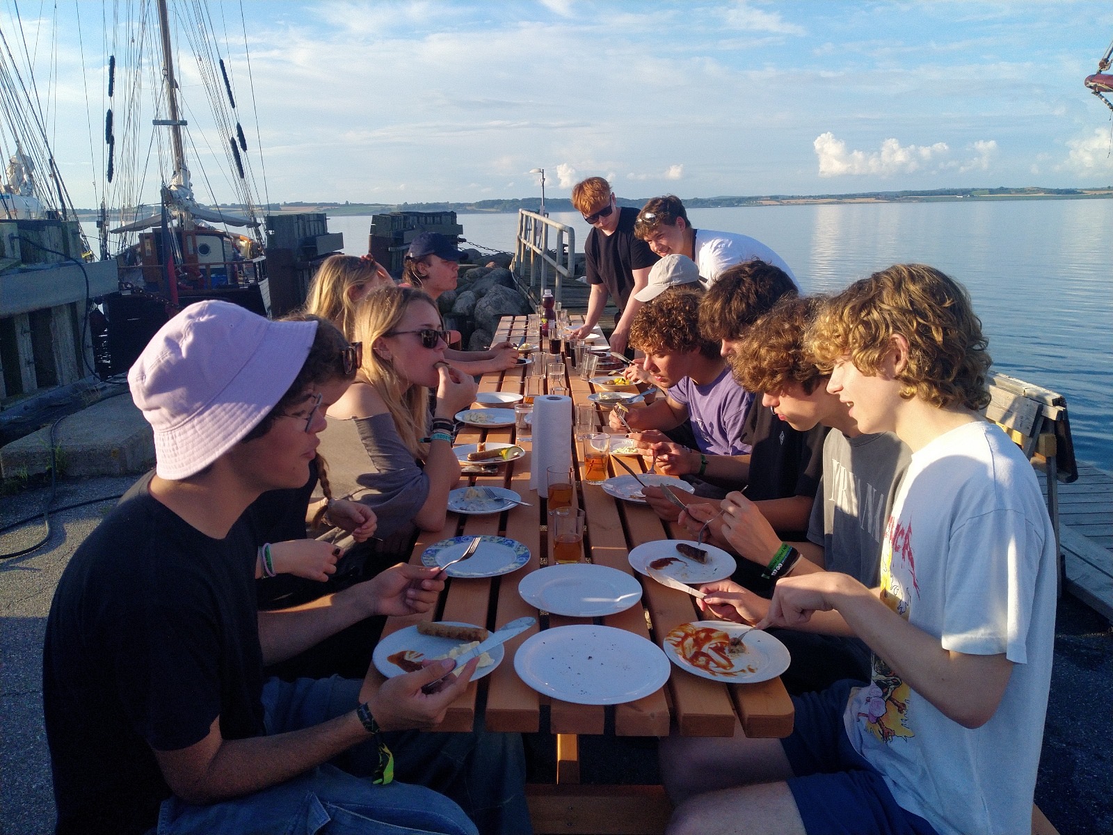 Während der Weg vorhin mehrere Stunden gedauert hatte, legten wir die Strecke nach Mommark in nur einer Stunde zurück. Wir hatten Spaß bei unserem Manöver, viele machten es sich hinten bei dem Kapitän gemütlich und durften das Schiff auch unter seiner Aufsicht steuern. Andere genossen die Aussicht vom Dach des Schiffes. Mommark hatte neben dem kleinen Hafen einen idyllischen Strand mit Steilküste zu bieten und wir genossen die Gemüselasagne am Abend, die unsere Kochgruppe liebevoll zubereitet hatte. Es muss gesagt werden, dass es nicht so einfach ist, für 24 Gäste und die dreiköpfige Schiffscrew zu kochen, und dass unsere Truppe manchmal 2 Stunden in der Küche stand, um alle mit vielfältigen Gerichten zu versorgen.
