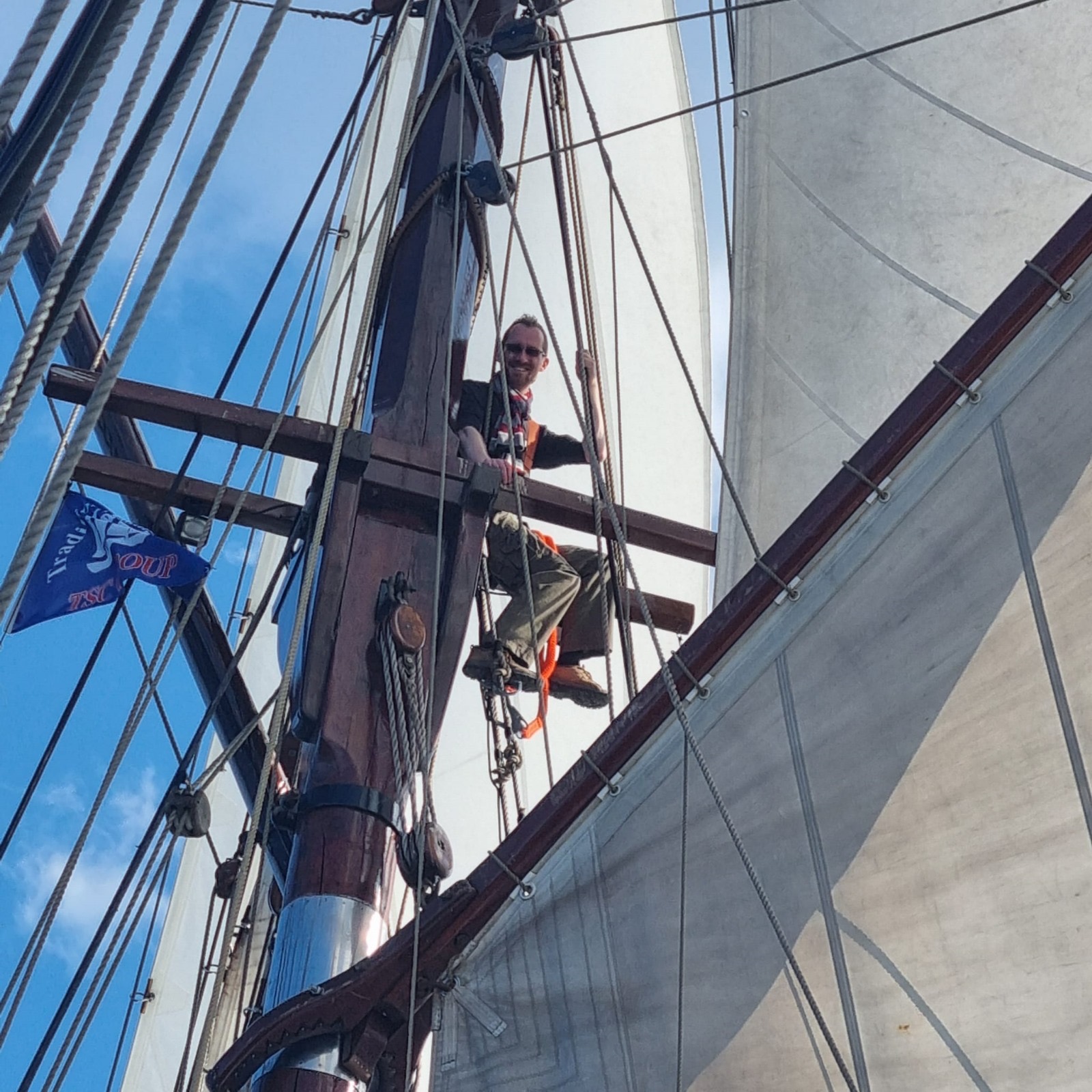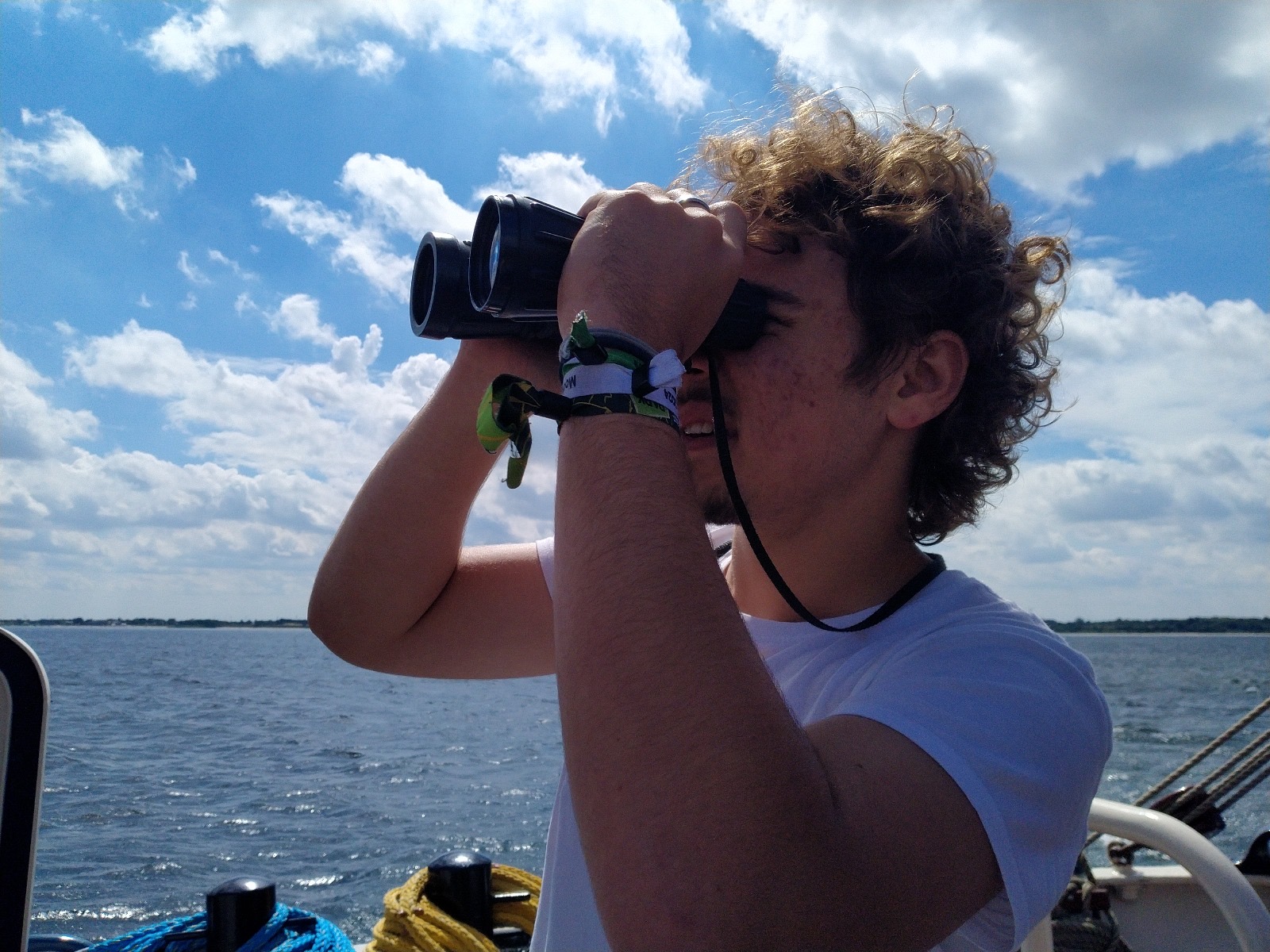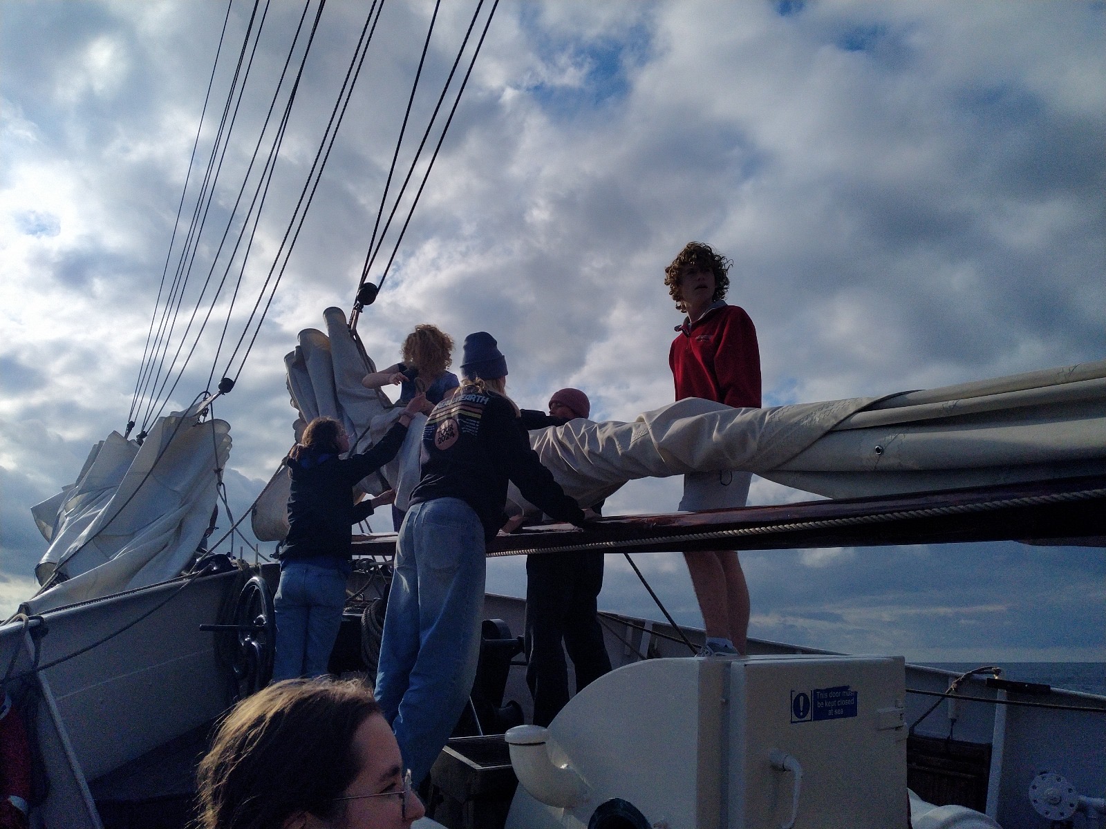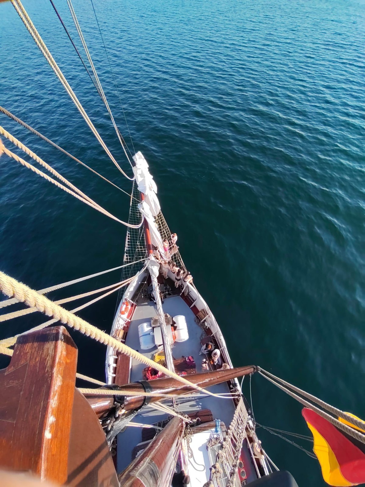 Nach z. T. kalten und bewölkten Stunden klarte der Himmel auf und wir durften nacheinander bei doppelter Sicherung den Mast emporsteigen. Während wir warteten, bis wir an der Reihe waren, spielte Lorenz Gitarre und wir saßen gemütlich beisammen. Die Seile wackelten etwas und die Trittseile wurden immer schmaler, aber von oben ergab sich ein unglaublicher Blick auf das ganze Meer. Zwischen den Segeln beobachteten wir das Schiffstreiben aus vielen Metern Höhe, vom langen Klüverbaum und ihren „Bewohnern“ bis zum Heck, an dem Lex entspannt das Schiff steuerte. Dies war ein einmaliges Erlebnis.