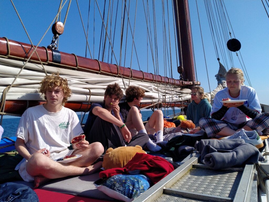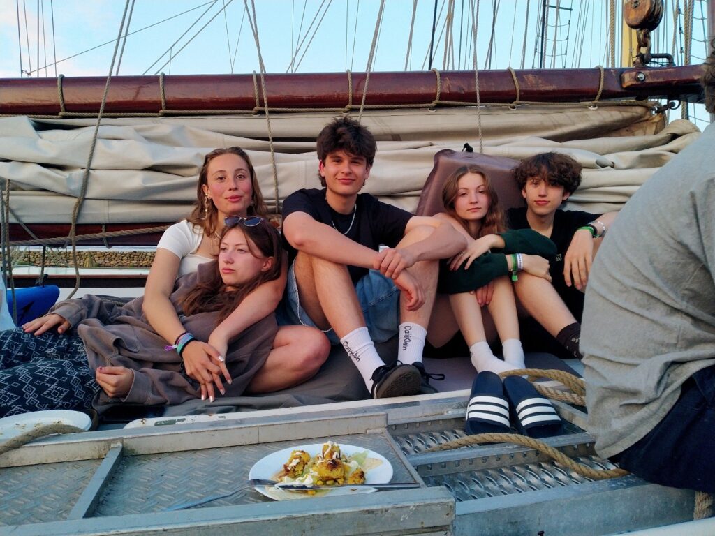 Und dann war schon unser letzter Tag angebrochen. Nach dem letzten Frühstück unter freiem Himmel, nach schönen Gesprächen im Netz und einem letzten Baden vom Schiff fuhren wir unter Segeln in die die Kieler Bucht. Wir waren auf dem Wasser, während an der TMS die Zeugnisse ausgegeben wurden, und einige bekamen ihre Zeugnisse als Foto geschickt. Die letzten Kartoffeln wurden gekocht, wir packten unsere Taschen, putzten und verteilten die übrig gebliebenen Lebensmittel. Als wir um 16 Uhr das Schiff verließen, waren wir müde und glücklich zugleich.