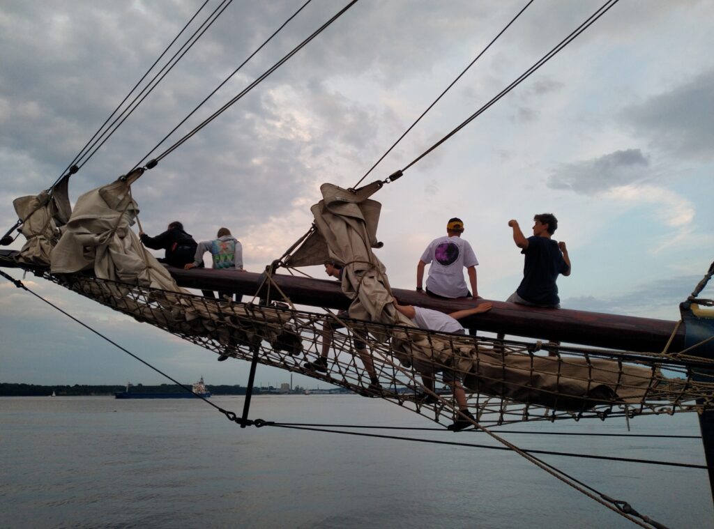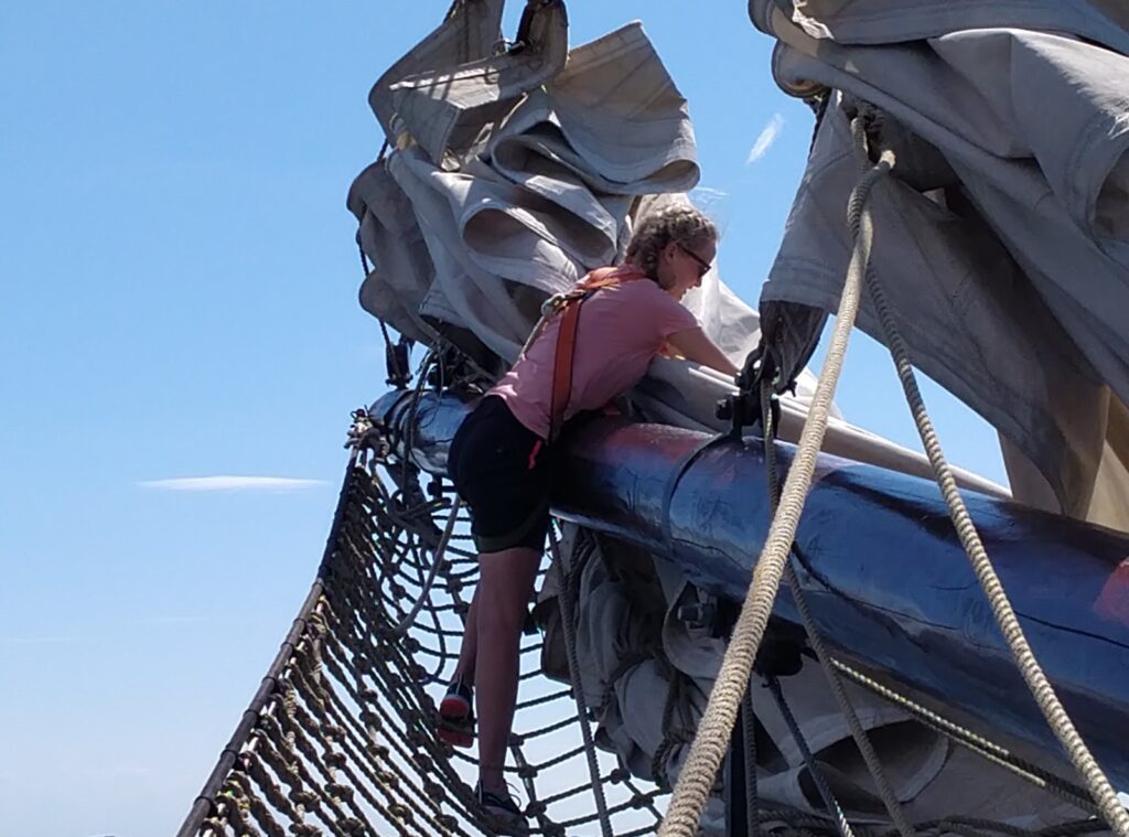Das größte Freiheitsgefühl hatten wir auf dem Klüverbaum mit Blick nach vorne auf die Ostsee heraus. An Gurten gesichert lernten wir, die Klüversegel aus- und einzupacken, spezielle Knoten und Schlaufen zu verwenden – und uns wurde schnell klar, dass wir die meisten der insgesamt acht verwendeten Segel nicht alleine hochziehen konnten. Man konnte sich in die Seile hängen und es rührte sich nichts – bis einige der Männer, groß wie ein Baum und stark wie ein Bär, ihre ganze Kraft hinzugaben.