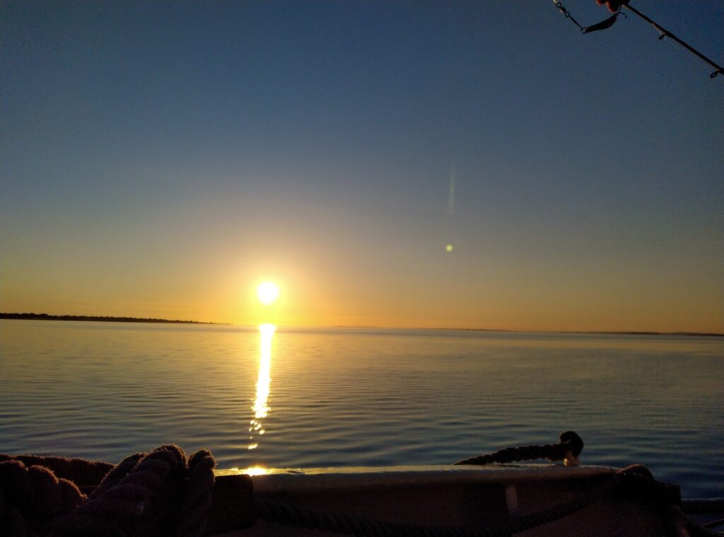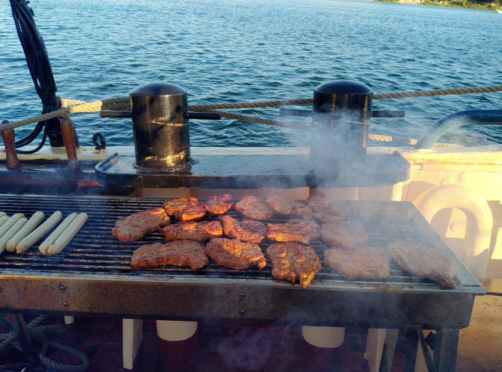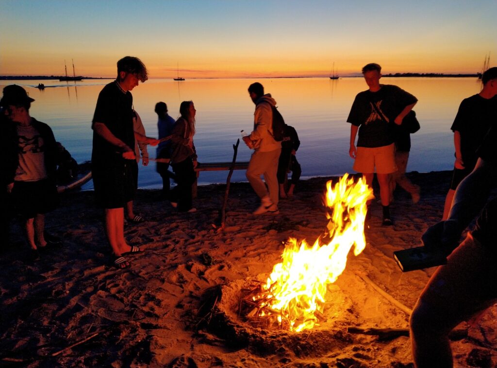 Während einige mit Kajaks um Schiff herumfuhren, bereiteten andere wiederum das Grillen von Bord aus vor, und für uns alle war es ein schöner Abschluss des Tages, mit dem Beiboot Land zu fahren und gemütlich beim Lagerfeuer zusammenzusitzen, während wir den Blick auf unsere Luciana und die anderen großen Segelschiffe schweifen ließen, die für diese Nacht auf dem Meer ankerten und deren nachtschwarze Silhouetten vor dem am Horizont noch rötlichem Himmel aufragten.