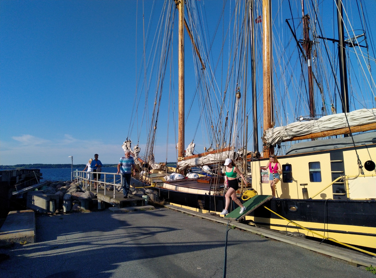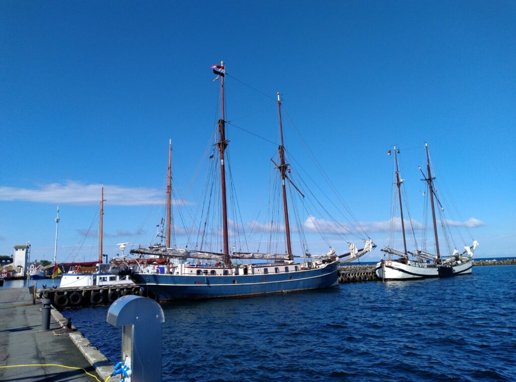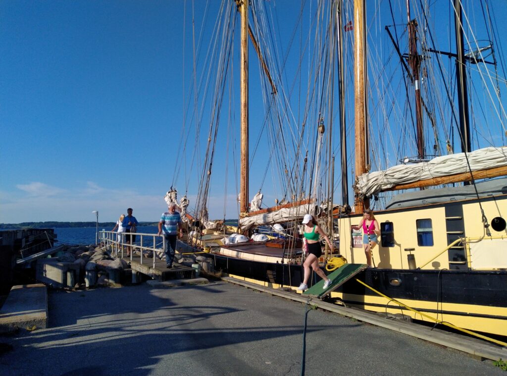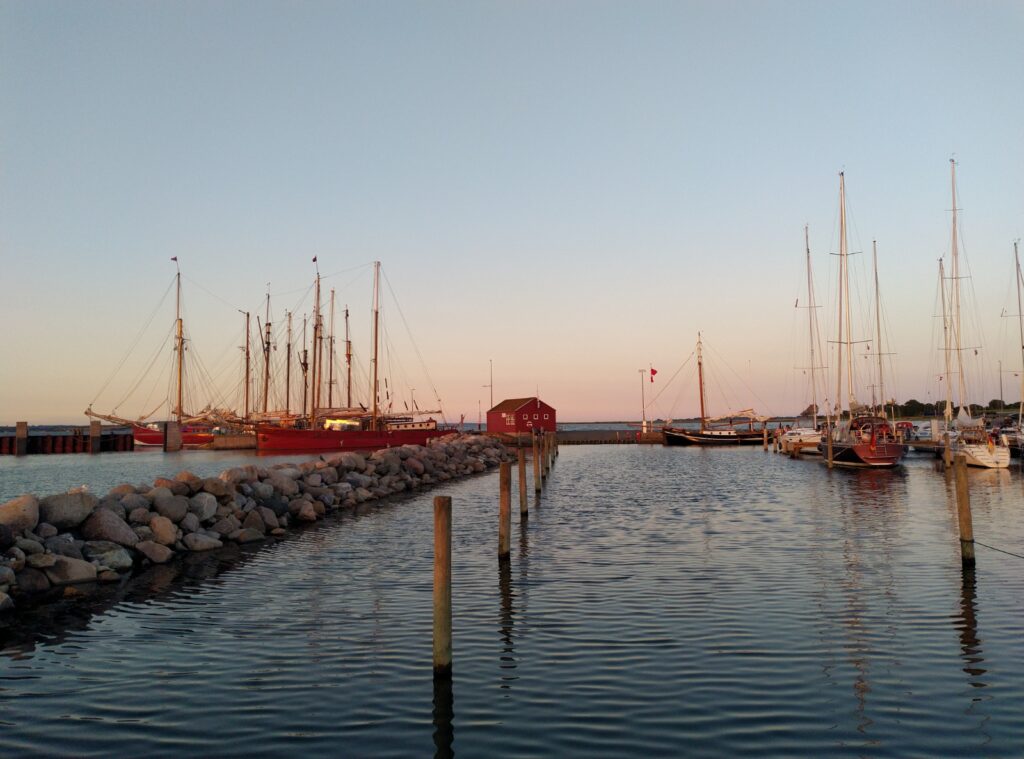 Unsere Fahrt begann mit einer Einführung des Kapitäns Lex, der seine erste Woche als Kapitän mit uns verbringen würde. Der Wind würde schlecht stehen, wir könnten maximal bis Damp fahren. Doch später drehte er und trug uns bis Bagenkop auf der dänischen Insel Langeland, wo wir den idyllischen Hafen erkundeten. Die Masten unseres Schiffs waren bis weit in den Ort hinein zu sehen.