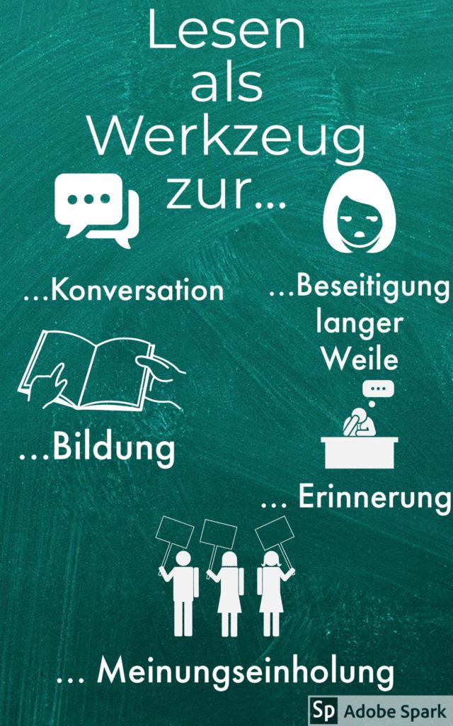 In diesem Zusammenhang entwarfen die Schülerinnen und Schüler Spark Posts am Handy oder am Computer. Dort stellten sie ihren eigenen Zugang zum Thema „Lesen“ dar. Entstanden sind individuelle und auch sehr persönliche Produkte.