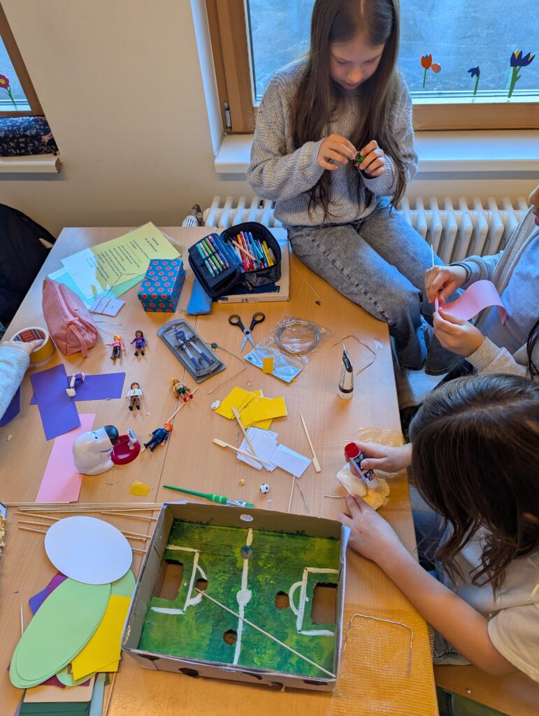Besonderes Bastelgeschick bewies die Gruppe, die einen eigenen „Mathe-Kicker“ entworfen hat. Sobald der Ball ins Loch fällt, gibt das richtige Beantworten der Aufgaben Punkte. Das Publikum auf der Tribüne feuert an 😉