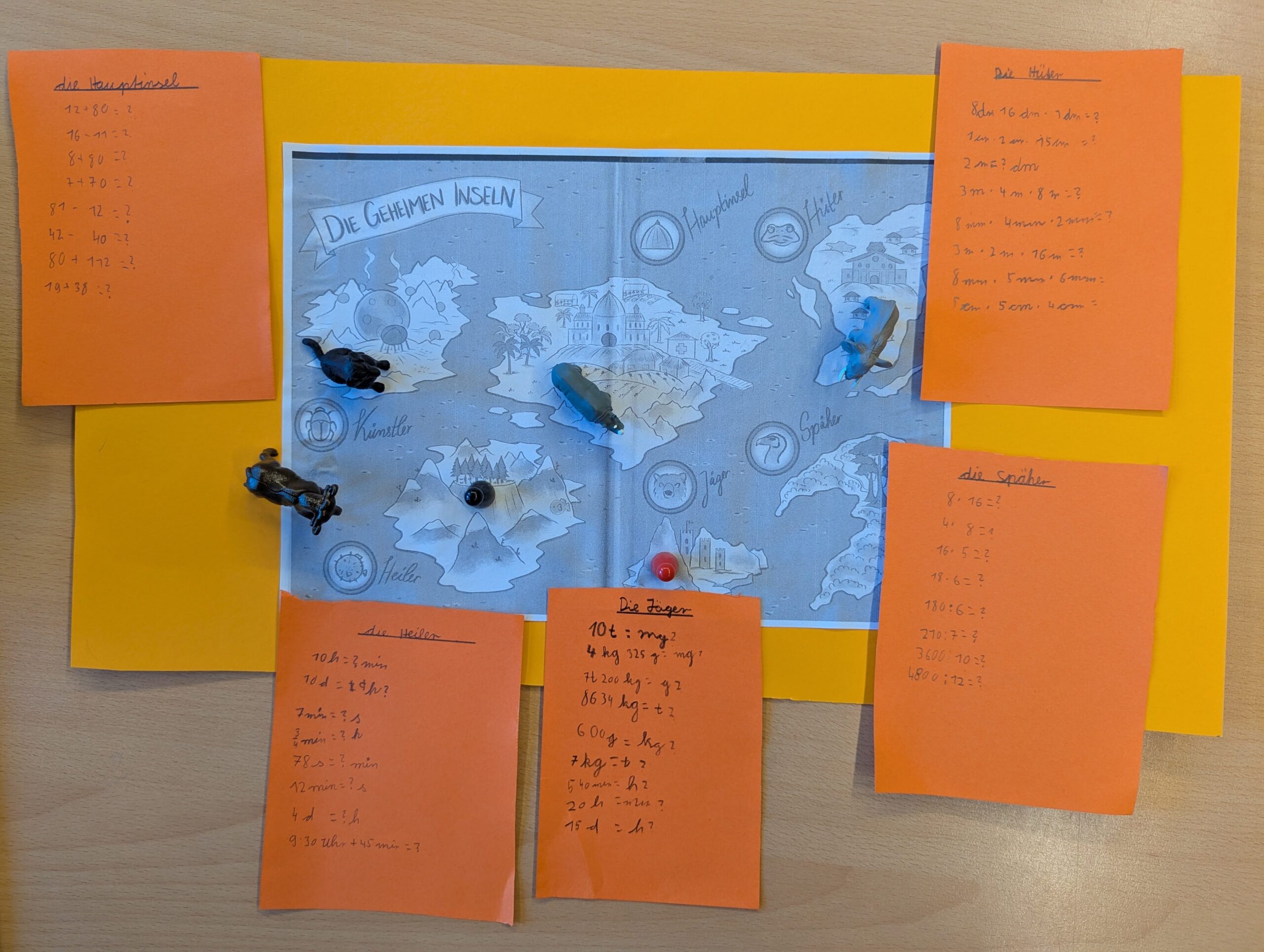 Bei „Mathe-Monopoly“ und beim „Milliardärspiel“ hingegen kann durch schnelles und richtiges Umrechnen verschiedener Einheiten Geld erworben werden. Wer im Memory gut ist, kann beim „Mathe-Memory“ punkten – vorausgesetzt die Umrechnungszahlen bei Volumen- Flächen- und Längeneinheiten sind verinnerlicht. Die Feldfarbe gibt beim Spiel „2er-lei Mathe“ die Größe vor, zu der Aufgaben beantwortet werden müssen. Beim „Inselspiel“ legt die Insel das jeweilige Themengebiet fest.