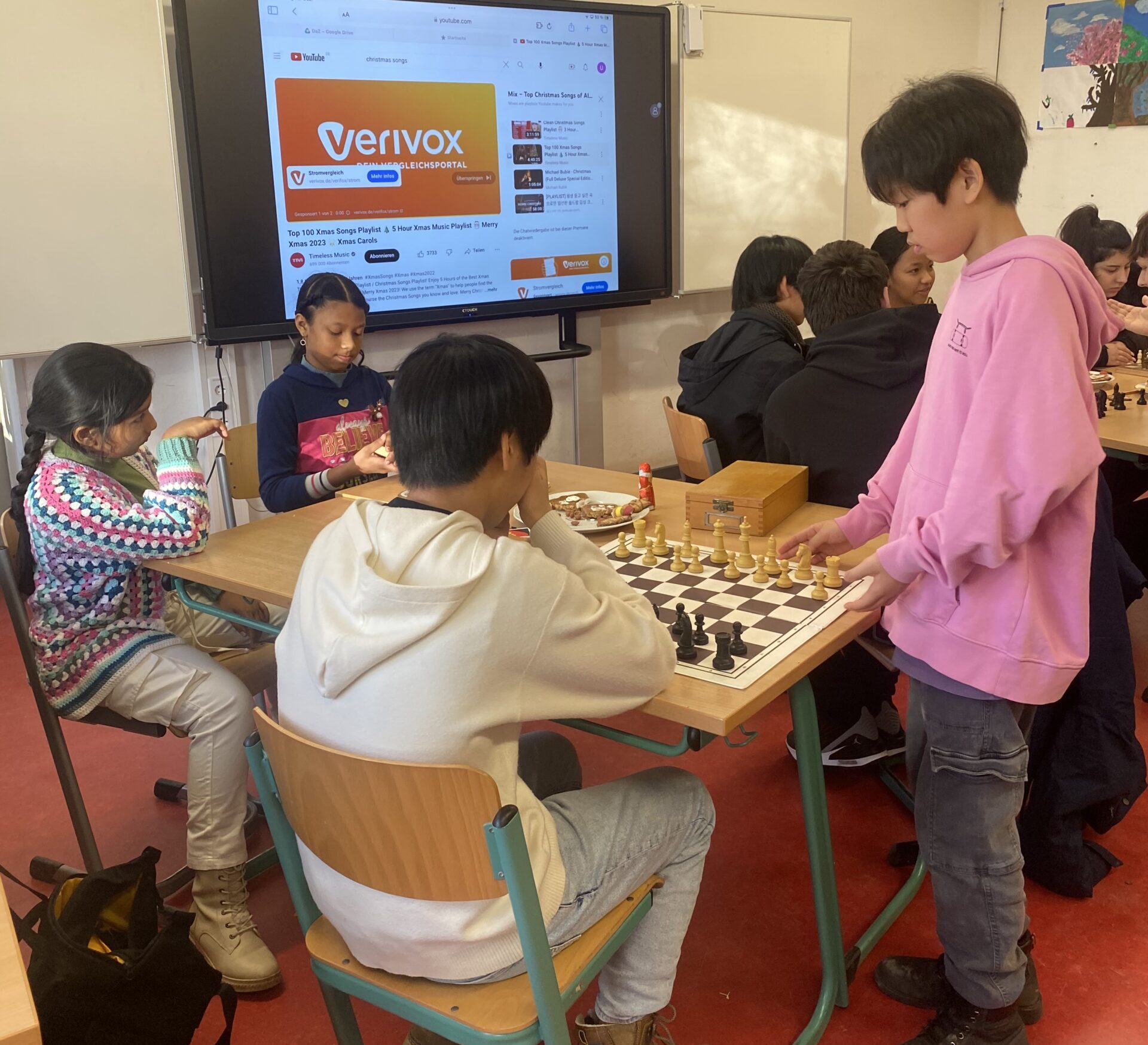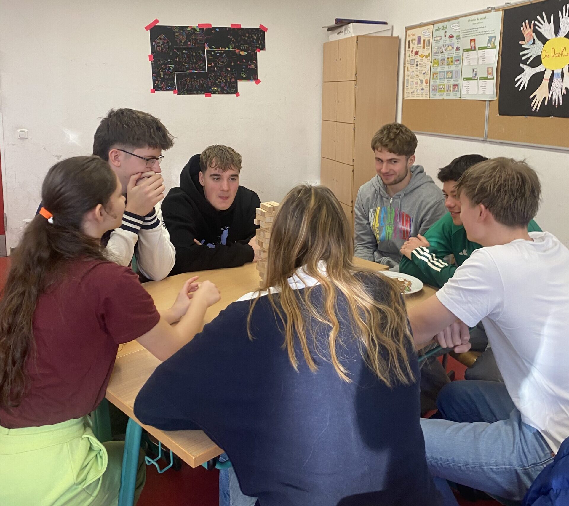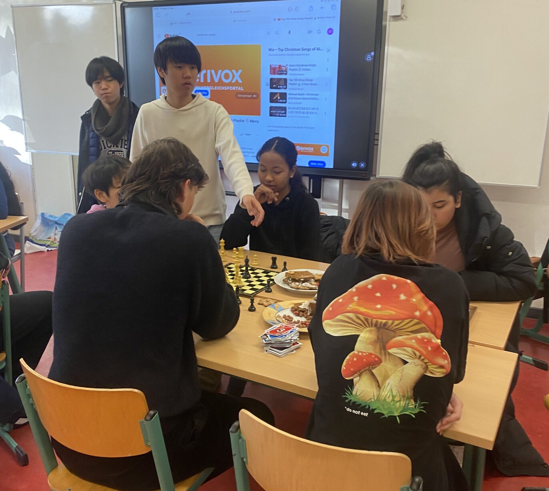 Die Schülerinnen und Schüler aus der Basisklasse erhielten am Tag vor den Weihnachtsferien Besuch vom Wipo-Profil des Abiturjahrganges. Bei Adventsgebäck und Tee hatten alle Spaß an Gesellschaftsspielen. Bei Schach, Jenga-, Memory- und Mensch-ärgere-dich-nicht war das Eis schnell gebrochen und unsere internationalen Schüler konnten ihre erworbenen Deutschkenntnisse erproben.