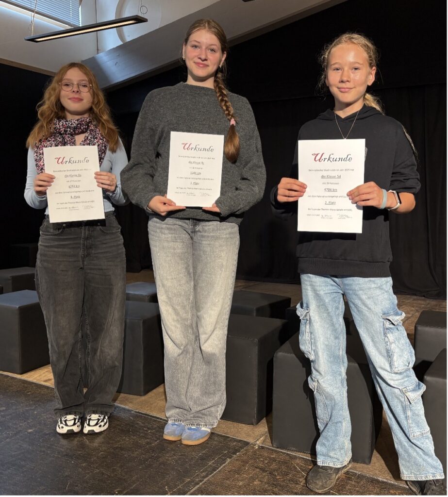 Elisabeth, Johanna und Lale nahmen stellvertretend für die erfolgreichsten Klassen die Urkunden entgegen.