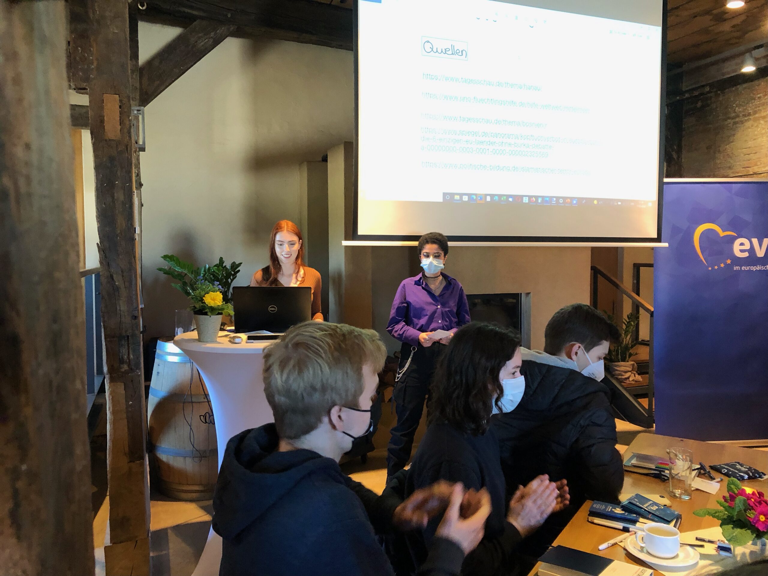Nun gab es noch einen zweiten Impulsvortrag von Schülerinnen der Thomas-Mann Schule über die Gründung der EU und die Probleme, die sich ihr heute in den Weg stellen. Zum Schluss formulierten die Schülerinnen auch noch Forderungen für die Zukunft an die Politik.
