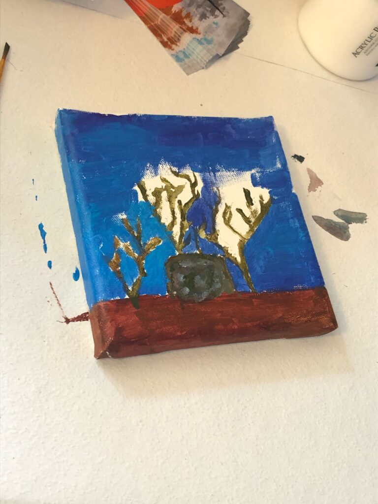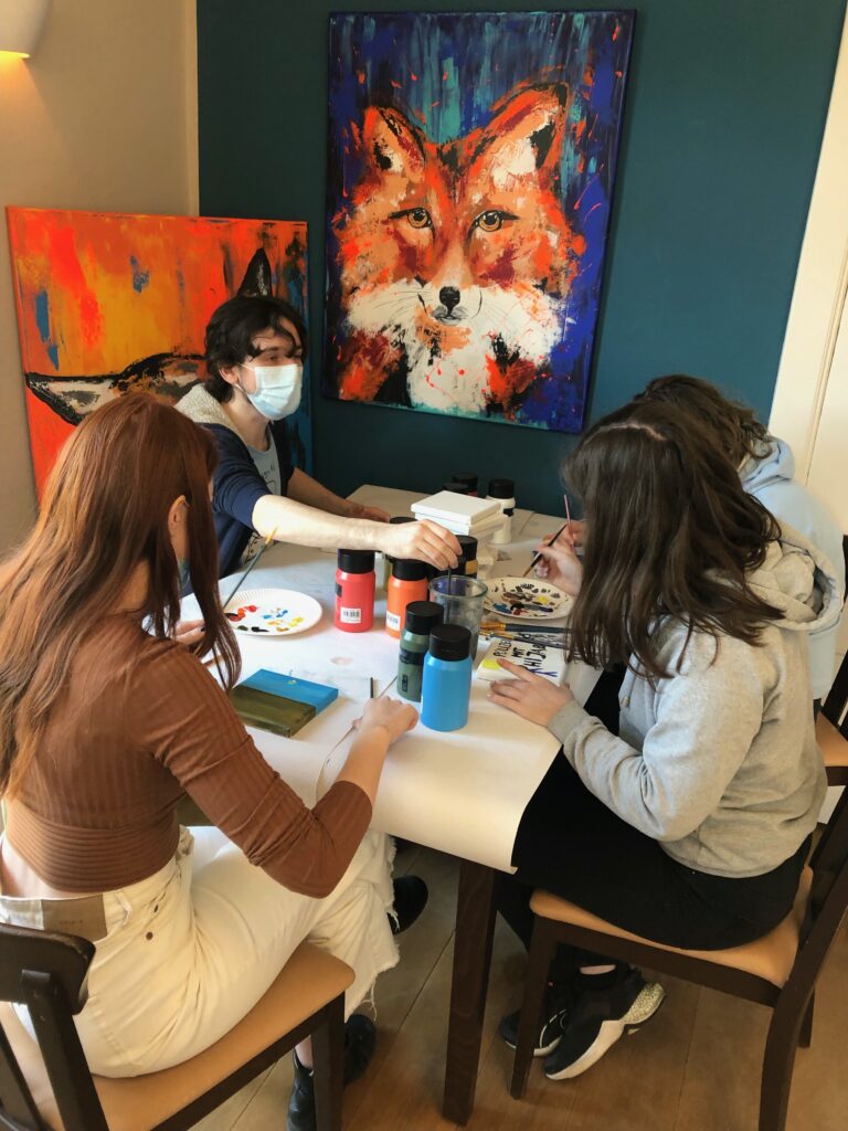 Währenddessen wurden einige Schüler*innen in einen Nebenraum geführt. Die Zeit neigte sich dem Ende zu und es gab noch ein Projekt, zu welchem die Anwesenden beitragen sollten: Jede*r sollte eine kleine Leinwand mit Wünschen für Europas Zukunft bemalen. Diese sollen als Collage im Büro von Niclas Herbst aufgehängt werden. Das haben aus zeitlichen Gründen nicht mehr viele Schüler*innen geschafft, die Ergebnisse waren aber dennoch sehr bunt.