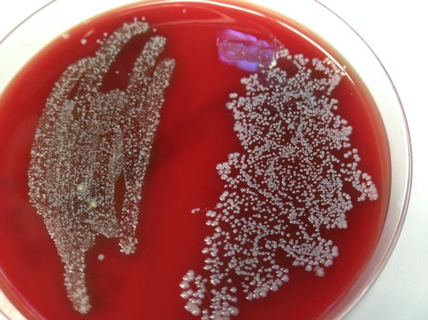 Bakterienkolonien wachsen auf einer roten Blut-Agarplatte: links Abstrich aus der Mundhöhle, rechts Abstrich hinter dem Ohr