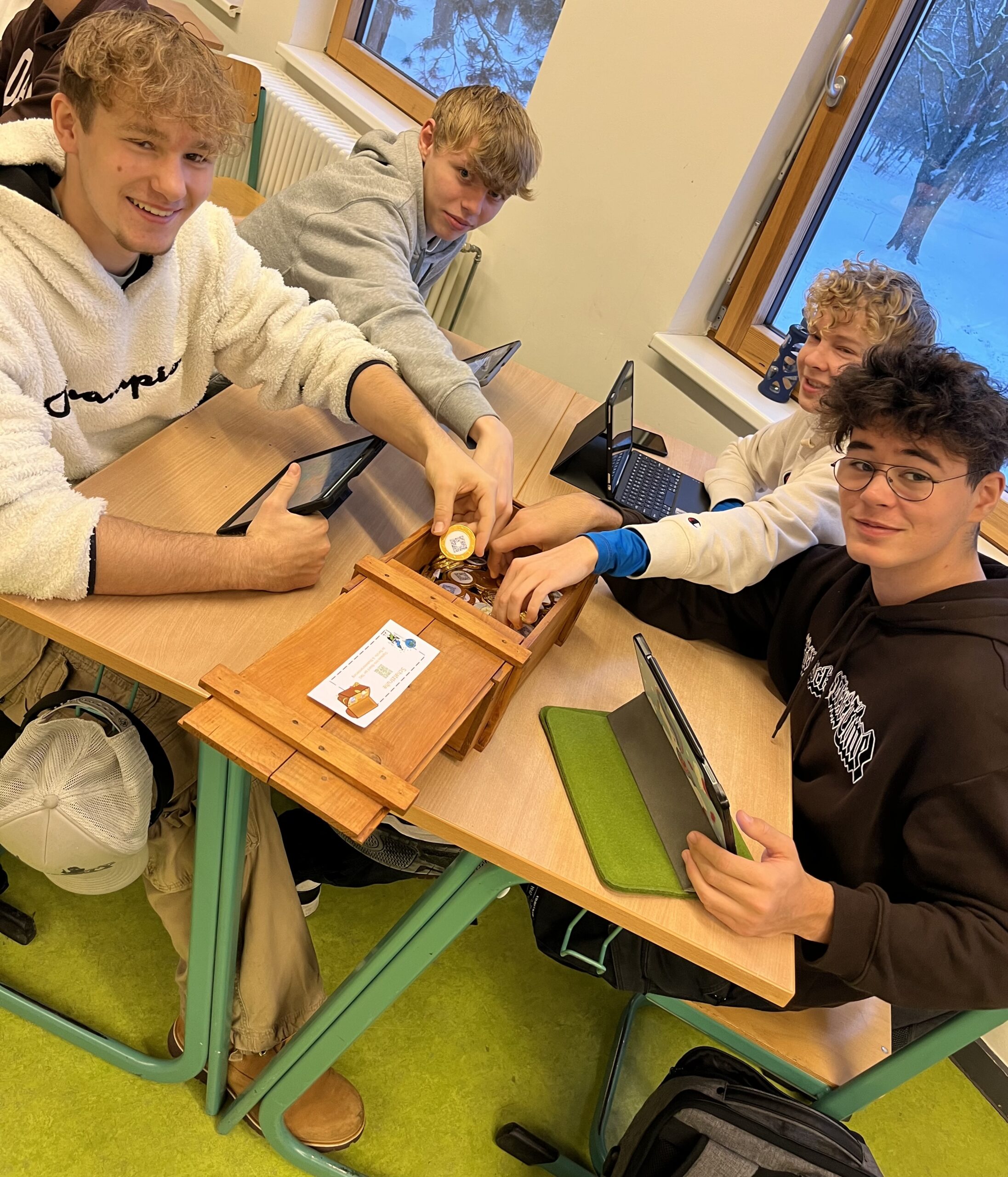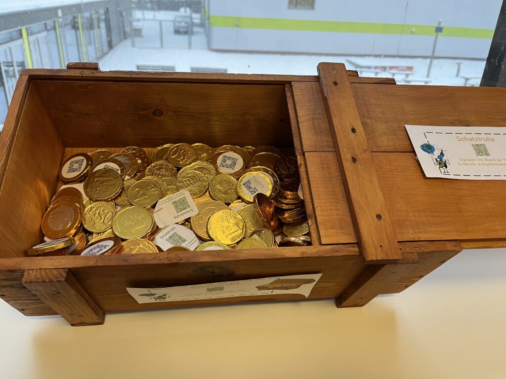 Die Taler sind nämlich beklebt mit einem QR-Code, der zu unserem Digitalen Schwarzen Brett zur Berufsorientierung, unserer „Schatzruhe“, führtDiese feiert nun ihr einjähriges Bestehen und wird von den Schüler:innen der Oberstufe gut angenommen.