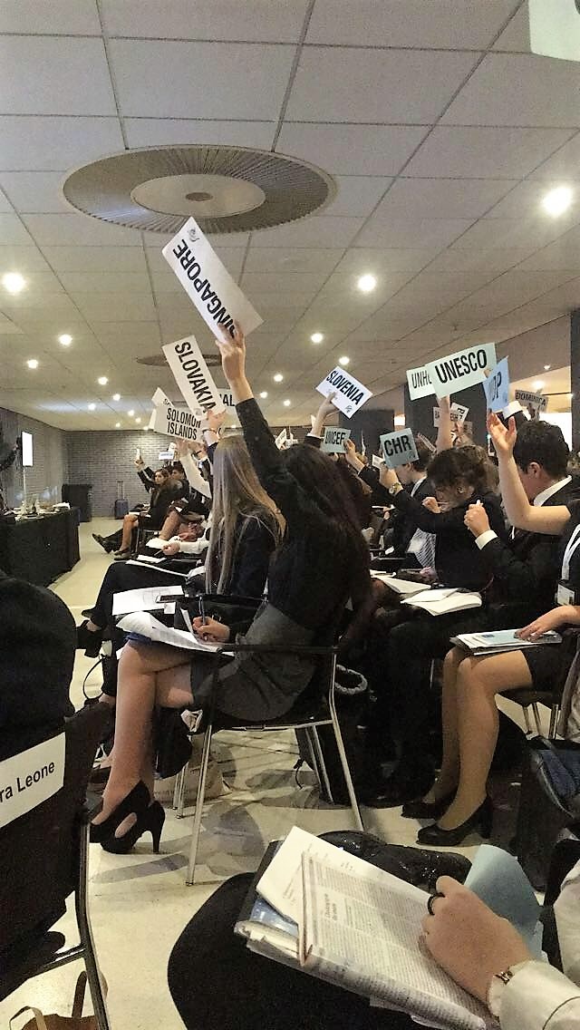 Am Dienstag begannen wir um 9 Uhr mit den Opening Speeches, bei denen einige Vertreter einiger Länder in ihren Foren jeweils kurze Einführungen in die Politik ihres Landes gaben. Im Anschluss daran fingen die Debatten an: Je bei einer Resolution wurde in Plenardebatten das Für und Wider abgewogen und die erarbeiteten Resolutionen bei der schließenden Abstimmung entweder verabschiedet oder verworfen. Gegen 17 Uhr endete der Debattentag für uns.