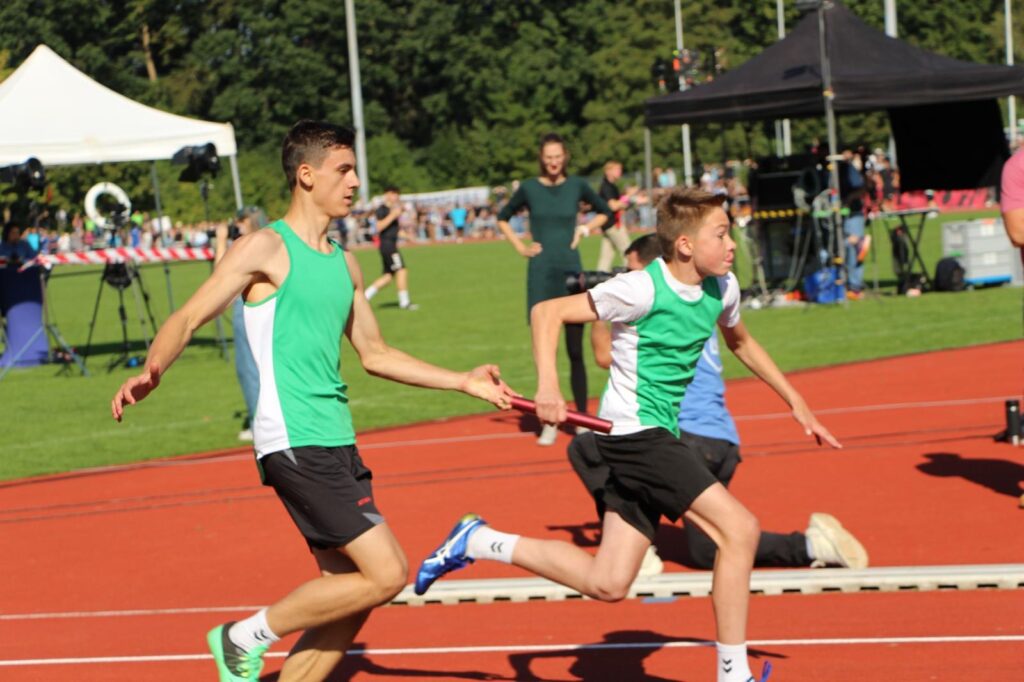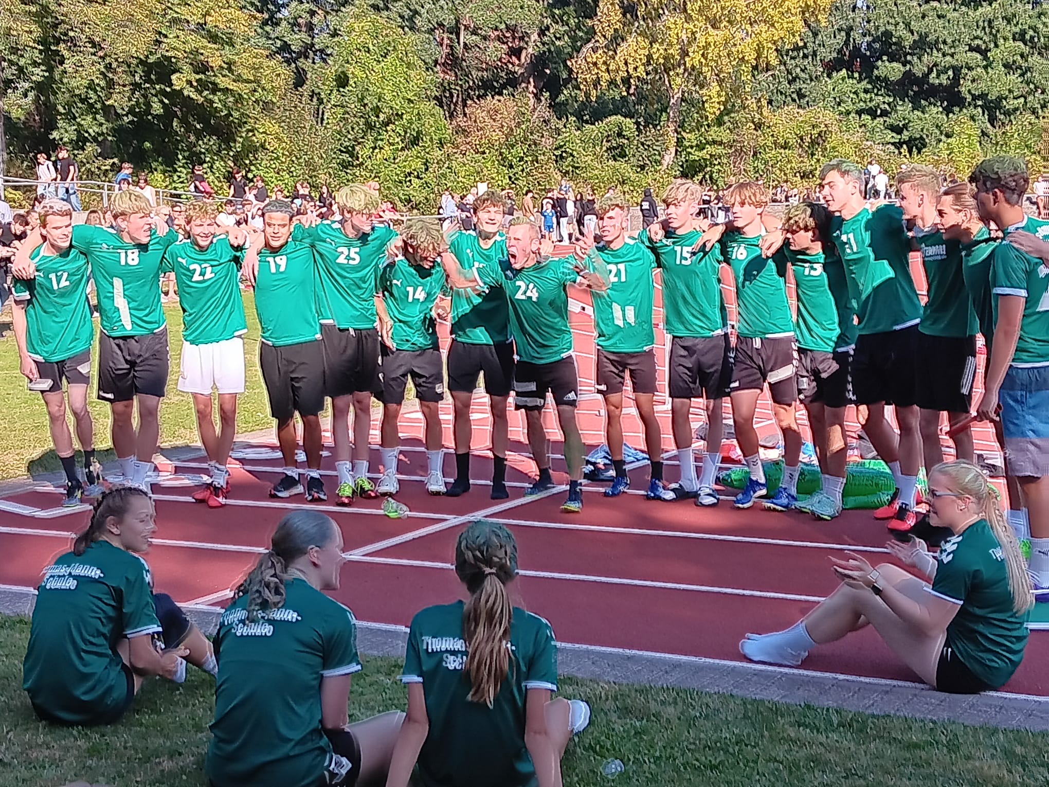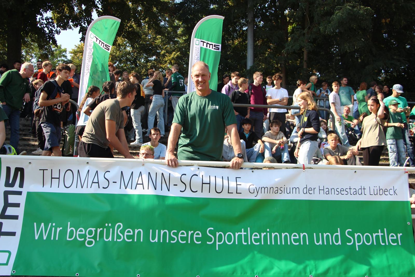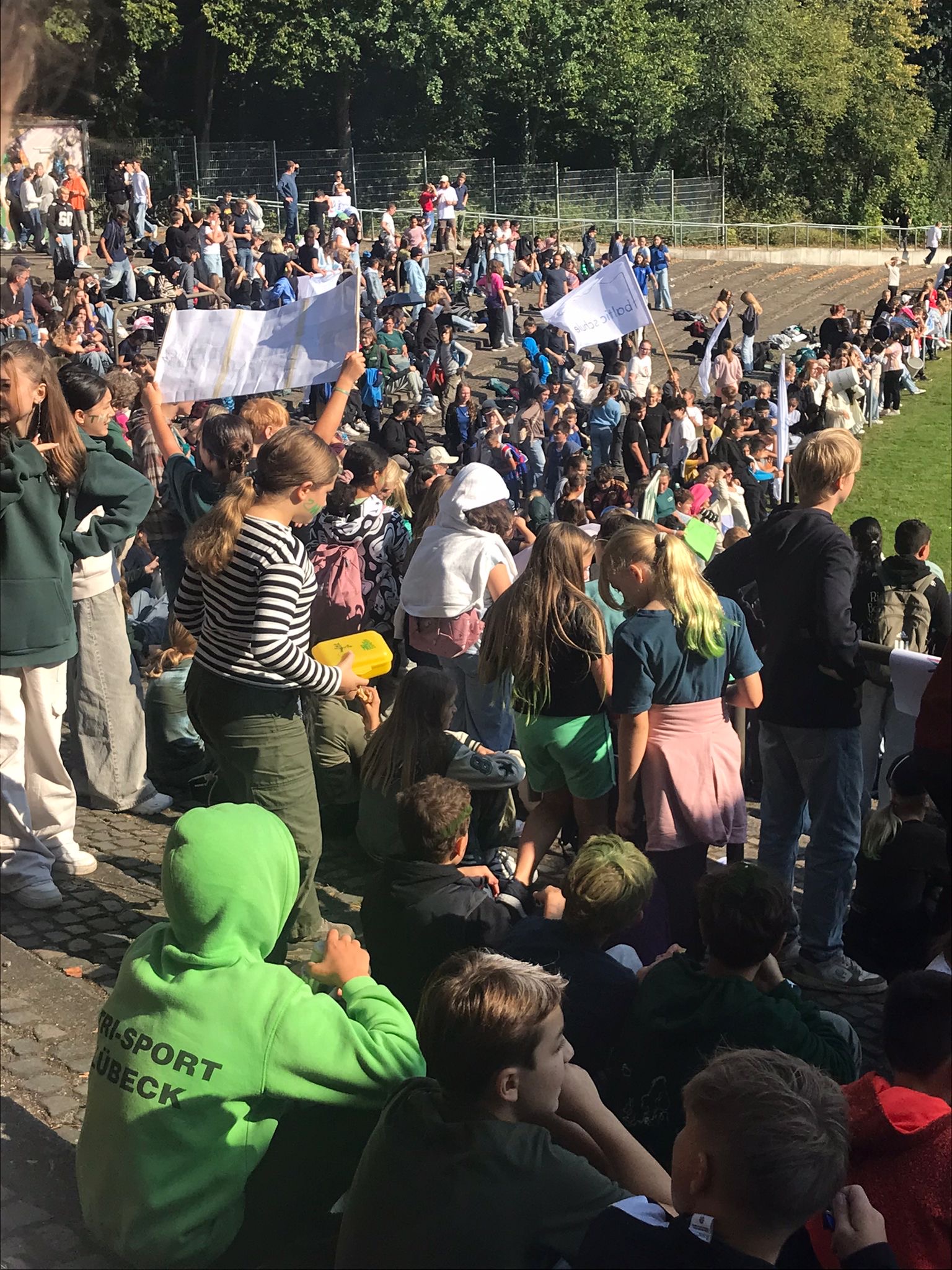 Wir schreiben Freitag, den 20.9.24. Die Sonne brennt heiß auf die Köpfe der Schüler aller Lübecker Schulen. Eine Menge aus grün-weiß geschminkten und gekleideten Jugendlichen und Lehrkräften wartet gespannt in der TMS-Fankurve. Kein Windstoß geht, alle halten den Atem an und starren gebannt auf die Bahnen. Da ertönt das Startsignal. Die Läuferinnen und Läufer schießen förmlich nach vorn und sprinten los. Das Publikum tobt. „TMS, TMS!“, schallt es aus Hunderten von Kehlen.