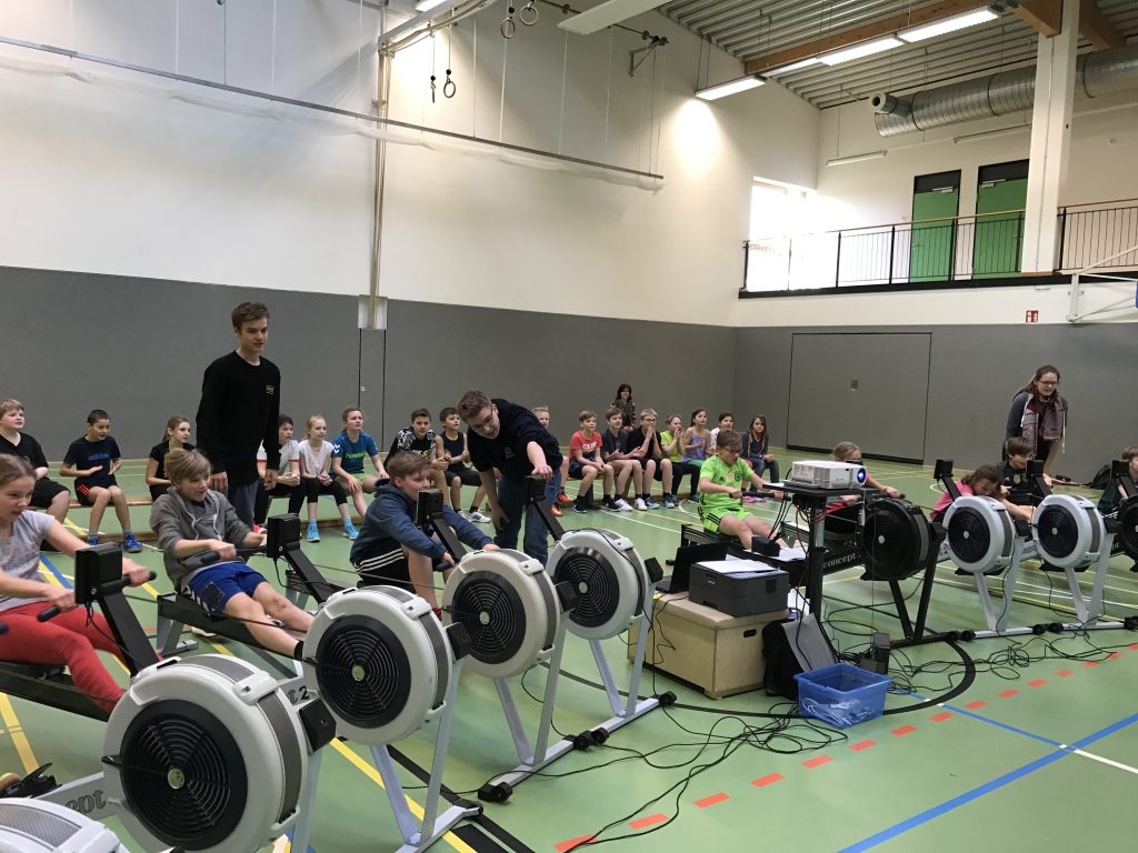 Zum achten Mal hat der Deutsche Ruderverband mit der Aktion „ Rudersport in der Schule – gemeinsam noch stärker“ alle 5. und 6. Klassen deutschlandweit zum Ergometer-Wettbewerb aufgerufen. Lasse Pichner, Abiturient der TMS im vergangenen Jahr, absolviert sein freiwilliges soziales Jahr in der Lübecker Rudergesellschaft und trat mit einem neuen Konzept an: Statt die Klassen in die LRG wandern zu lassen, verlud er die „Trockenrudergeräte“ und baute sie in den acht Schulen wieder auf, die sich angemeldet hatten. Dadurch sparten sich die Klassen den Weg in die LRG, und es beteiligten sich alle Orientierungsstufenklassen der entsprechenden Schulen, also über 1 200 Jugendliche.