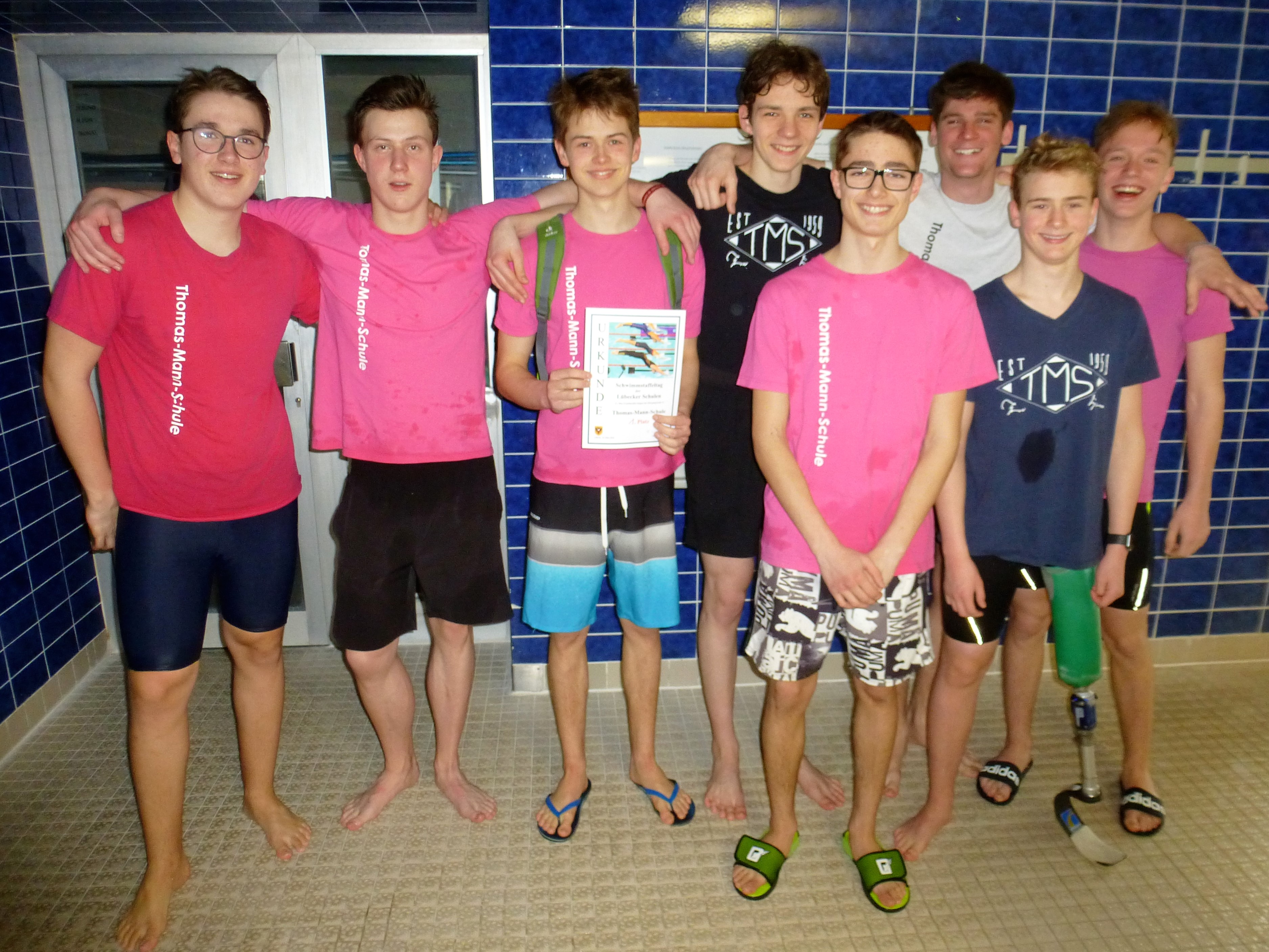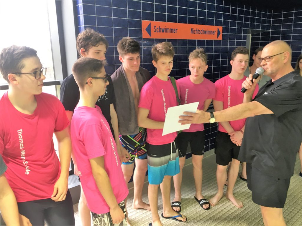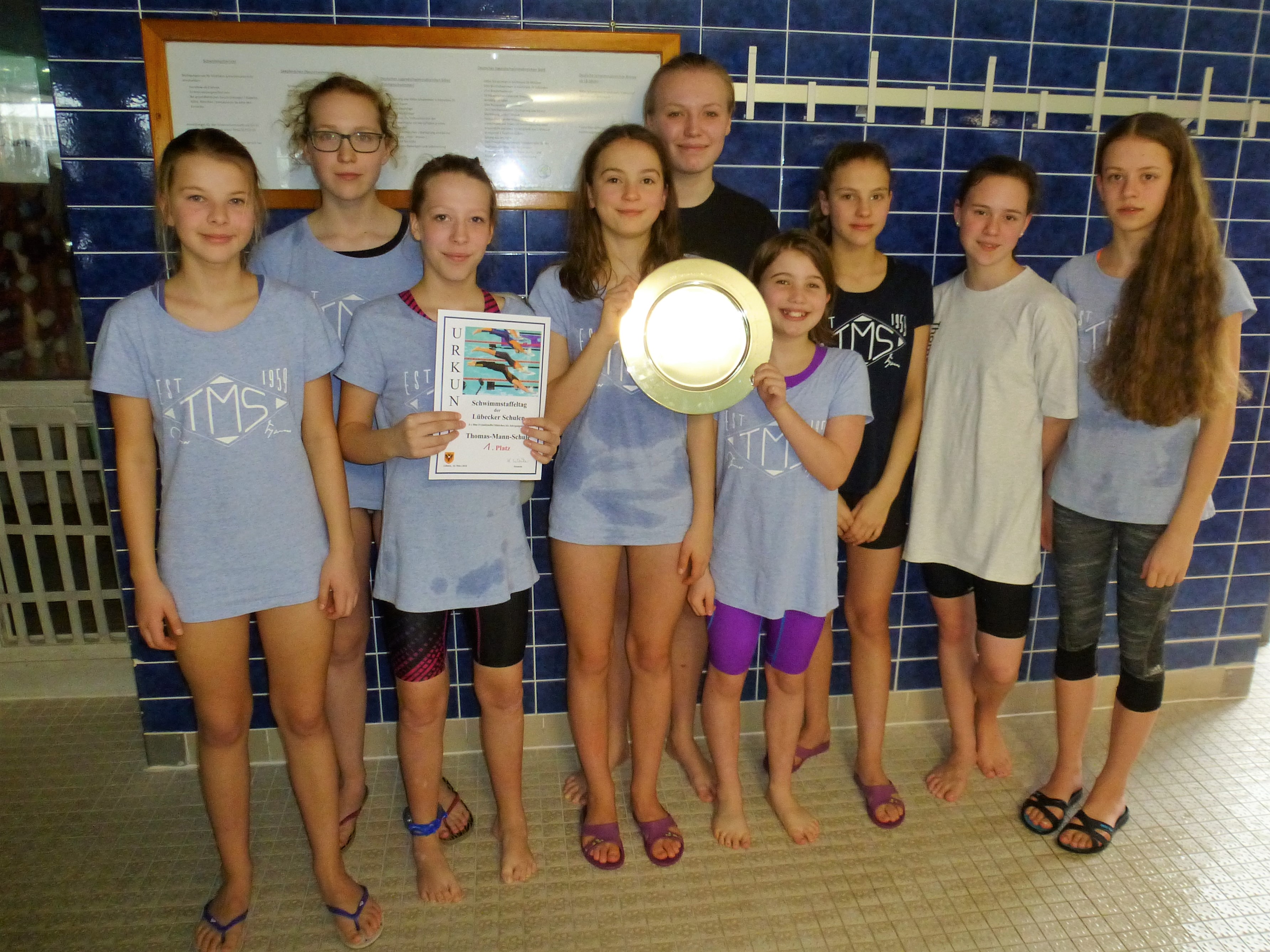 Am Freitag, den 16. März 2018 traten sechs Mannschaften der Thomas-Mann-Schule beim Staffeltag in der Schwimmhalle in der Ziegelstraße gegen die anderen Lübecker Schulen an. Nach den Wettkämpfen für die Grundschulen begannen die Mädchen der Klassenstufen 5 und 6. Sie mussten 8 x 25m Freisteil schwimmen. Je vier ziemlich aufgeregte Fünft- und Sechstklässlerinnen gingen für uns an den Start und erschwammen einen guten fünften Platz. Herzlichen Glückwunsch an Carlotta, Jil, Melina, Liza, Emma, Johanna, Tessa und Ida (und an die Ersatzschwimmerinnen Alina, Jana und Johanna)!