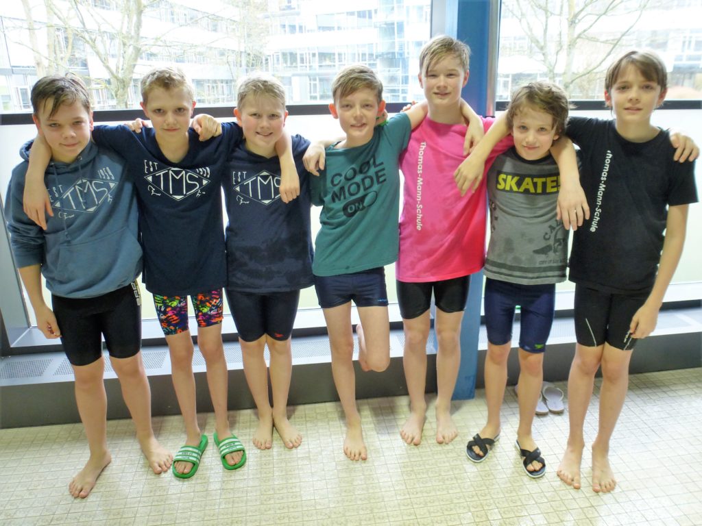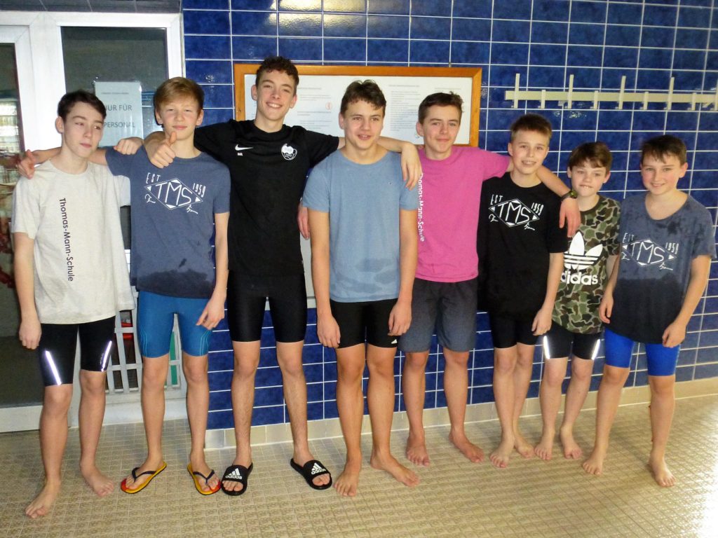 Die Jungen derselben Altersgruppen gingen krankheitsgeschwächt an den Start und beendeten ihren Wettkampf auf Platz fünf. Auch hier ist sicherlich noch Luft nach oben, denn die Mannschaft bestand aus zwei Sechst-, drei Siebt-, zwei Acht- und nur einem Neuntklässler – in den nächsten Jahren schwimmt dieses Team sicher weiter vorn mit. Ein großes Lob an Maxi, Maximilian, Paul, Jonas, Magnus, Tom, Marco und Raul (und an den Ersatzschwimmer Nico)!
