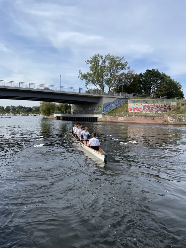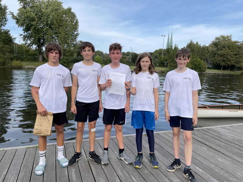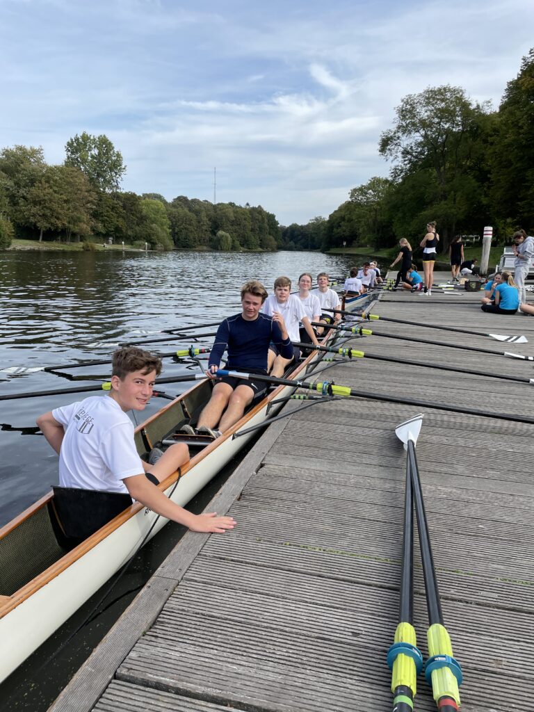 Als nächstes Team startete unser Jungen-Gig-Doppelvierer mit Steuermann (Max, Ole, Linus, Teja, Stm. Julius) und bewältigte die 6 km Strecke in 30:03 Min., eine hervorragende Leistung. Sie erlangten mit dieser Zeit den 1. Platz vor dem Boot des Burckhardt-Gymnasiums!