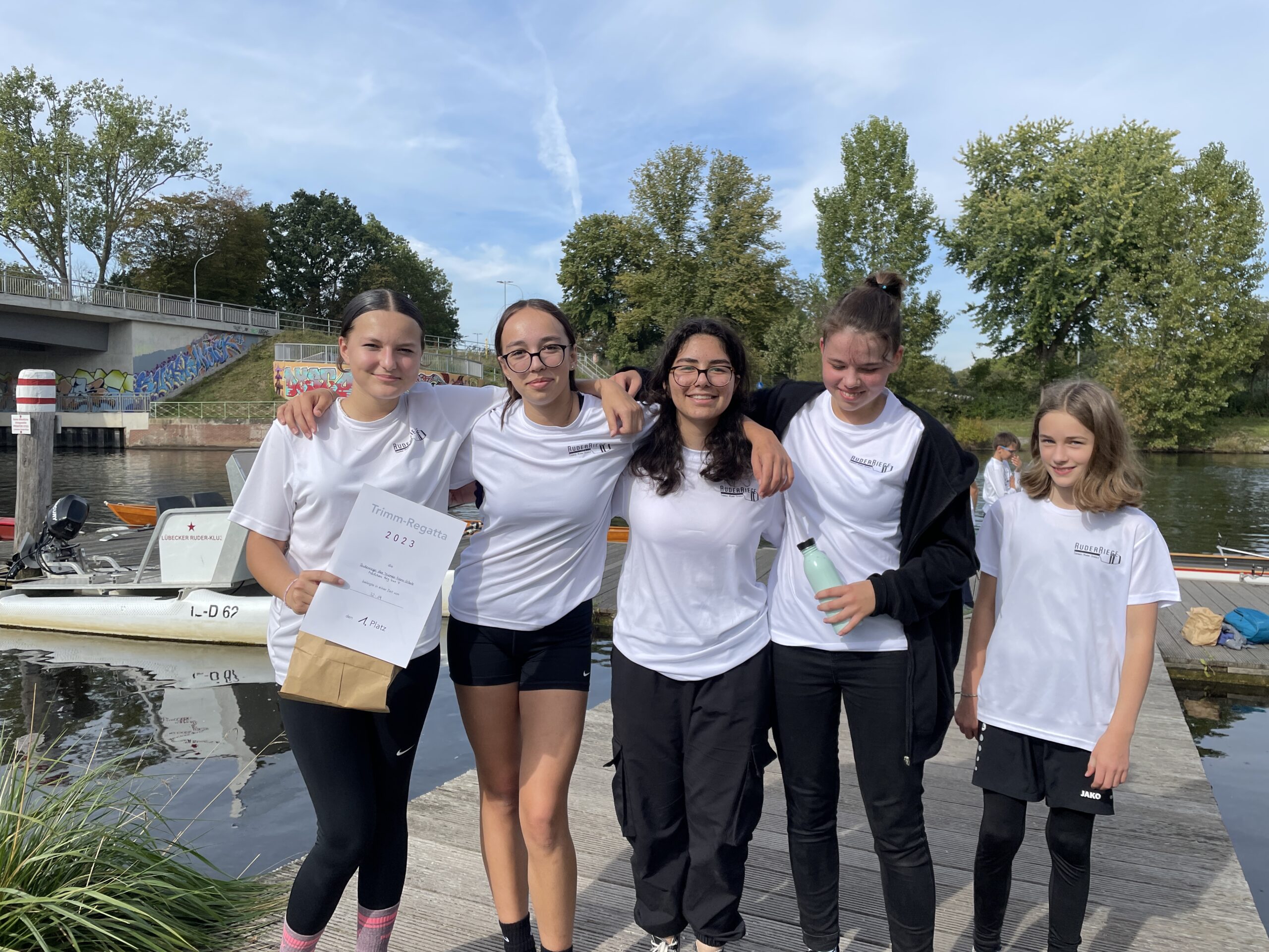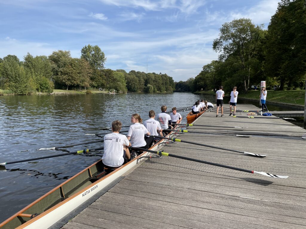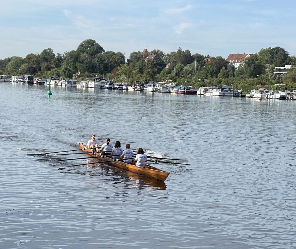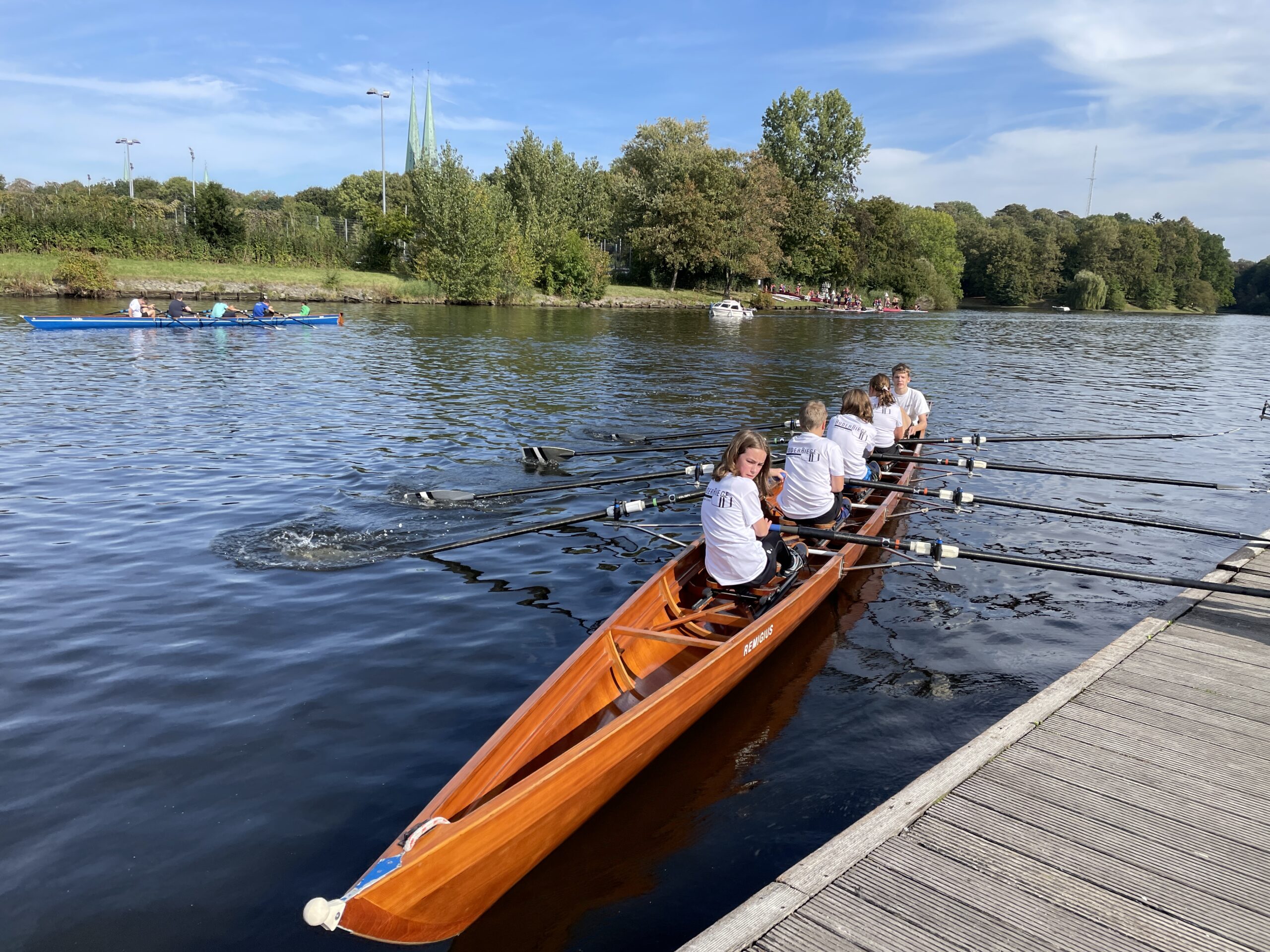 Der Mädchen-Gig-Doppelvierer mit Anna Lena, Charlotte, Ela und Heidi, gesteuert von Lotta, legten einen guten Start ab, wurden dann unter der Puppenbrücke durch andere Wassersportler behindert und kamen trotzdem mit einer guten Zeit von 32:19 Minuten durchs Ziel und belegten gemeinsam mit dem Boot vom Katharineum den 1. Platz.